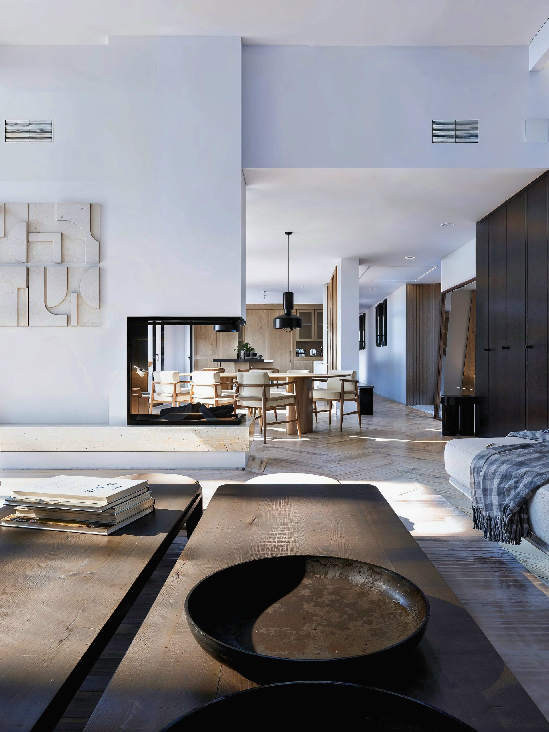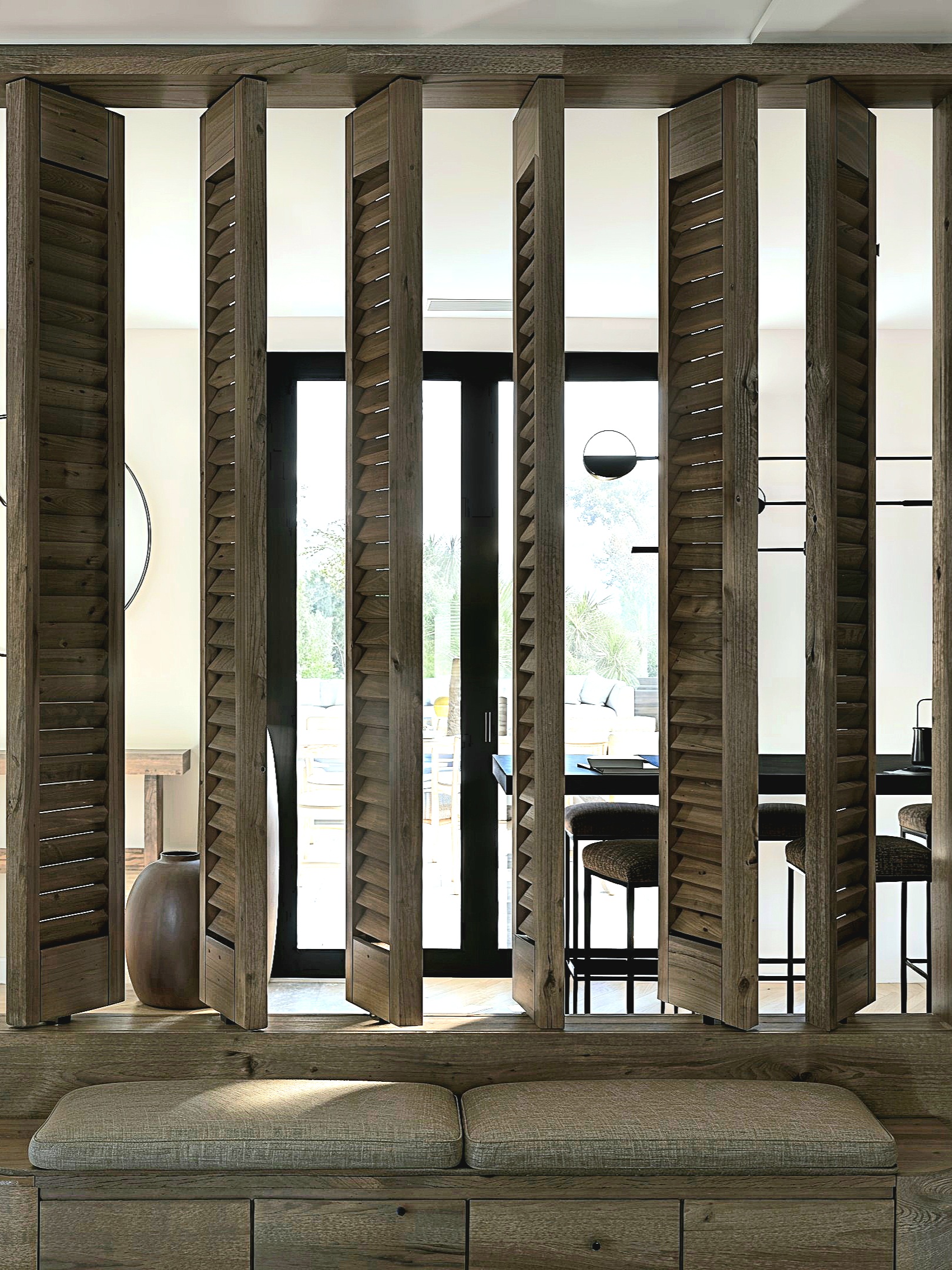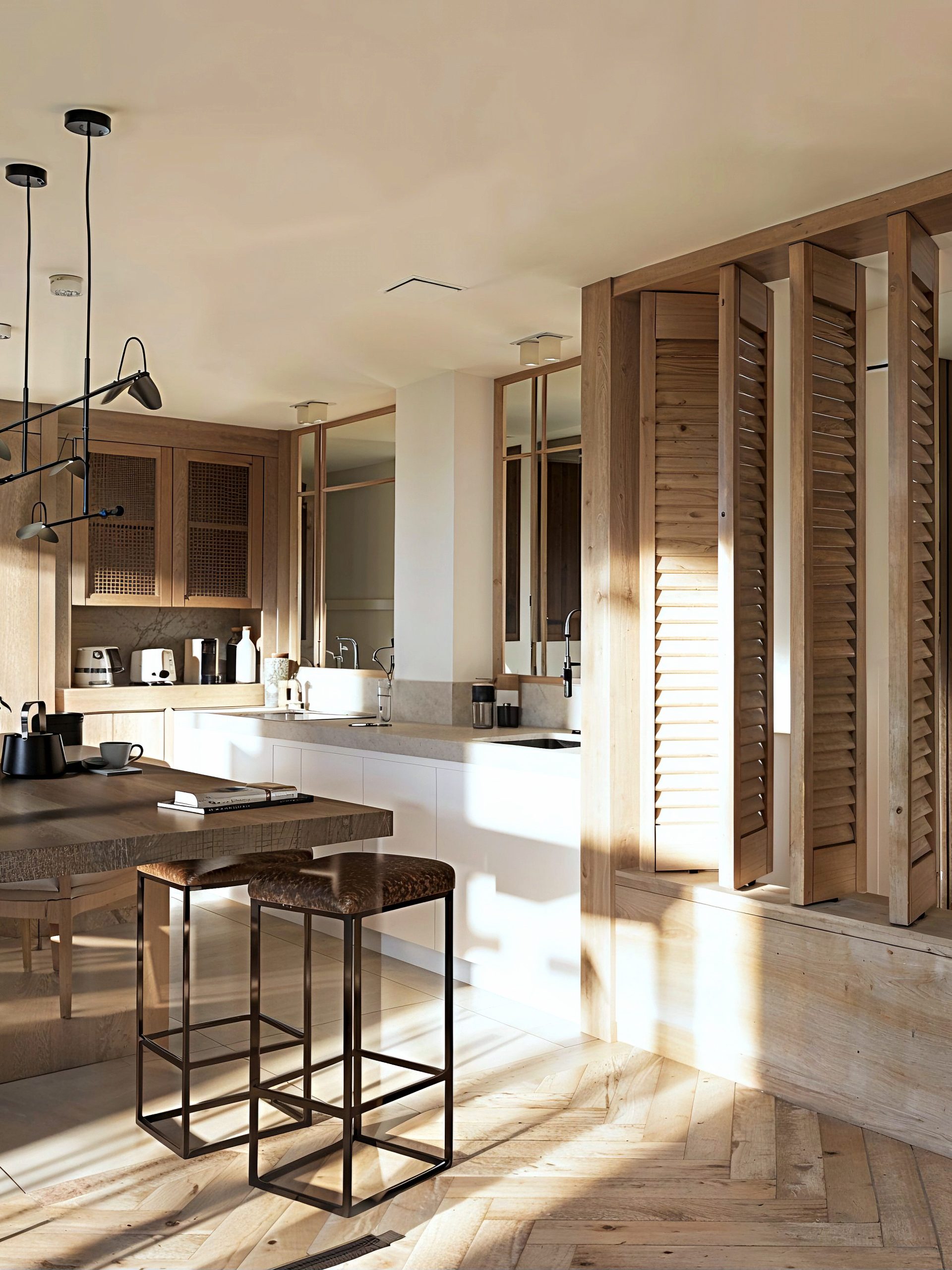 Dès les premiers pas, l’expérience est posée par une mise en scène sobre et précise. Le projet s’articule autour d’une palette chaleureuse, où les bois texturés et les teintes minérales s’accordent à une lumière naturelle omniprésente. Les espaces de vie se lisent en séquences fluides : un parquet en point de Hongrie installe une élégance intemporelle, tandis que les menuiseries sur mesure structurent l’architecture intérieure sans jamais la figer. Un claustra pivotant en lames de bois, dessiné comme une pièce d’ébénisterie, filtre les perspectives et compose un seuil subtil entre entrée, salon et cuisine.