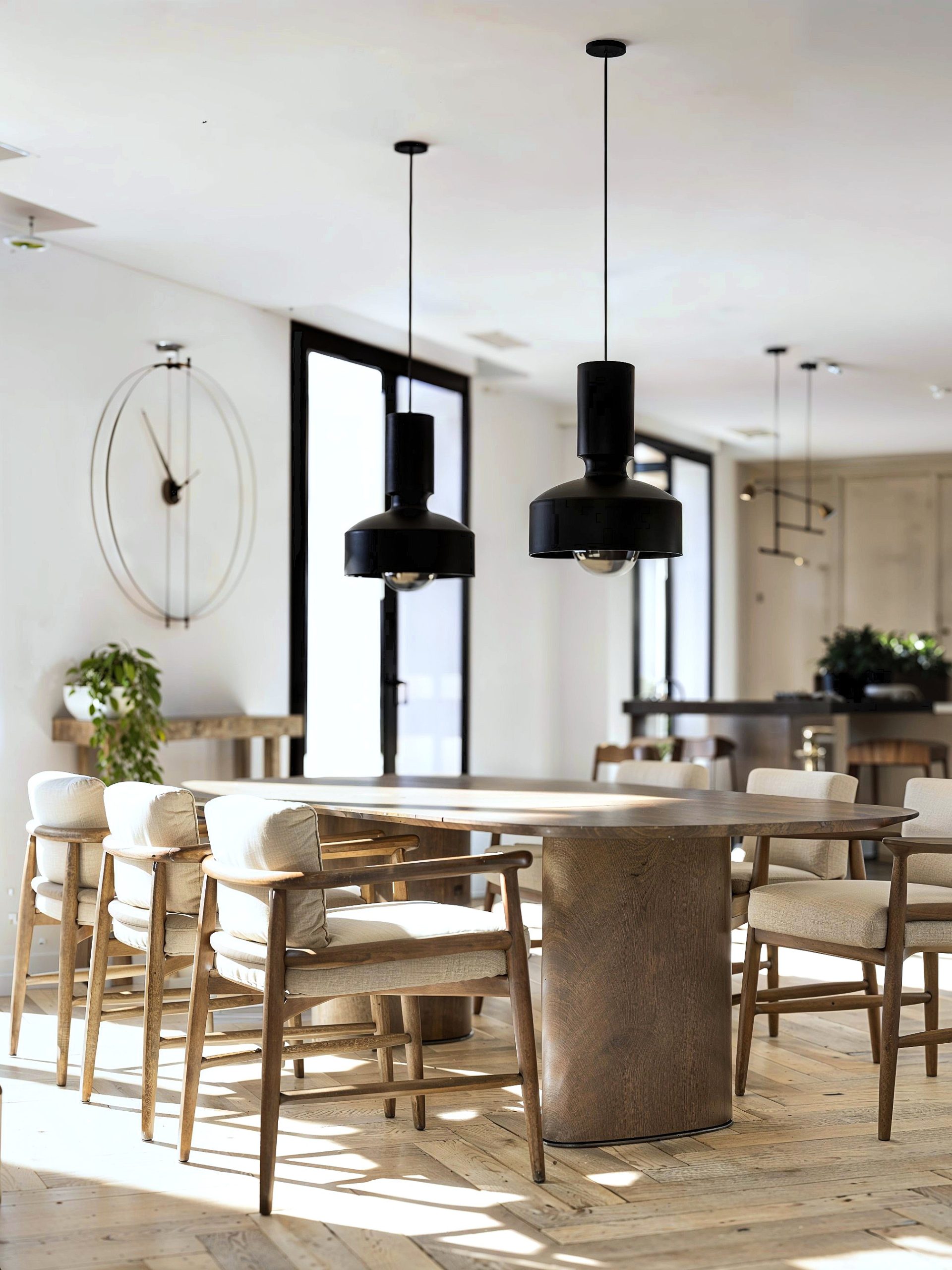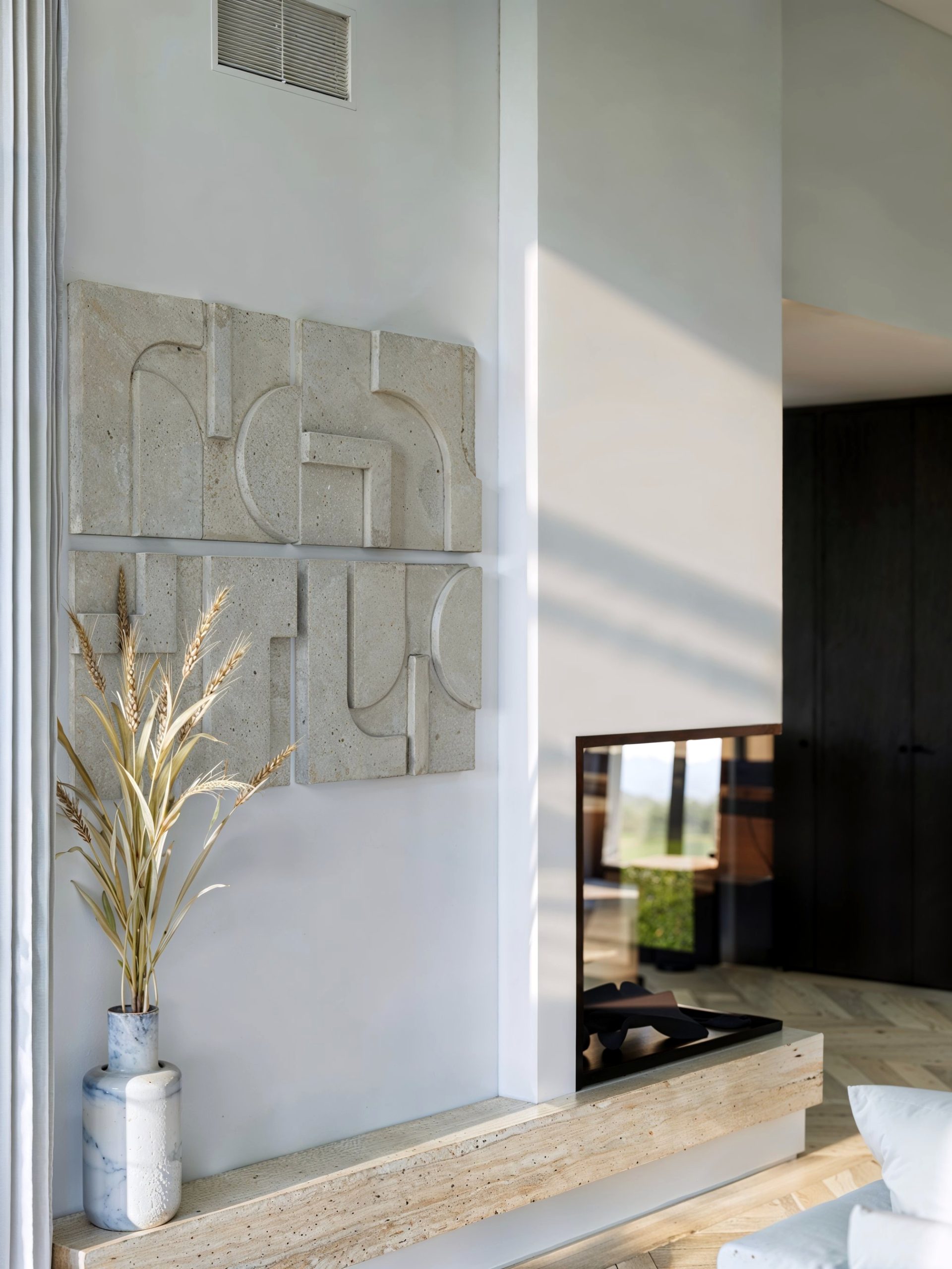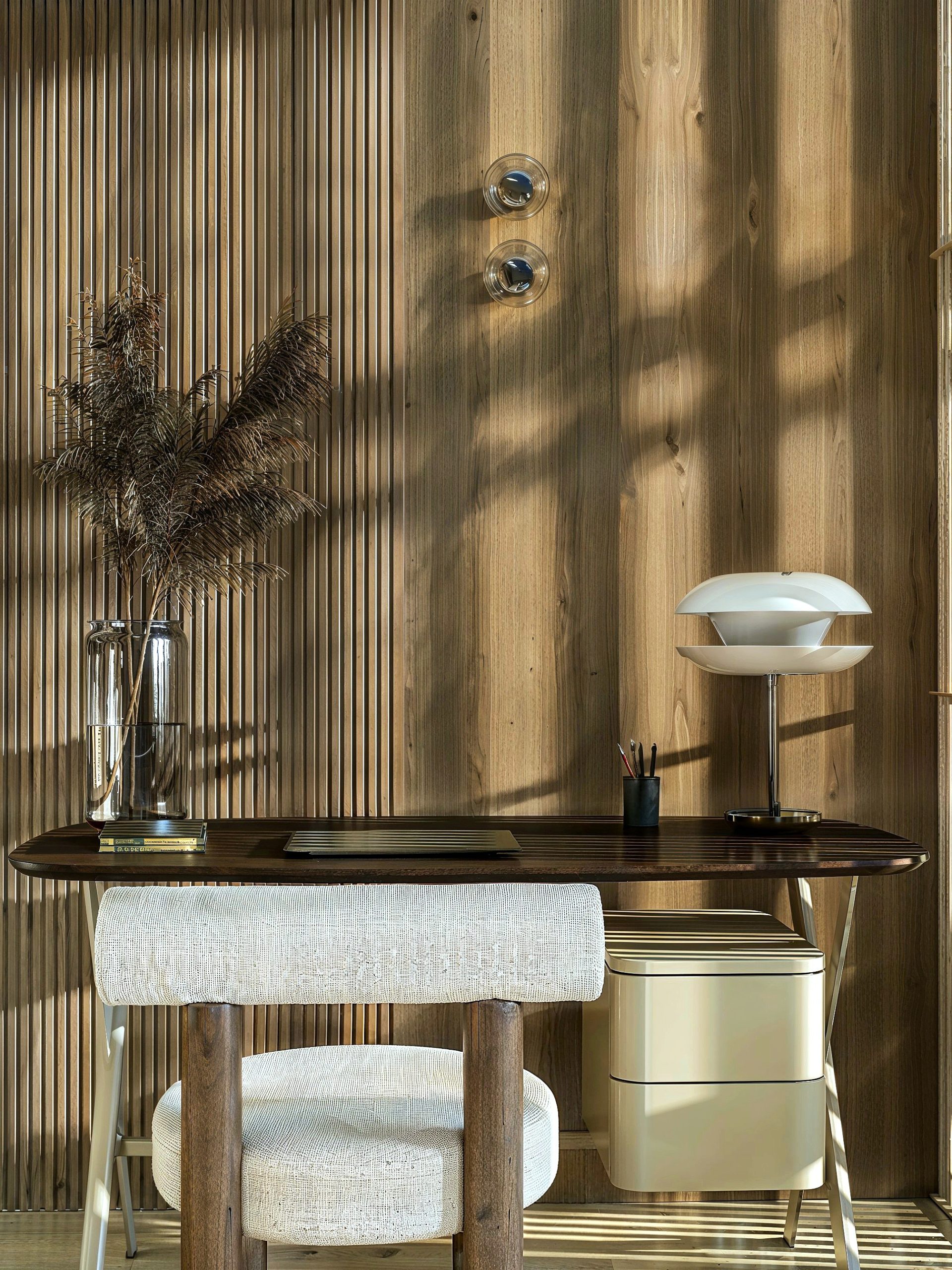 Dès les premiers pas, l’expérience est posée par une mise en scène sobre et précise. Le projet s’articule autour d’une palette chaleureuse, où les bois texturés et les teintes minérales s’accordent à une lumière naturelle omniprésente. Les espaces de vie se lisent en séquences fluides : un parquet en point de Hongrie installe une élégance intemporelle, tandis que les menuiseries sur mesure structurent l’architecture intérieure sans jamais la figer. Un claustra pivotant en lames de bois, dessiné comme une pièce d’ébénisterie, filtre les perspectives et compose un seuil subtil entre entrée, salon et cuisine.