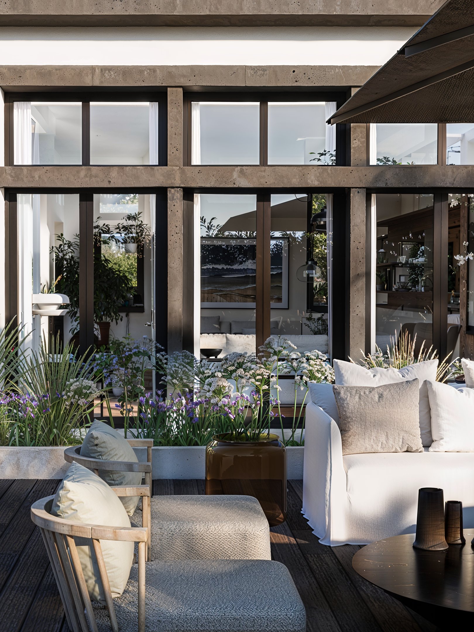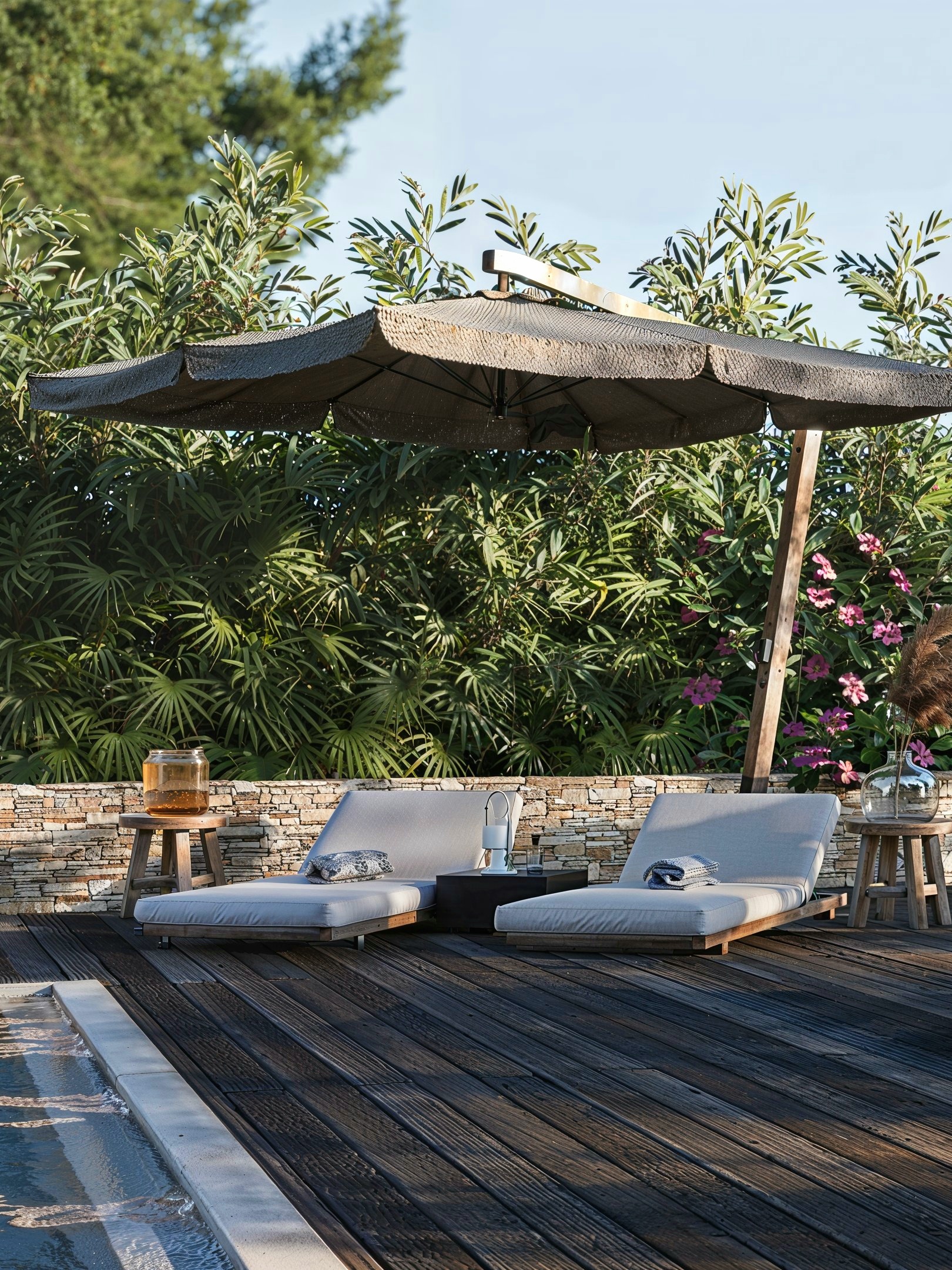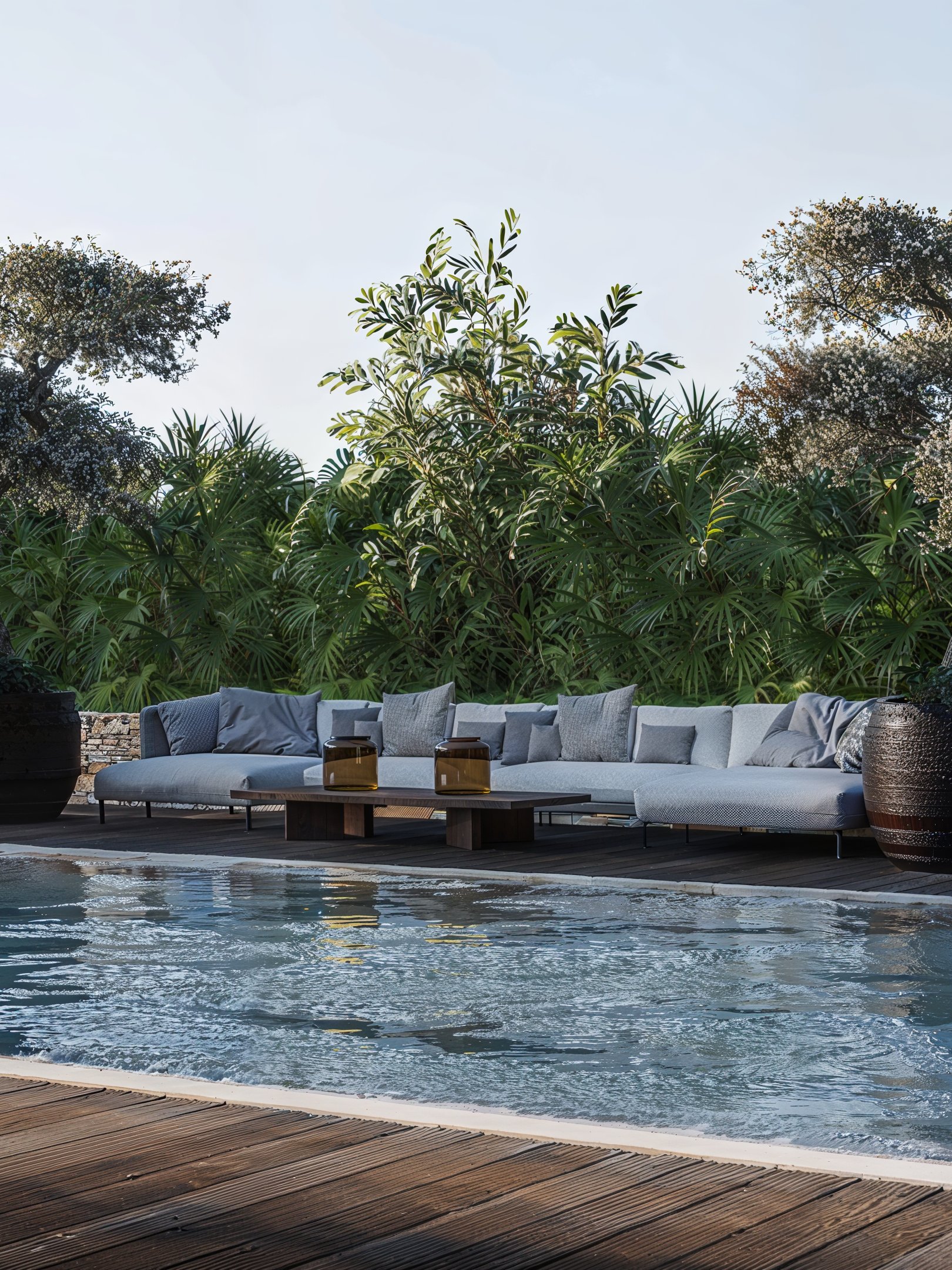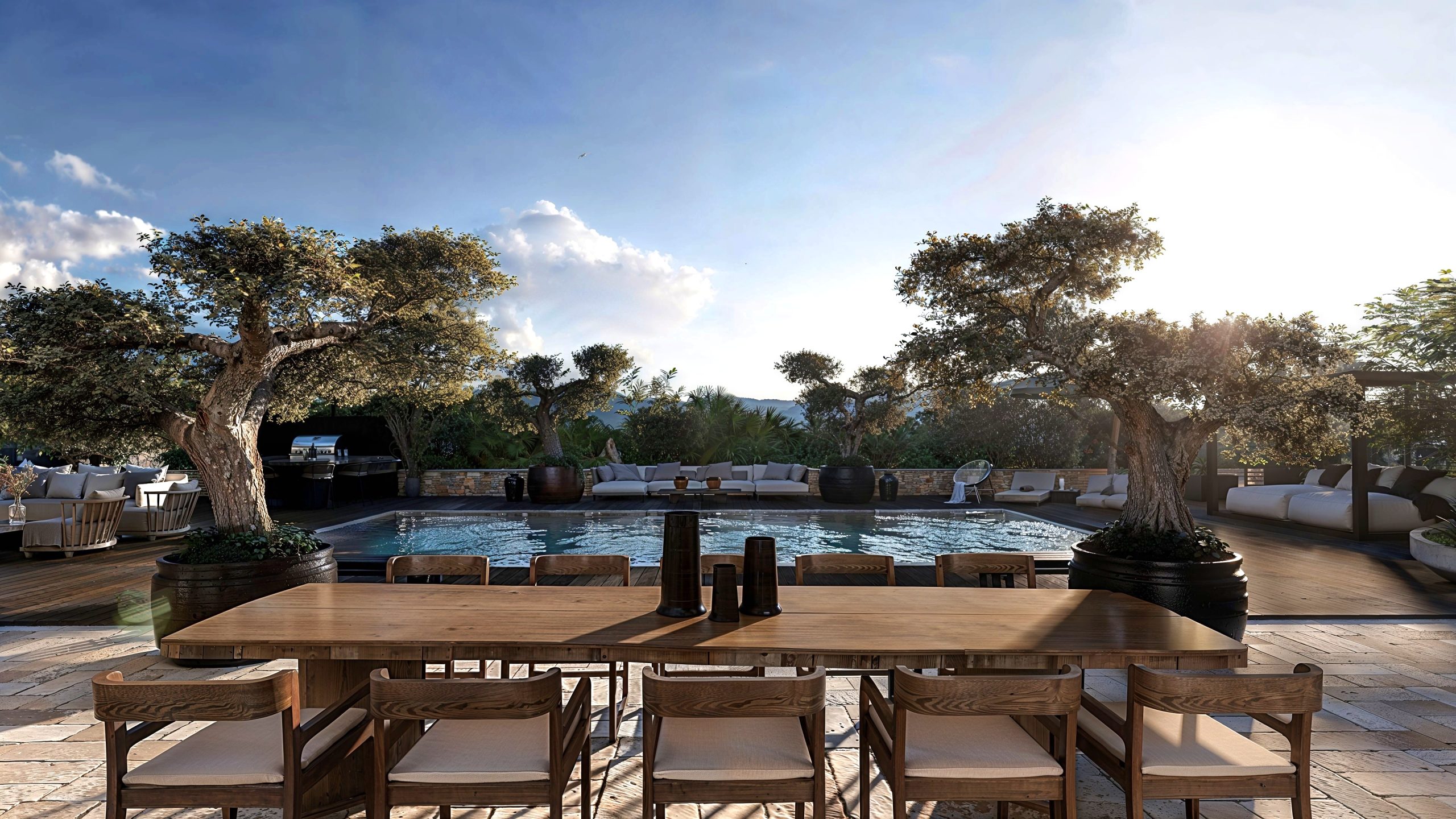À l’extérieur, la villa s’efface au profit du paysage. Les grandes baies cadrent la vallée, les terrasses deviennent des salons à ciel ouvert, et la piscine s’inscrit comme une ligne d’eau élégante au cœur d’une végétation généreuse. L’ensemble compose un art de vivre riviera : contemplatif, fluide, intensément maîtrisé — jusque dans les moindres détails.