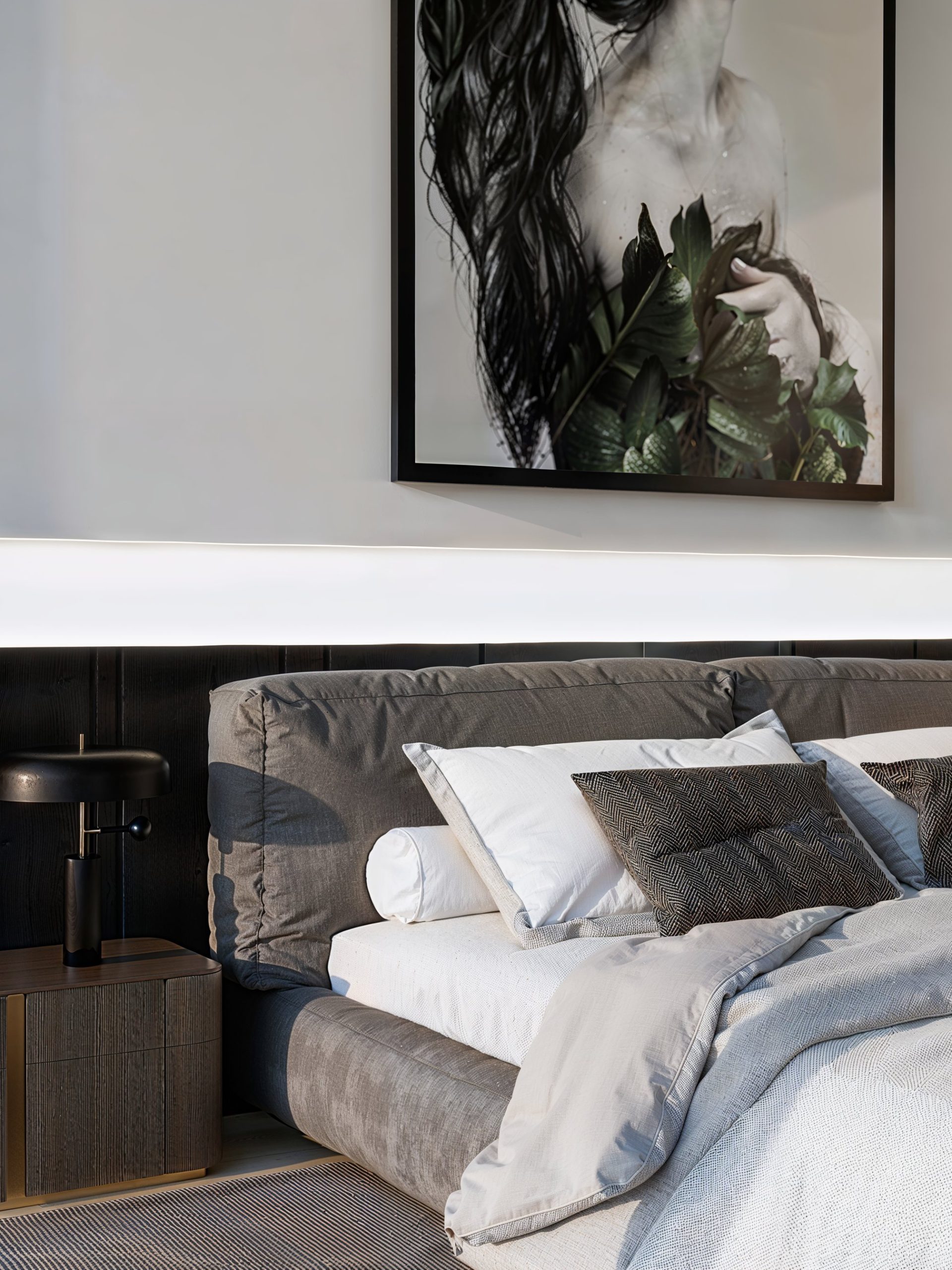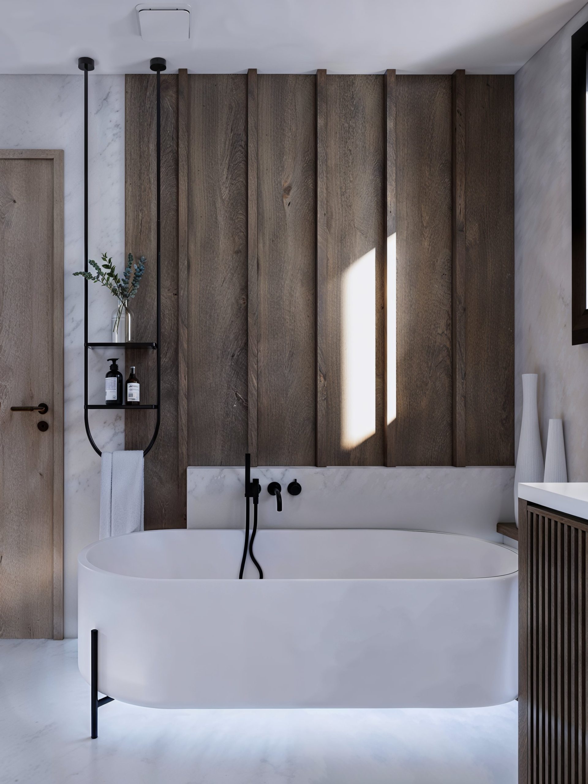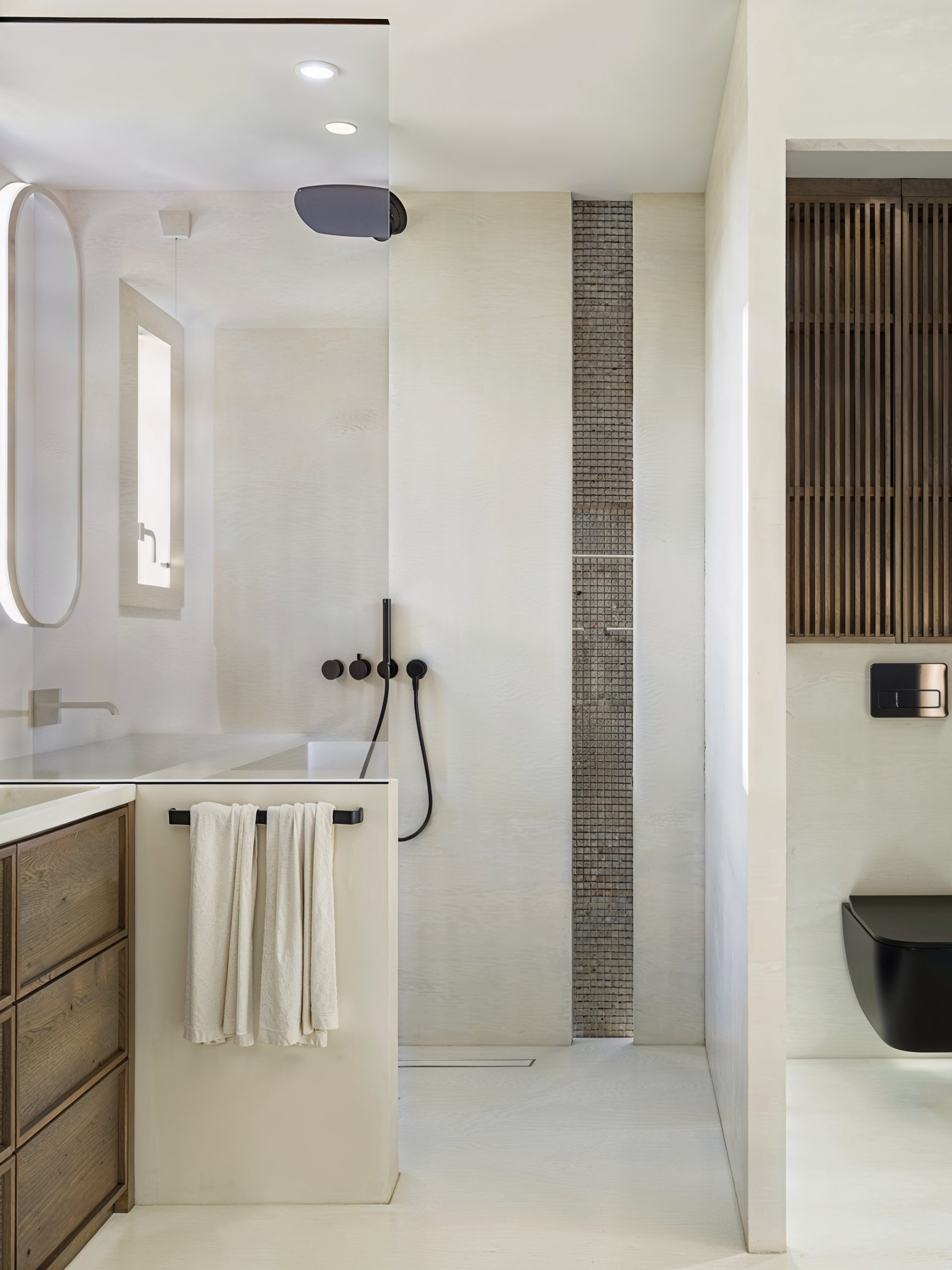 Les espaces nuit prolongent cette narration avec une sensibilité plus intime : tête de lit immersive, tonalités profondes et matières enveloppantes. Dans les salles de bain, le contraste entre la minéralité blanche et le bois vertical crée un équilibre apaisant, souligné par une robinetterie noire graphique et un mobilier aux détails cannelés.