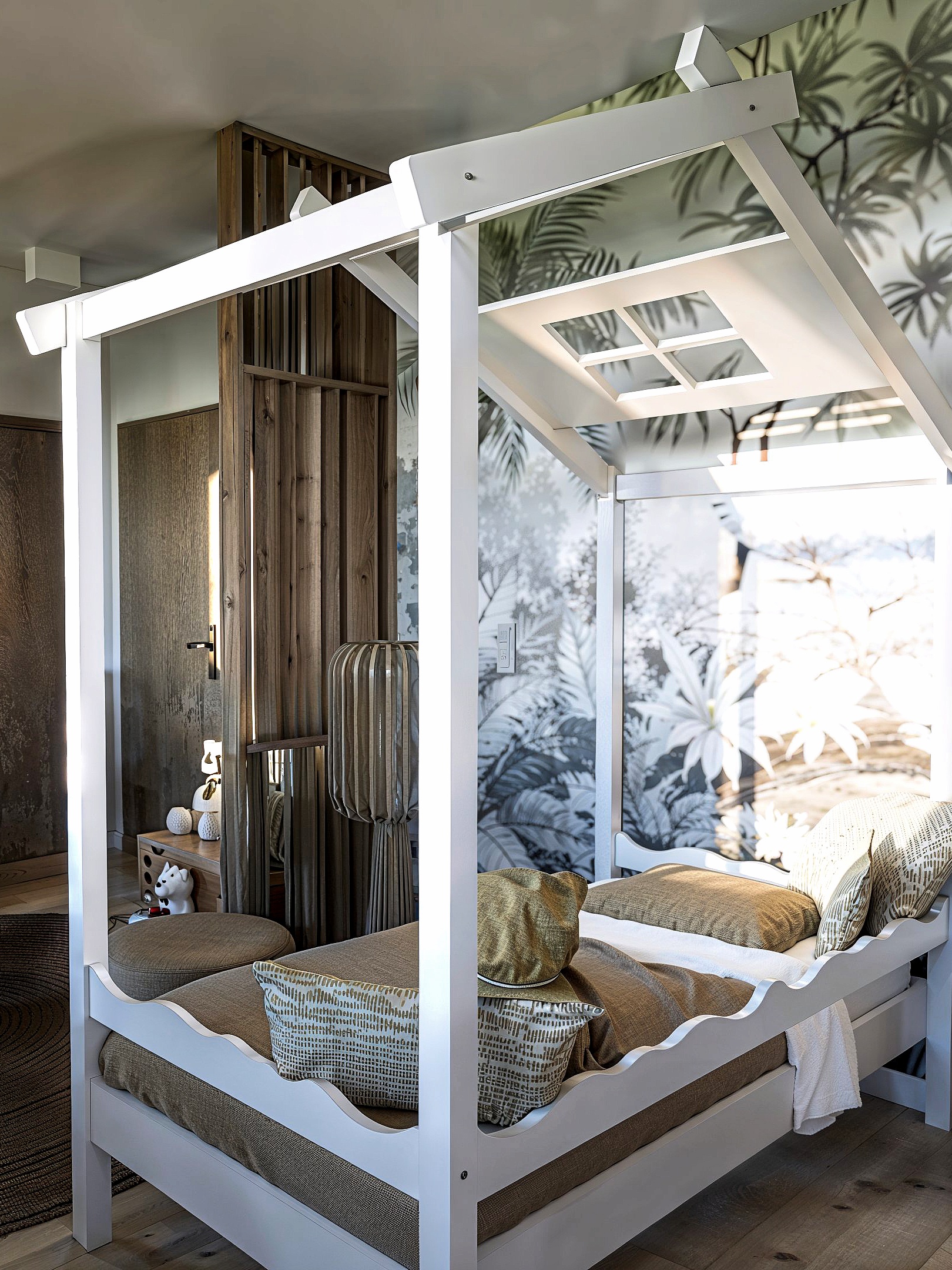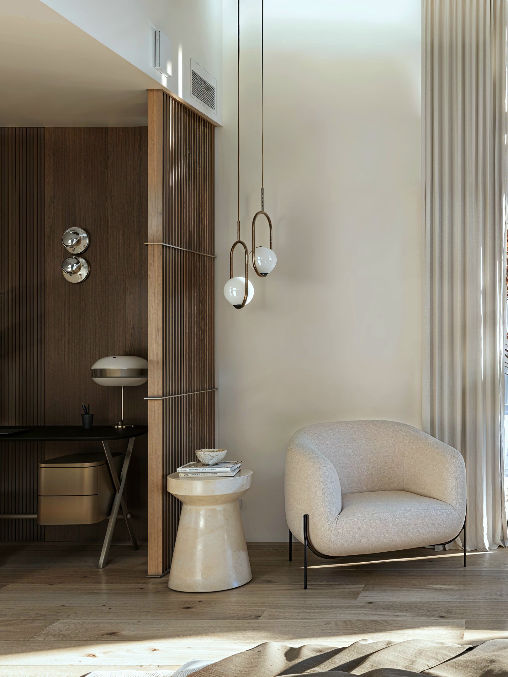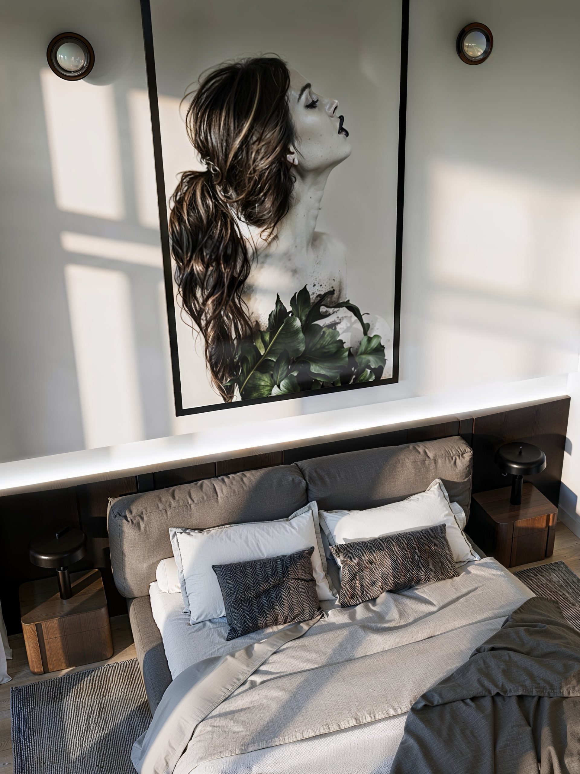 Les espaces nuit prolongent cette narration avec une sensibilité plus intime : tête de lit immersive, tonalités profondes et matières enveloppantes. Dans les salles de bain, le contraste entre la minéralité blanche et le bois vertical crée un équilibre apaisant, souligné par une robinetterie noire graphique et un mobilier aux détails cannelés.
