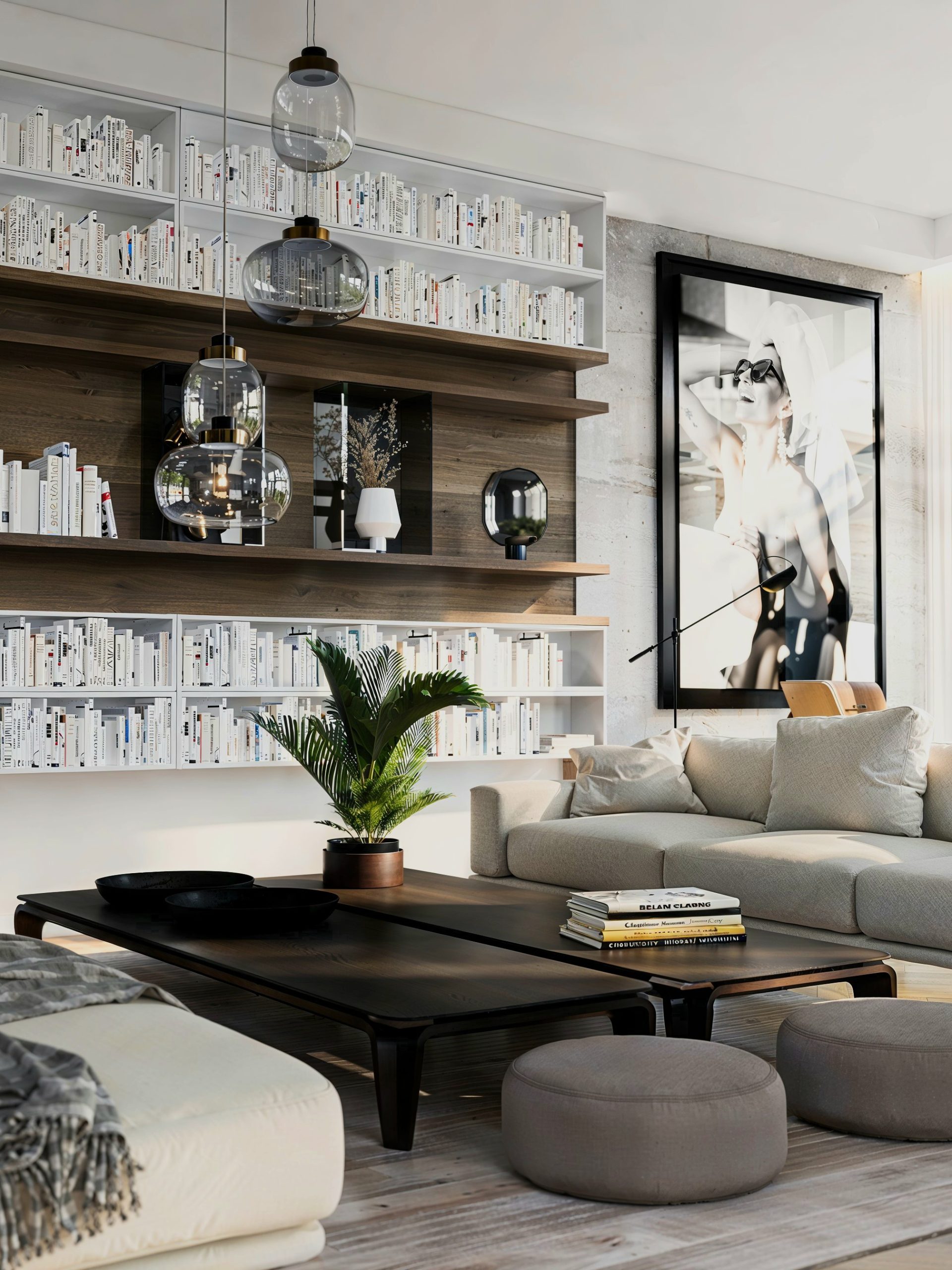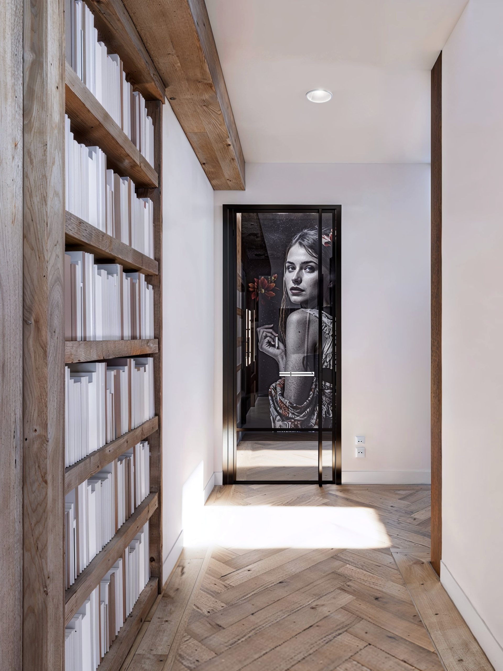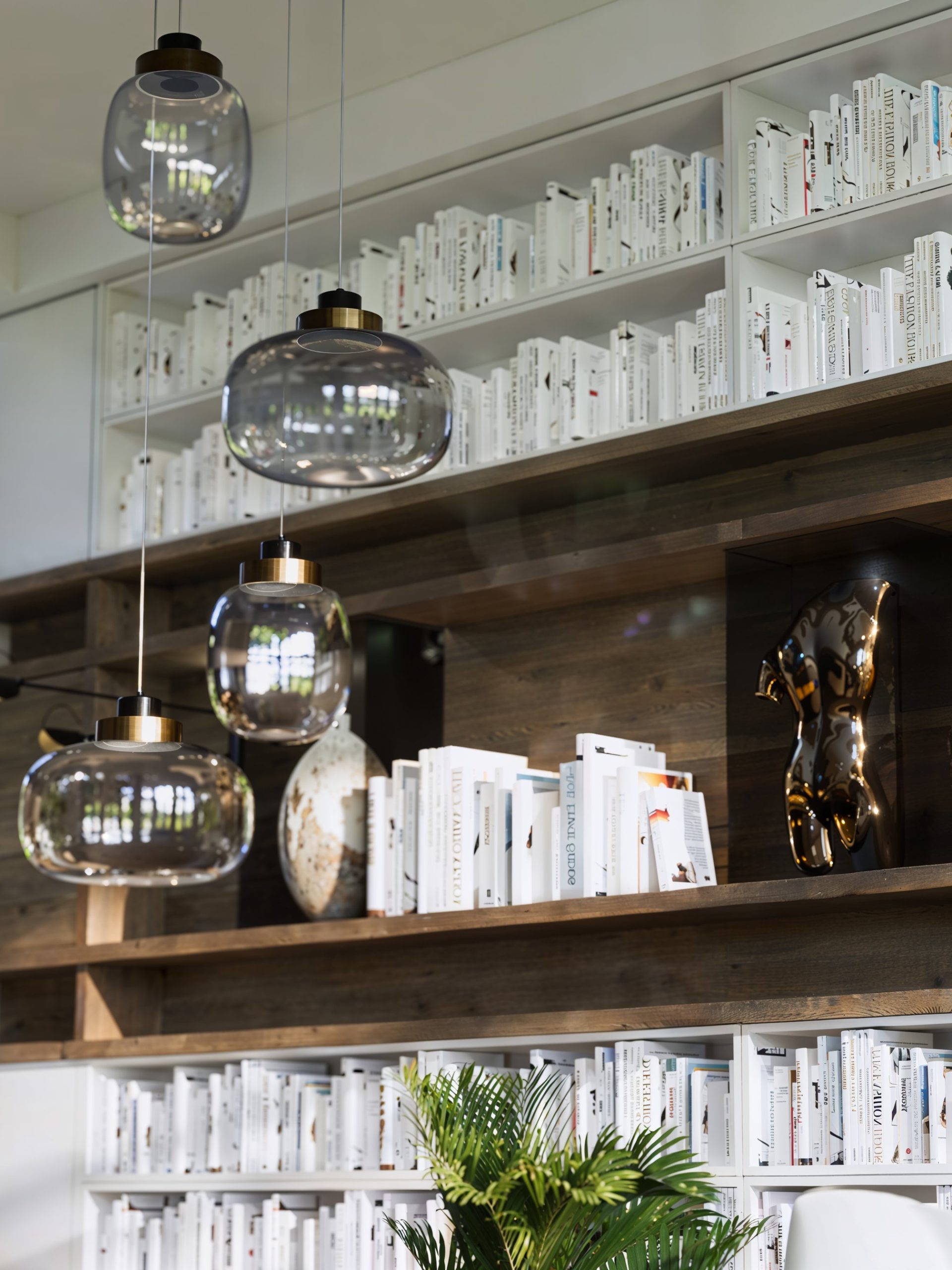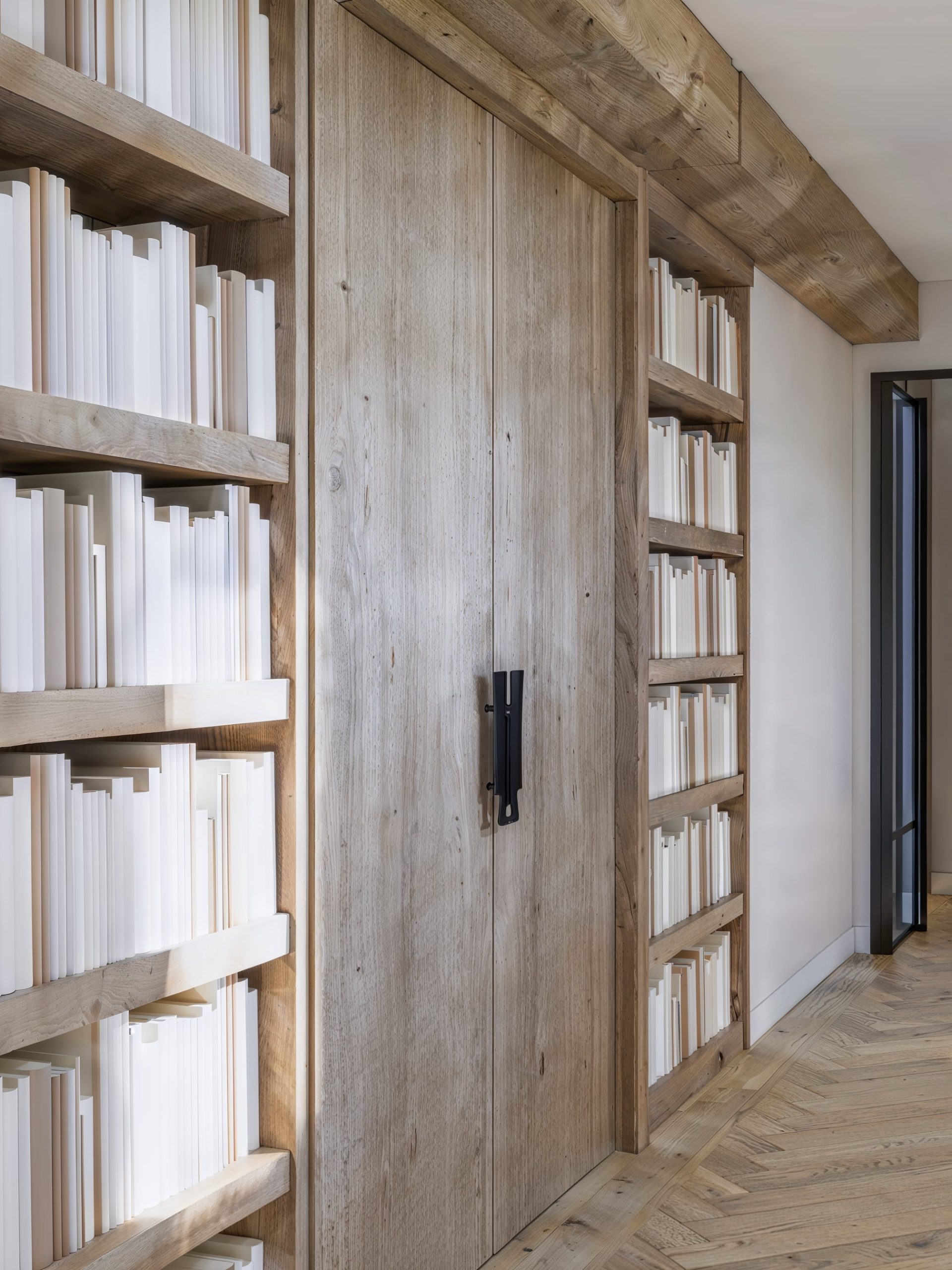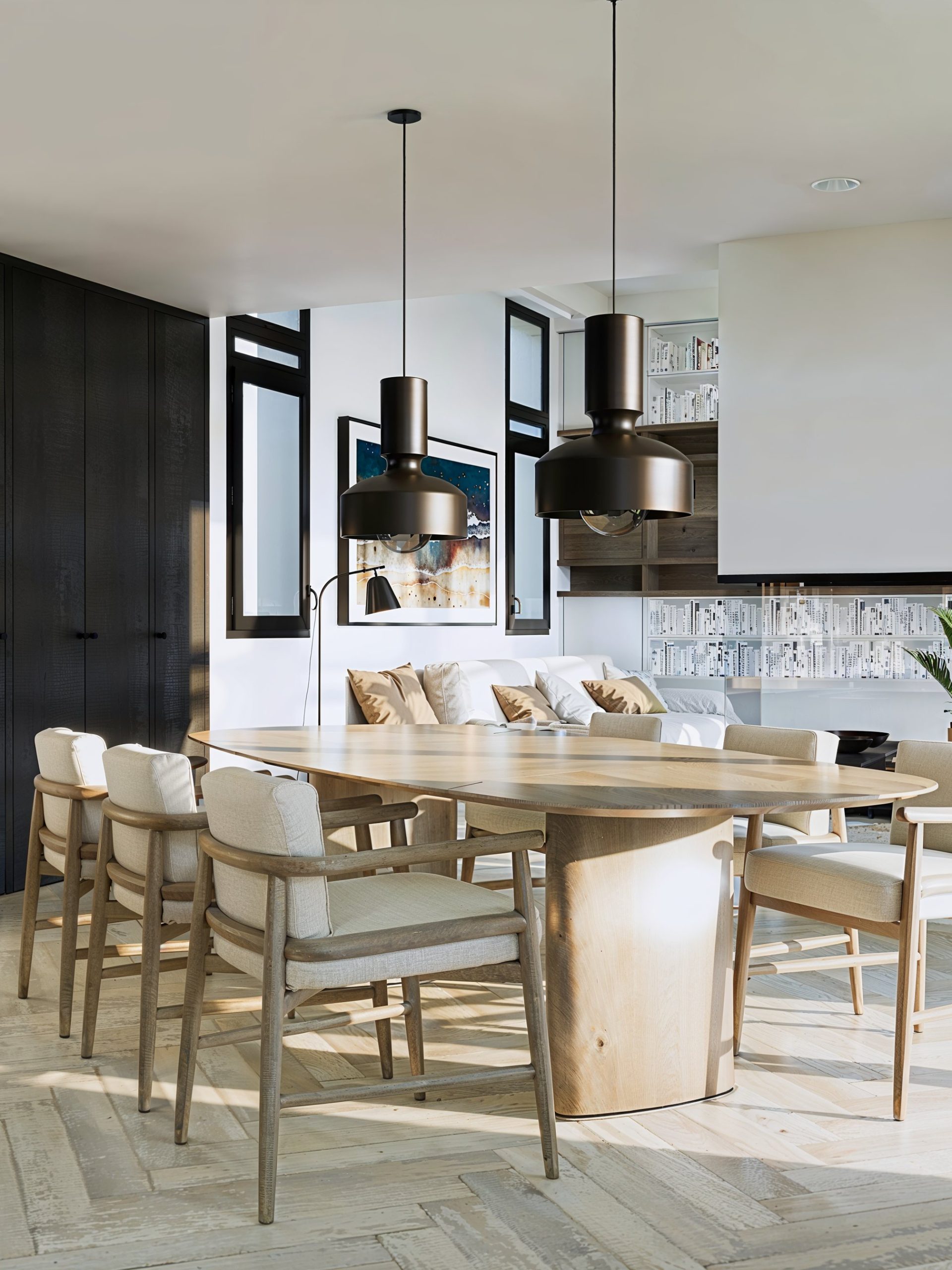 Dans le séjour, une bibliothèque toute hauteur devient un paysage intérieur. Elle raconte la maison autant qu’elle l’organise : rangements intégrés, volumes aérés, mise en lumière maîtrisée.