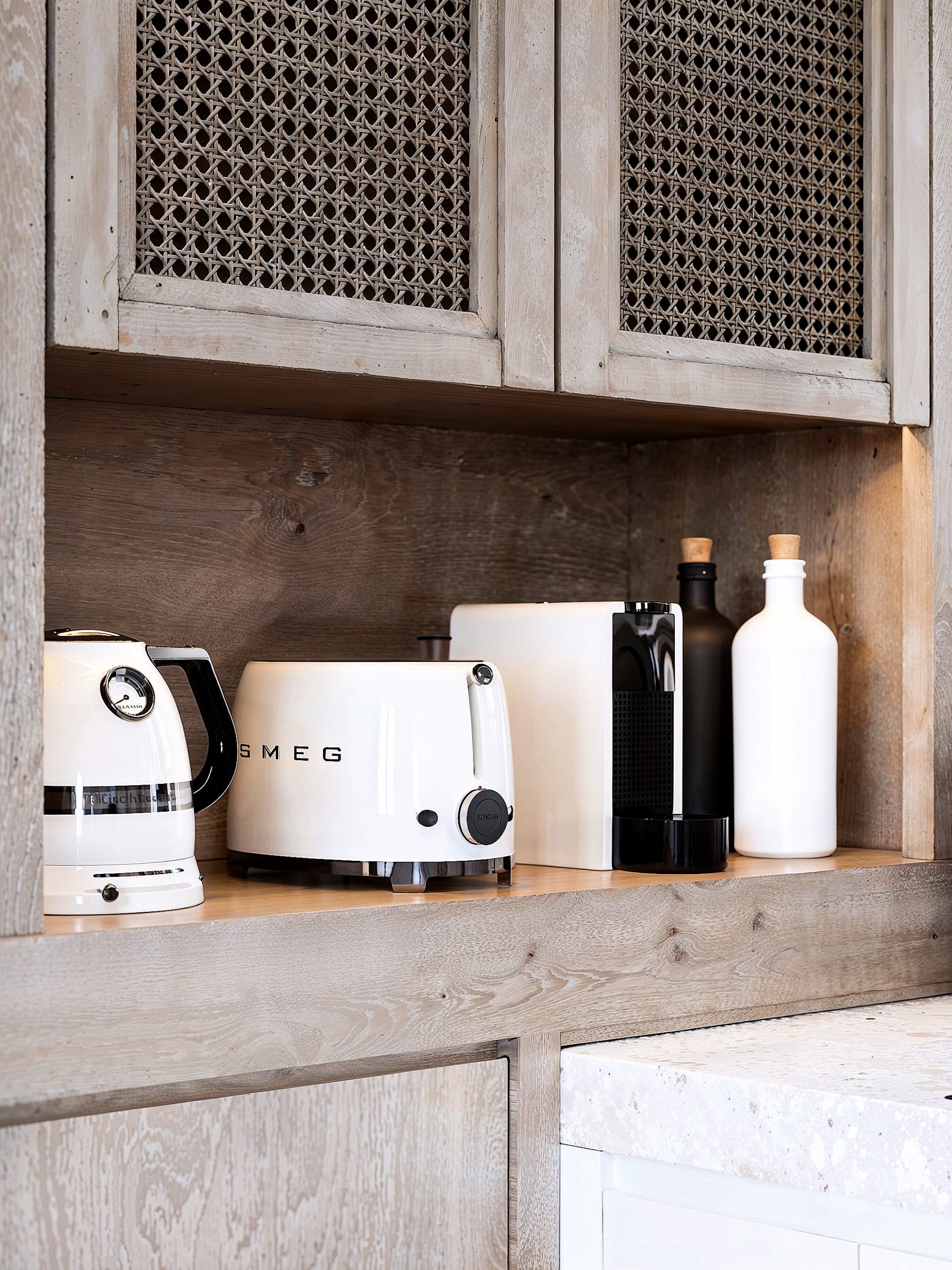 La cuisine, pensée comme un véritable lieu de réception, joue le contraste entre façades claires, plan minéral et accents bois. Les détails — cannage, niches, luminaires en verre fumé — apportent une sophistication discrète, fidèle à l’esprit “resort privé” : un luxe lisible, jamais ostentatoire.