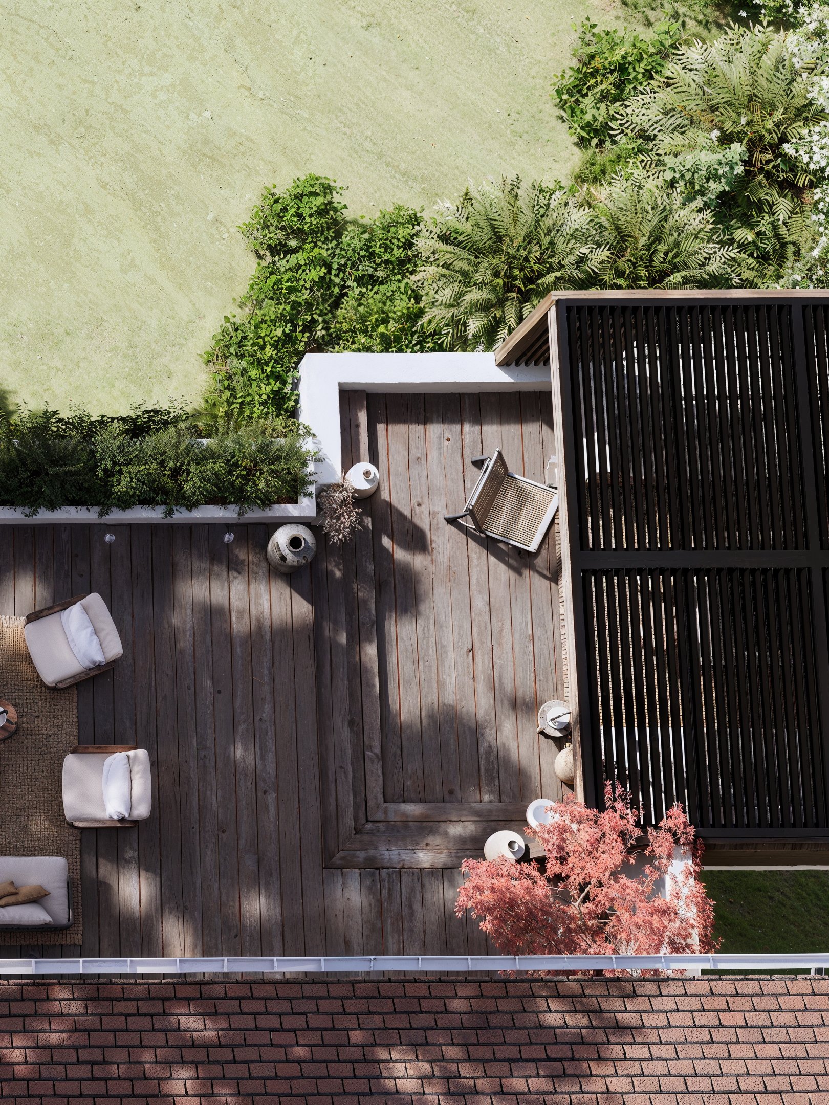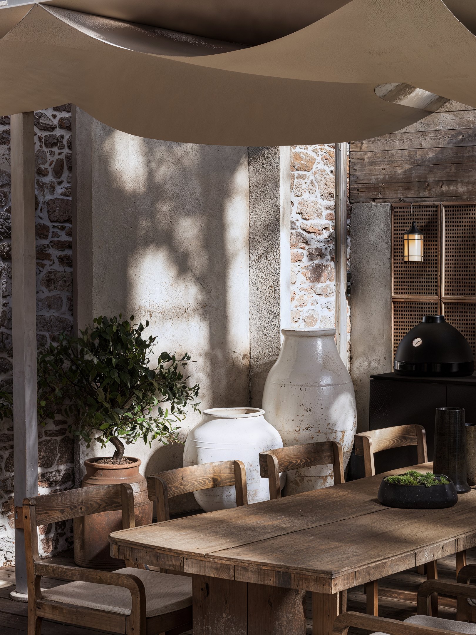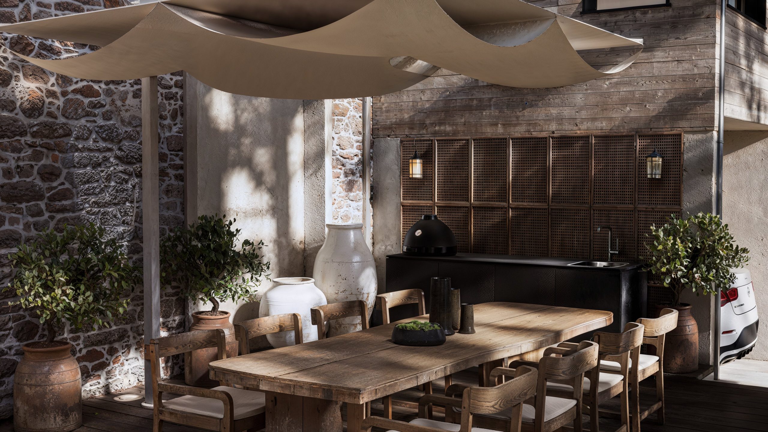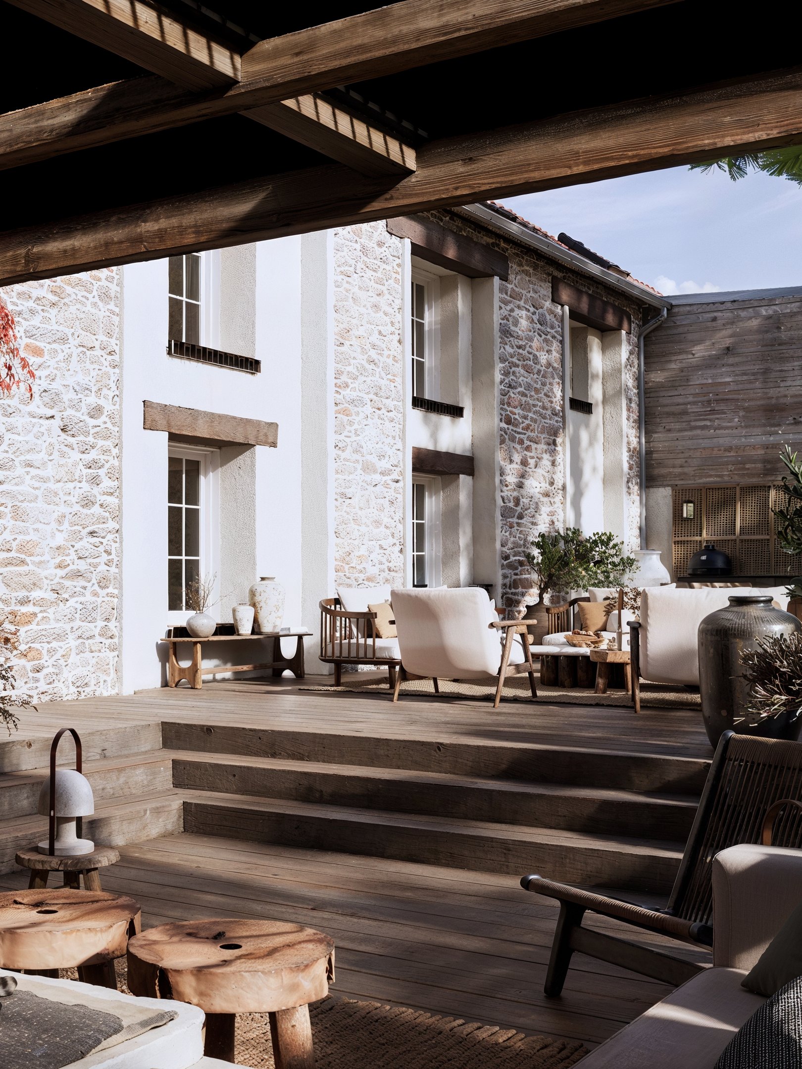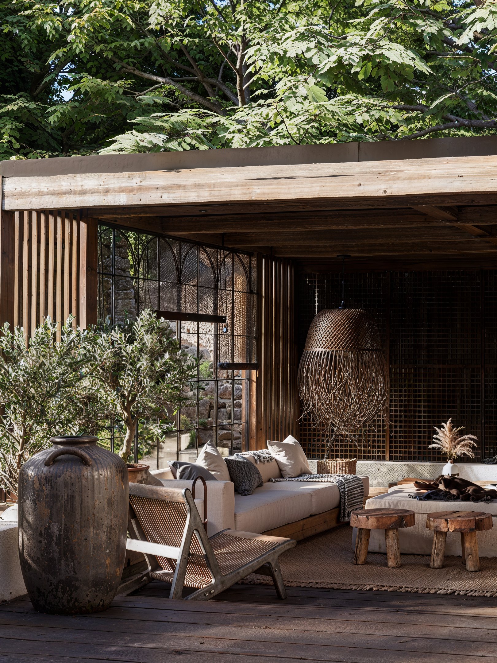 Le bois omniprésent, travaillé avec minutie, confère à l’ensemble une atmosphère chaleureuse, presque contemplative. Ce salon extérieur couvert devient un véritable prolongement de la maison, pensé pour vivre l’été comme en demie saison dans une ambiance authentique et enveloppante.