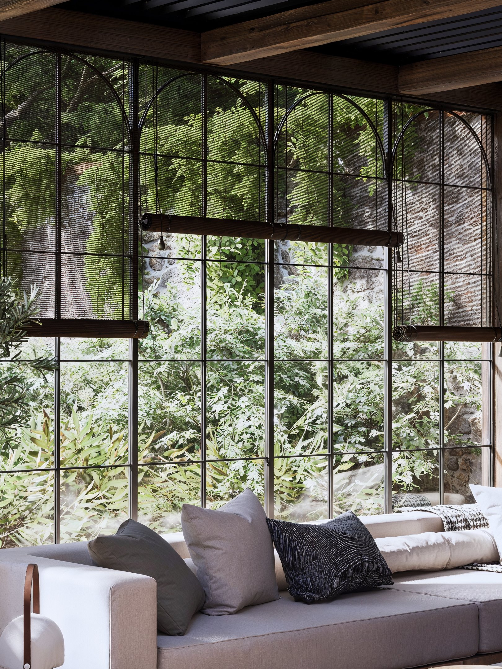Les stores permettent de moduler la lumière et de préserver l’intimité, tout en cadrant les vues sur le jardin. Ce dialogue constant entre l’architecture et la végétation confère à l’ensemble une poésie rare.