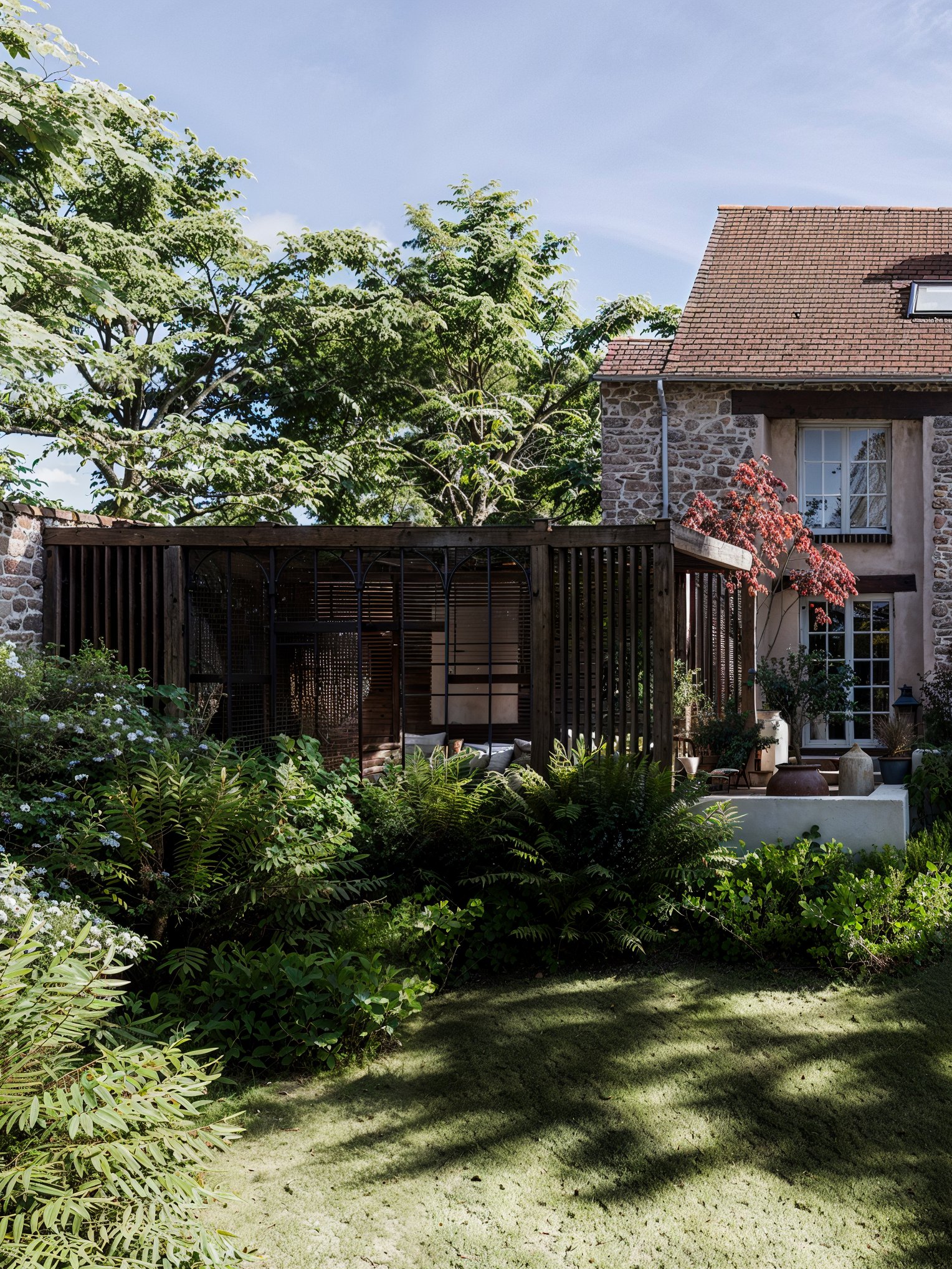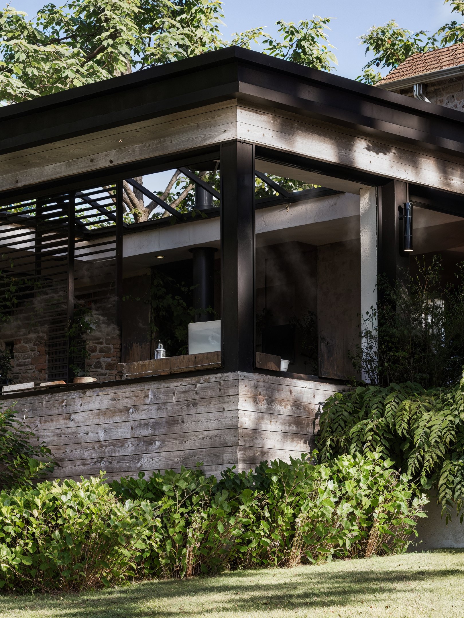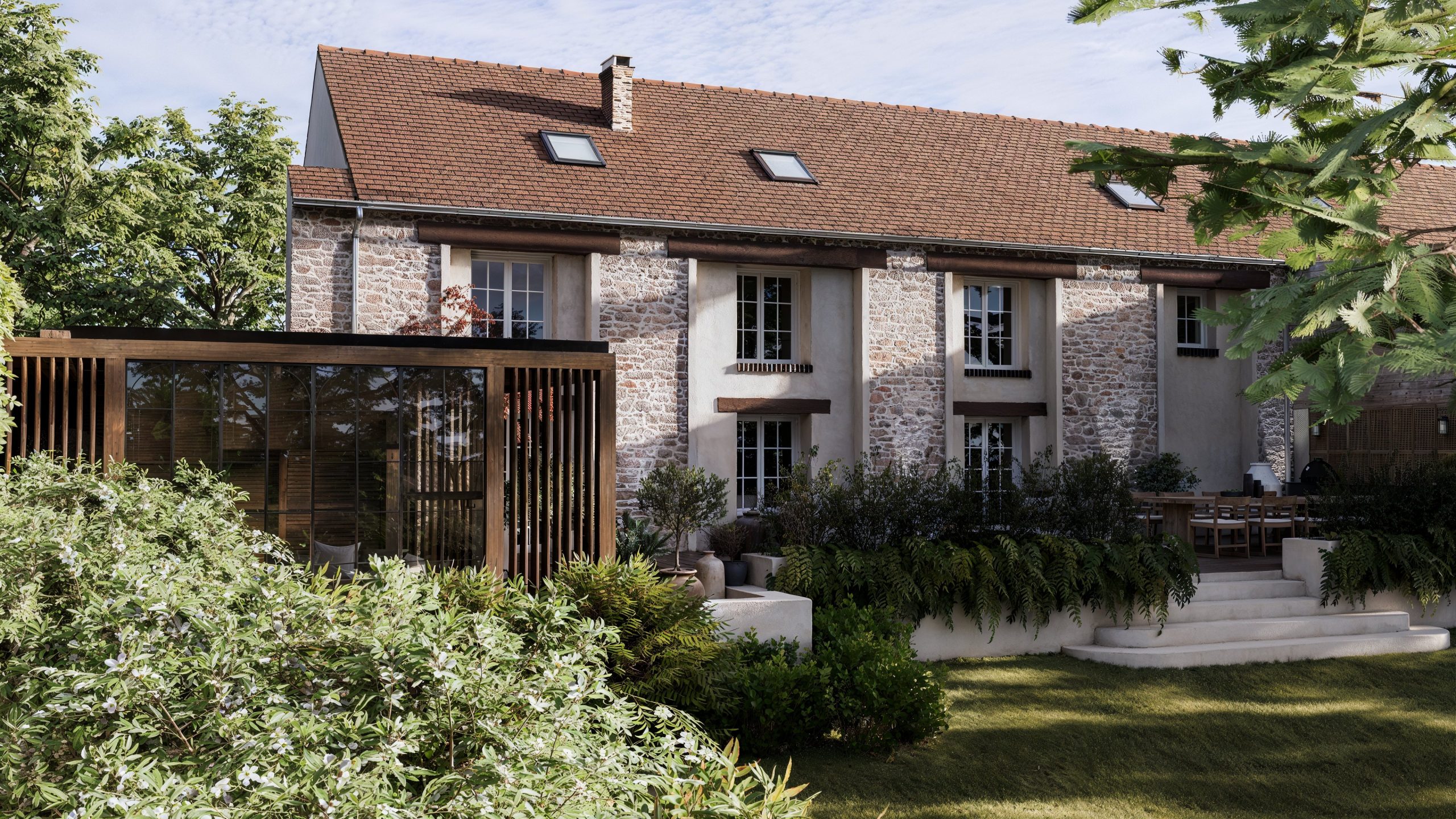 Cette version contemporaine de la terrasse prend la forme d’une pergola monumentale, véritable pièce architecturale en bois et métal. Son ossature élégante accueille de larges verrières qui rythment la façade, créant une interface poétique entre intérieur et jardin. À l’intérieur, les assises sur mesure s’articulent autour d’un foyer central, sous deux luminaires sculpturaux aux allures de méduses végétales.