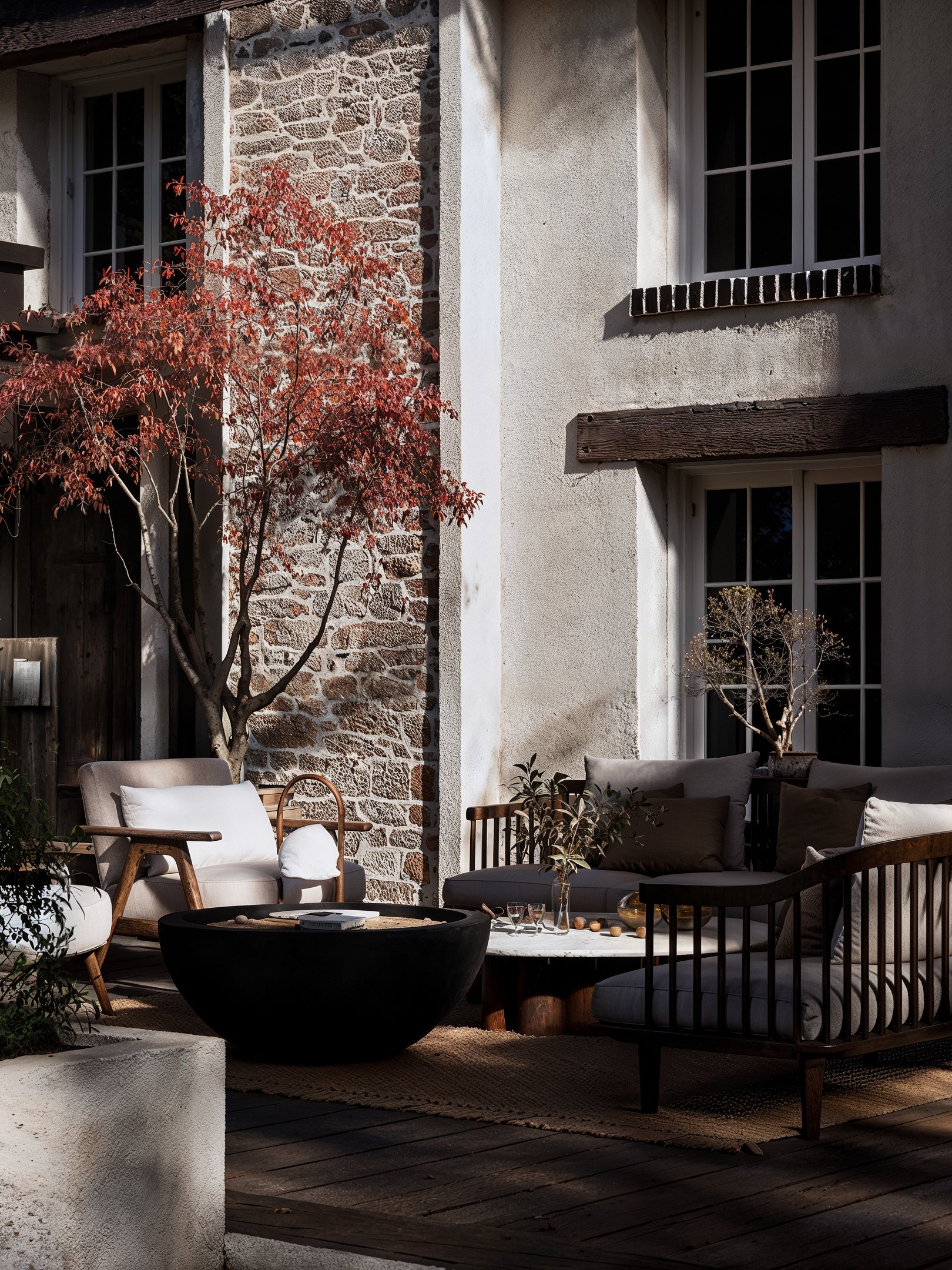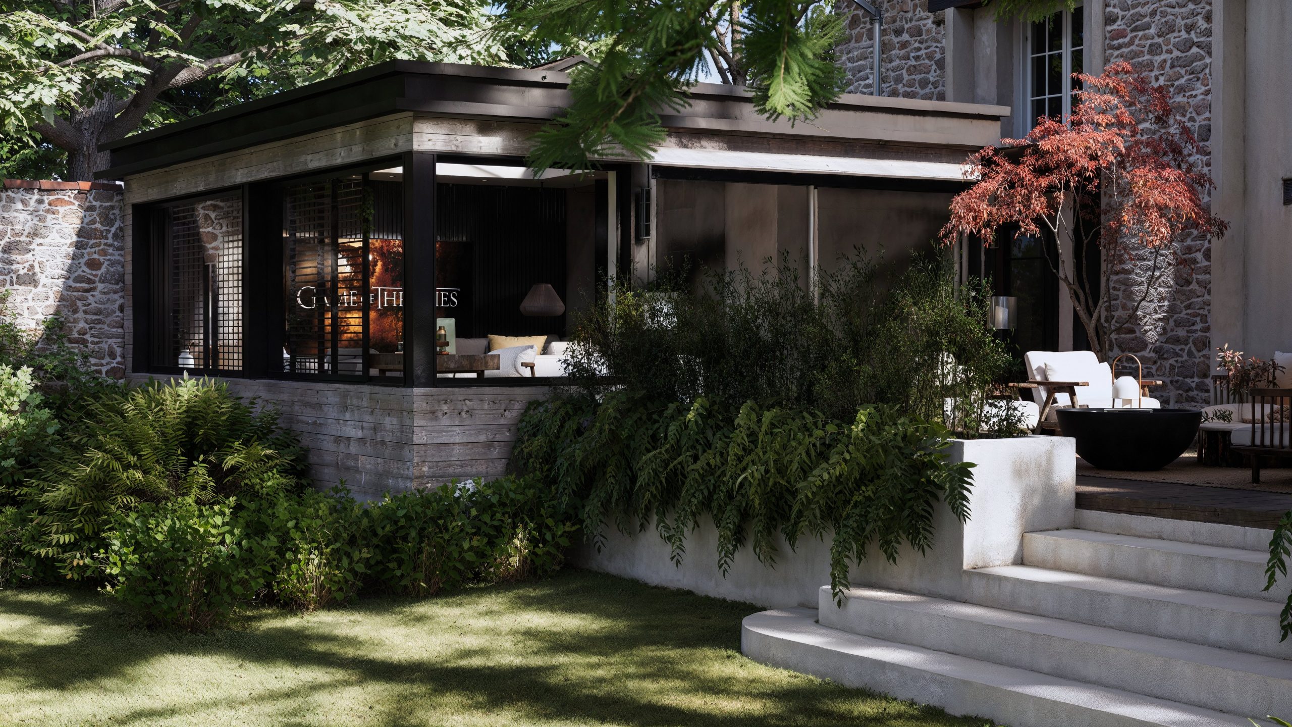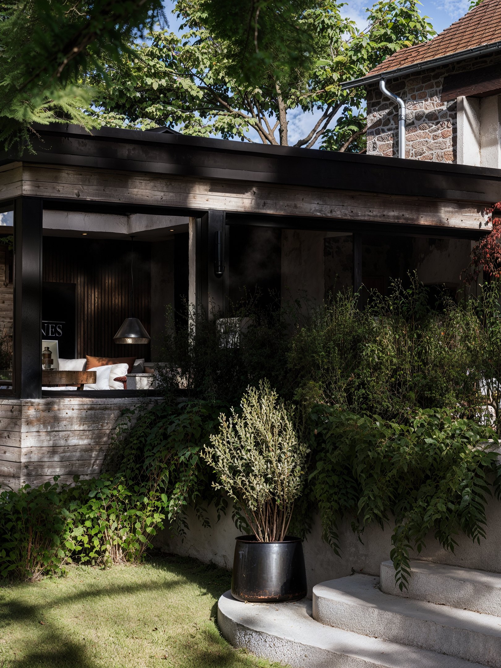 Cette version contemporaine de la terrasse prend la forme d’une pergola monumentale, véritable pièce architecturale en bois et métal. Son ossature élégante accueille de larges verrières qui rythment la façade, créant une interface poétique entre intérieur et jardin. À l’intérieur, les assises sur mesure s’articulent autour d’un foyer central, sous deux luminaires sculpturaux aux allures de méduses végétales.