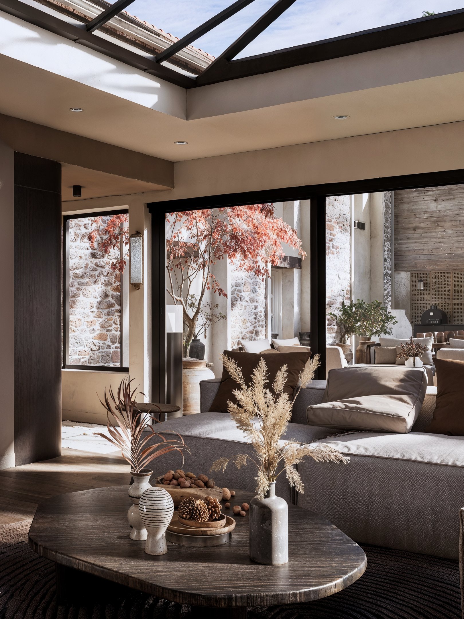 Enfin, chaque élément de décoration – des vases en céramique aux objets sculpturaux – a été sélectionné avec rigueur pour prolonger le geste architectural et renforcer la cohérence de l’ensemble. L’espace devient ainsi un écrin de vie, un salon d’hiver réinventé, où l’on se ressource, où l’on contemple, où l’on vit intensément.