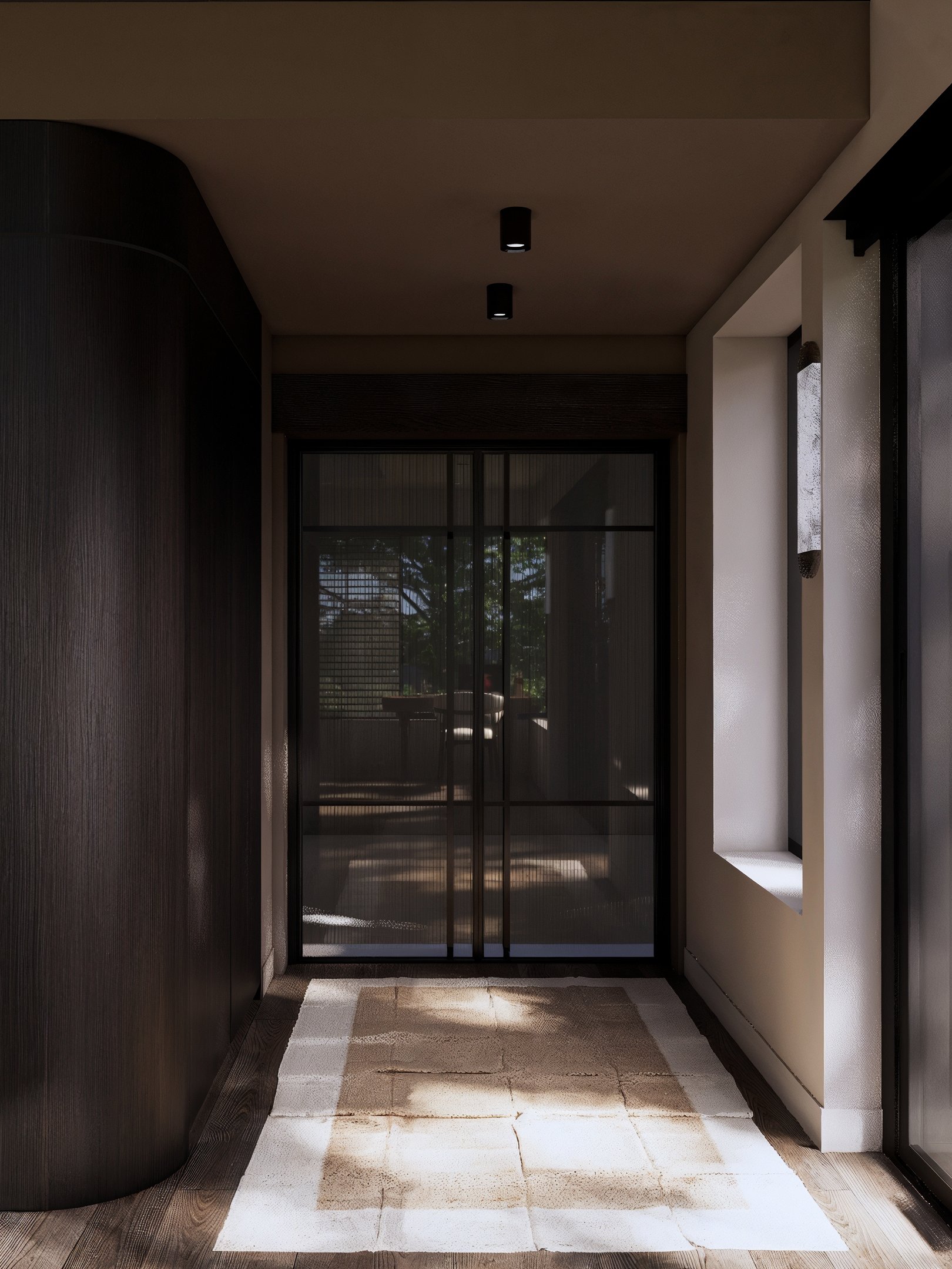 Le volume, généreux et baigné de lumière naturelle grâce à une verrière zénithale spectaculaire, offre une expérience immersive, presque végétale. La structure métallique noire se détache avec élégance dans le ciel. Les lignes franches et la palette naturelle confèrent à l’ensemble une atmosphère à la fois sophistiquée et apaisante.