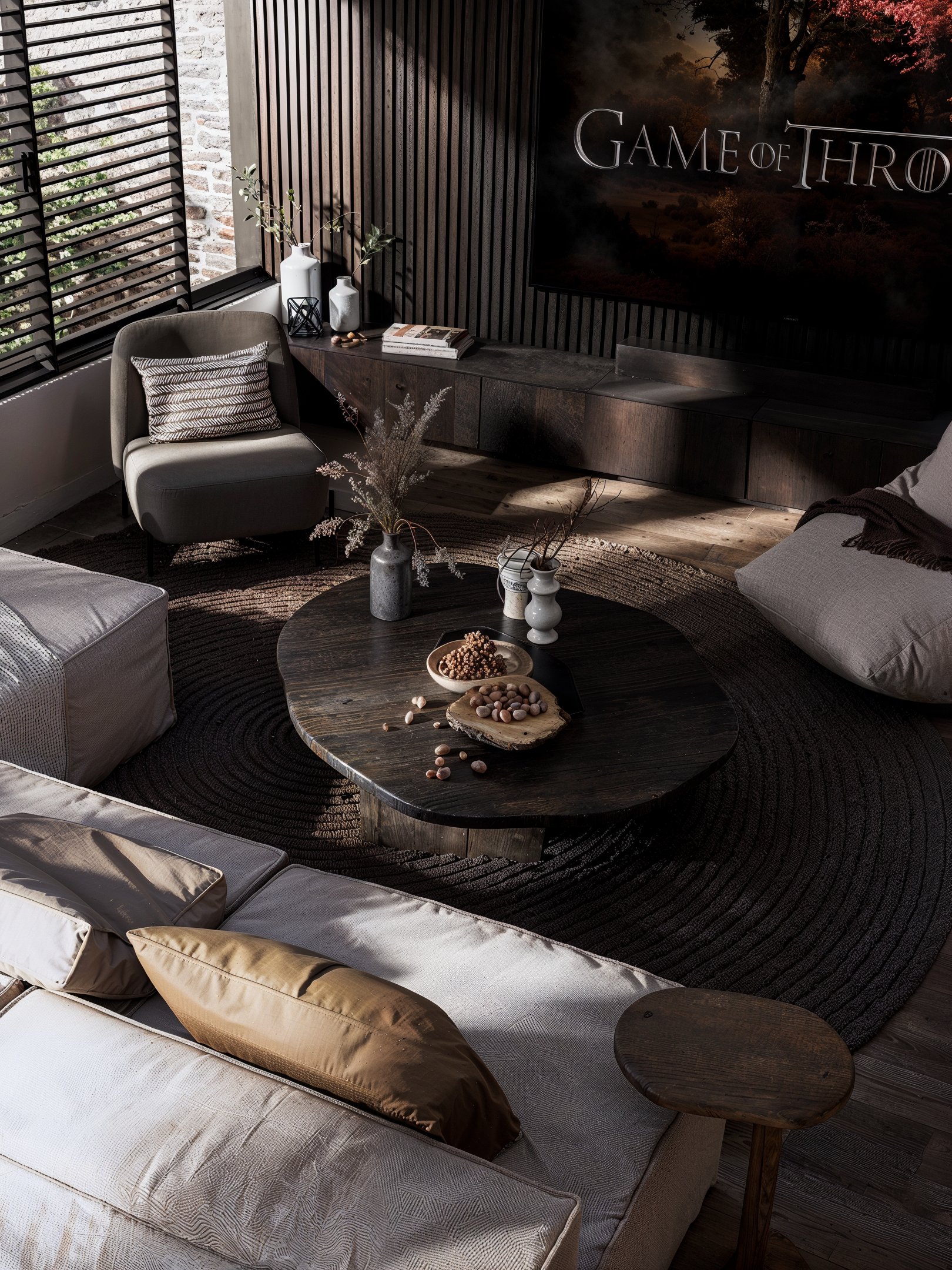 Le mur principal, habillé de lames verticales en bois teinté brun profond, agit comme un filtre visuel, absorbant la lumière et renforçant la profondeur du volume. Ce revêtement texturé crée une sensation d’enveloppement et sublime l’écran XXL à peine perceptible hors des moments de projection.