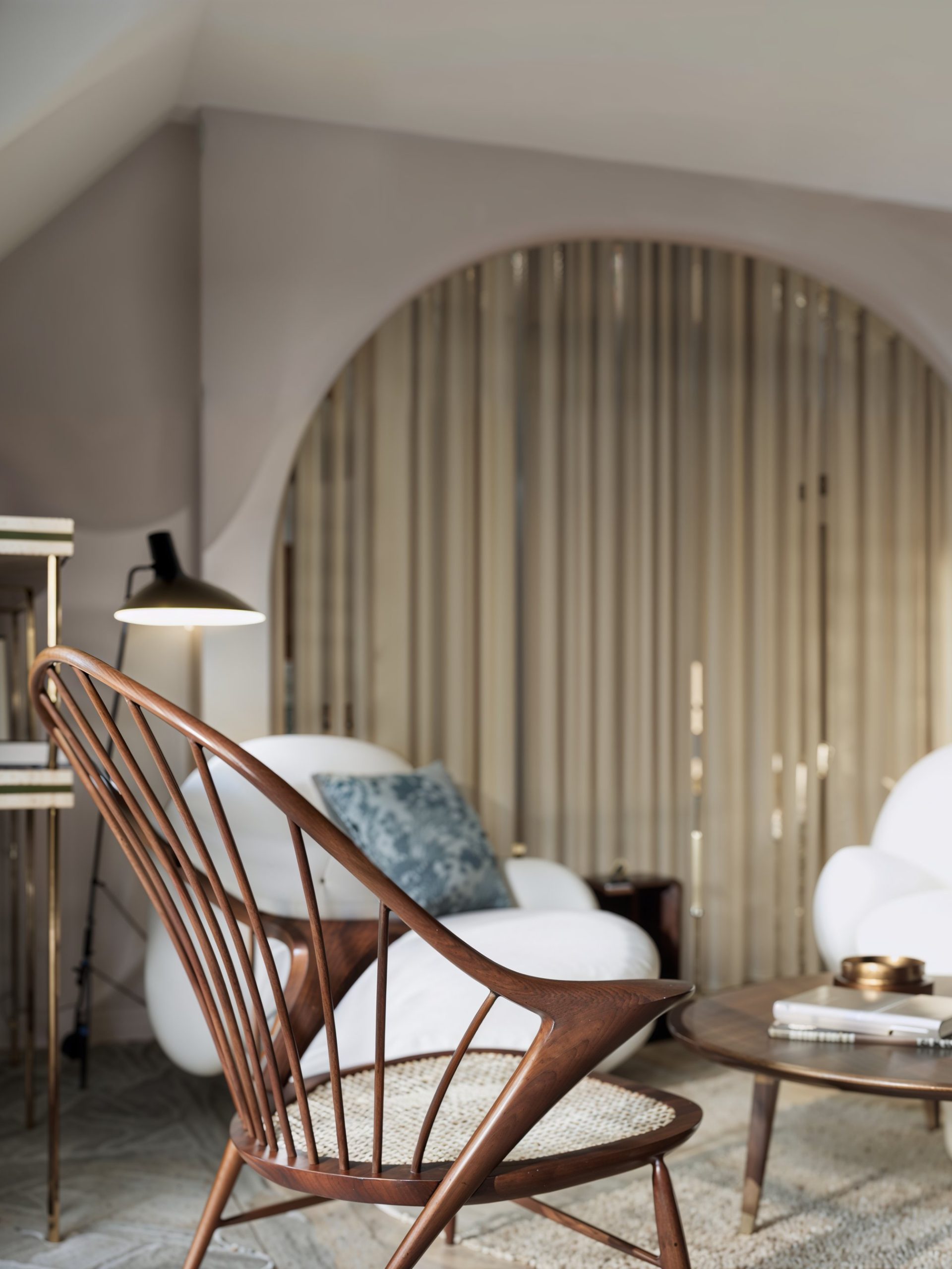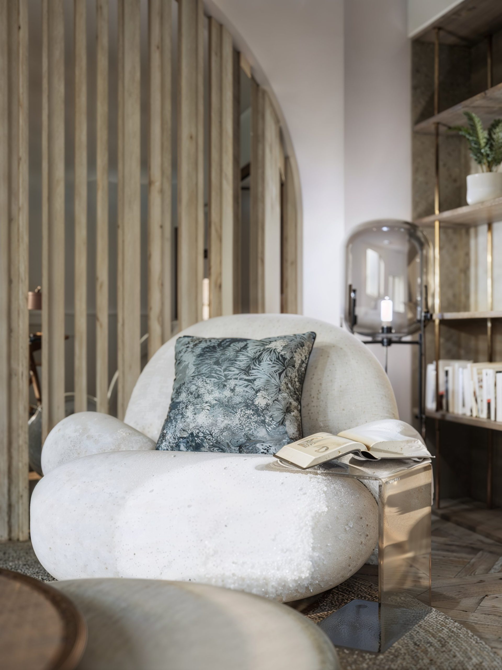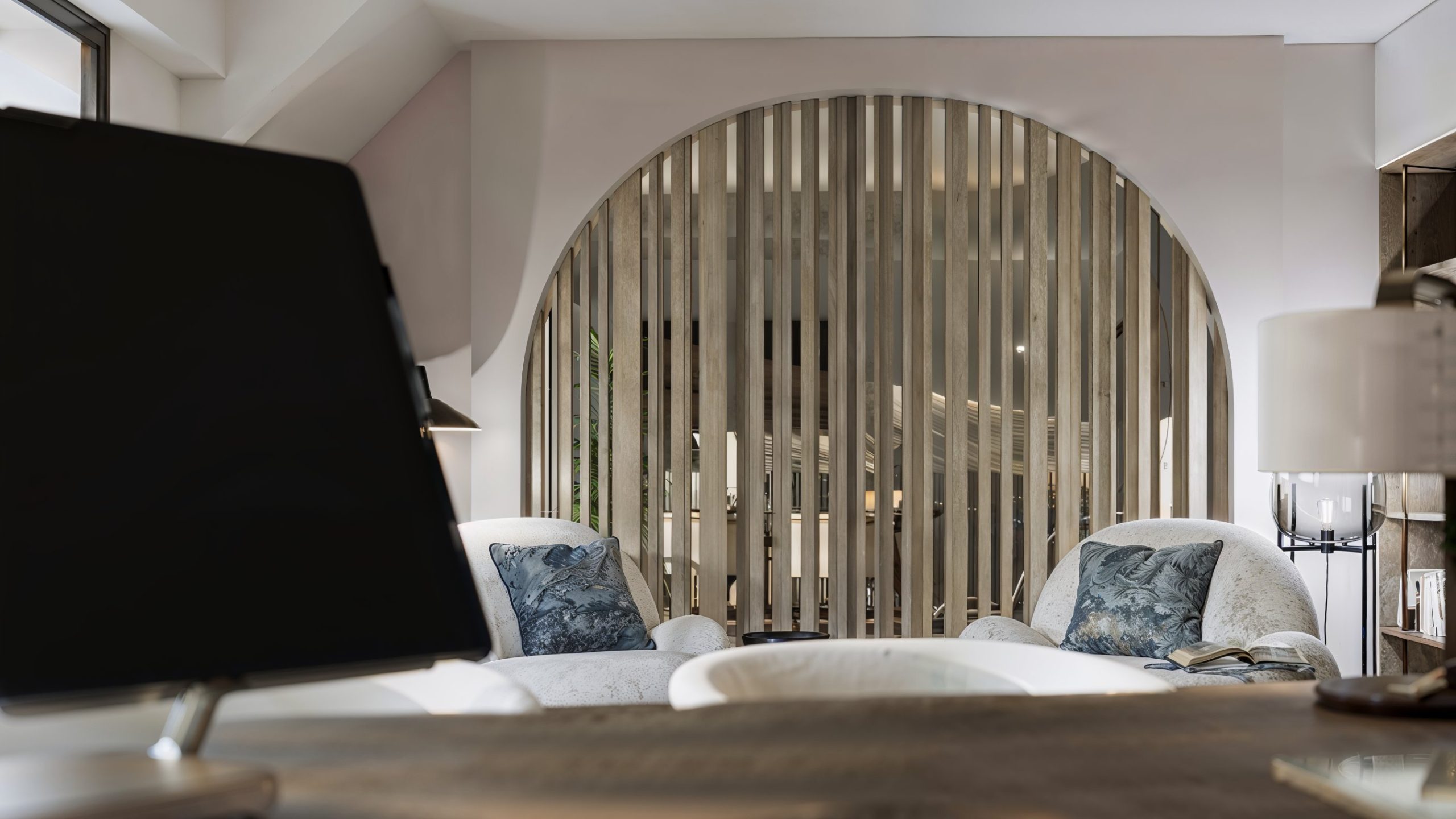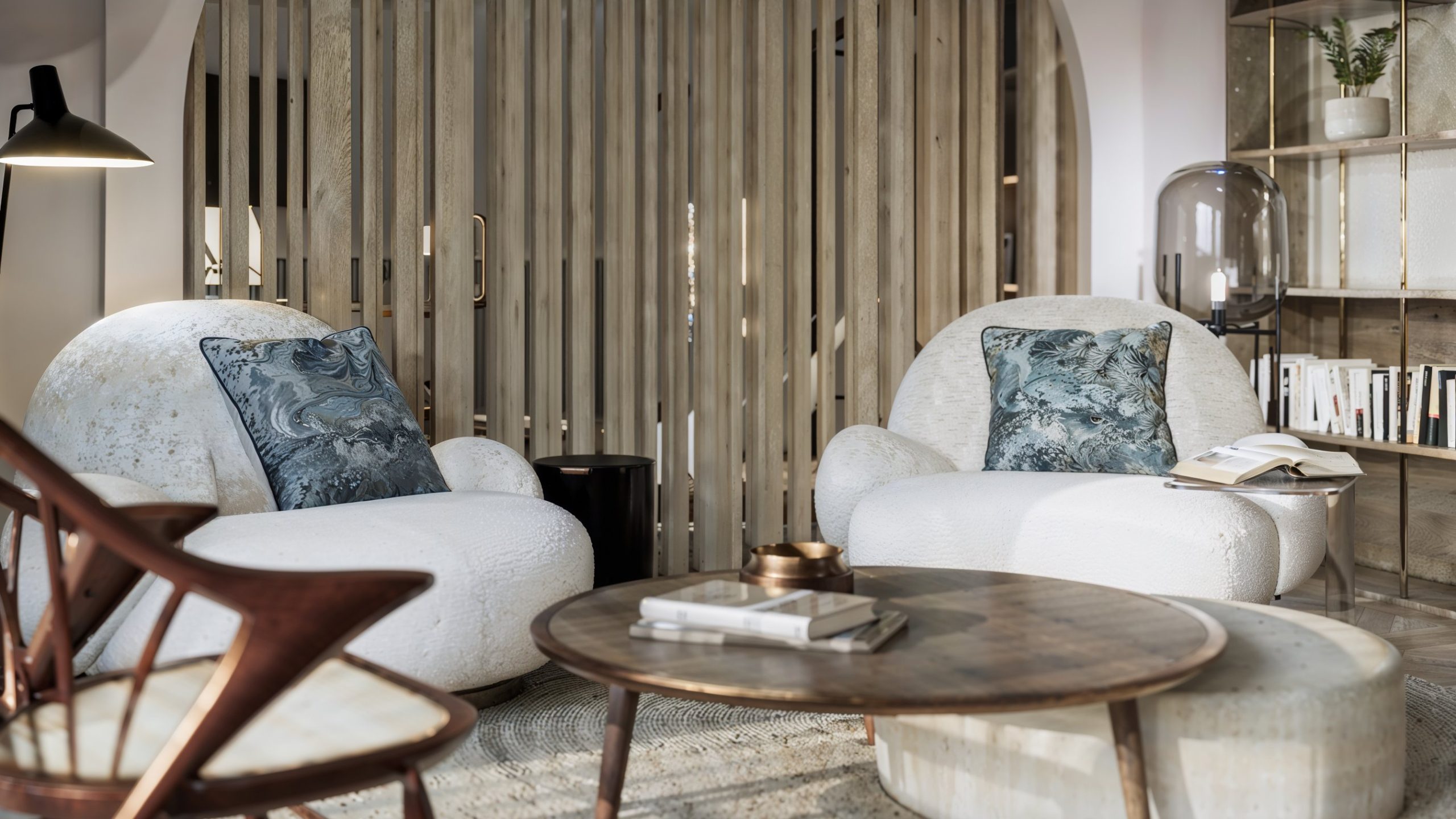 La composition s’organise autour d’un grand volume de réception qui assume un double rôle : recevoir et apaiser. Un espace lounge, traité comme un salon privé, installe immédiatement une atmosphère feutrée : assises généreuses, matières texturées, tables basses aux finitions chaleureuses et lumière douce. La scénographie est structurée par une grande arche filtrée par un claustra vertical en bois, qui laisse circuler la lumière tout en hiérarchisant les perspectives. Ce geste architectural devient la signature du projet : il crée une profondeur, une respiration, et une transition élégante entre les zones publiques et les espaces plus intimes.