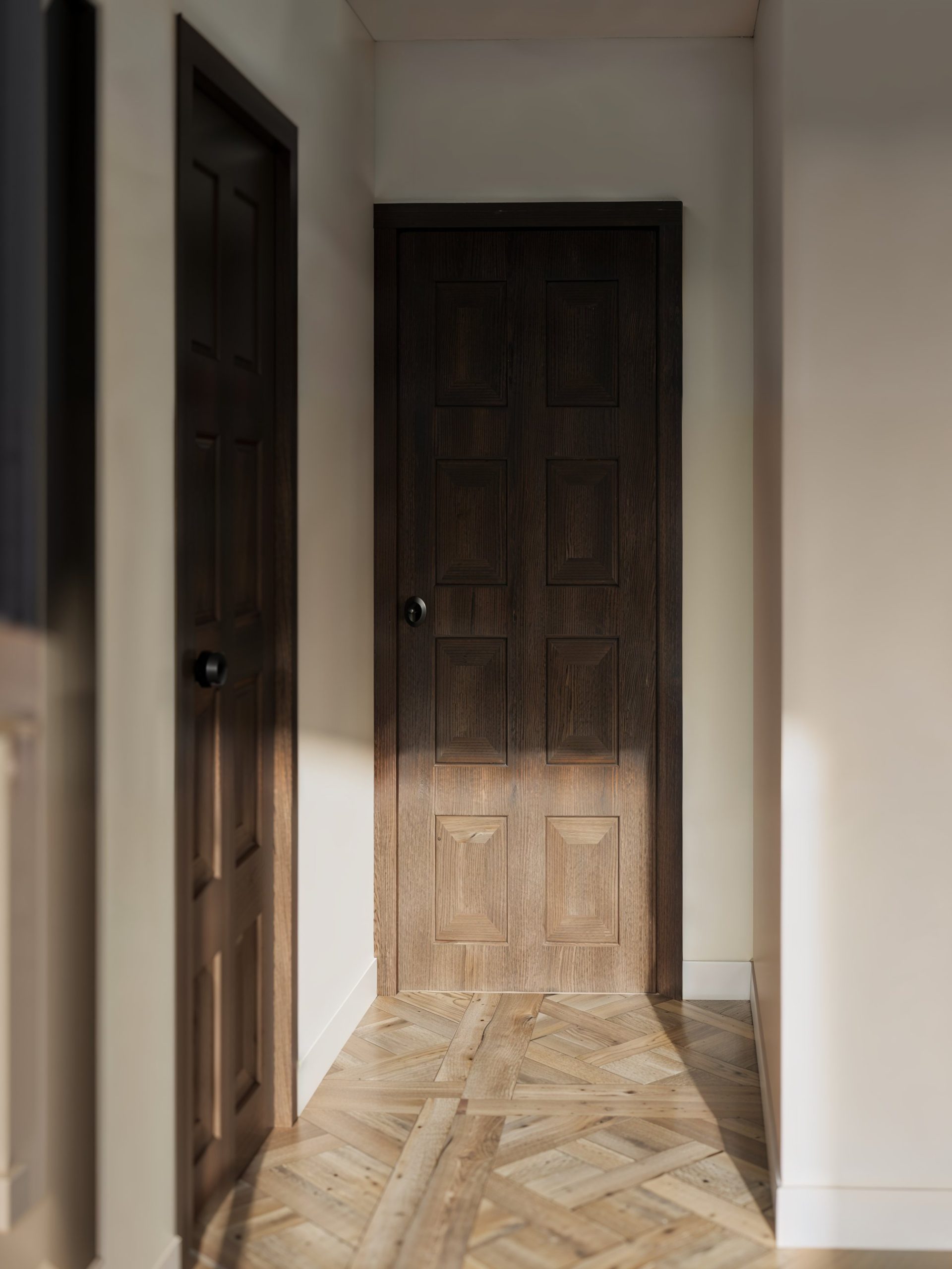 L’entrée, plus contenue, est traitée comme un sas : boiseries sombres, portes à panneaux, et mise en lumière rasante sur un parquet à motif, pour installer d’emblée une sensation de maîtrise. Une console élancée et un grand miroir composent un geste d’accueil, presque cérémoniel, qui guide naturellement vers la réception.