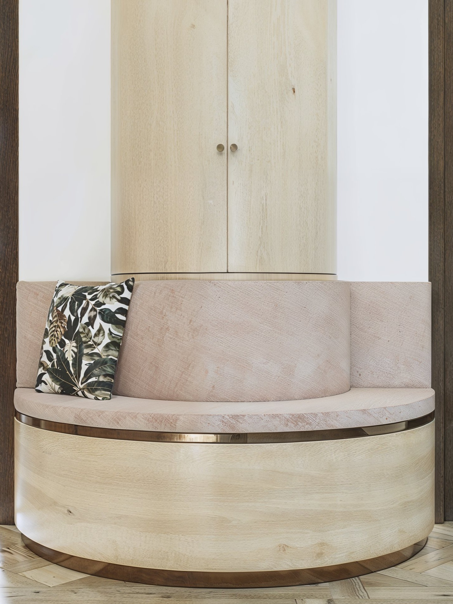 Dans le prolongement, le bureau affirme l’autorité du lieu sans ostentation. Le dessin privilégie la précision : un plateau de travail ample, des assises enveloppantes au galbe maîtrisé, une composition murale graphique, et un soubassement strié qui apporte rythme et relief. Les finitions mêlent bois patiné et détails métalliques discrets, dans une palette volontairement calme — celle d’un cabinet où l’on écoute, où l’on analyse, où l’on décide.