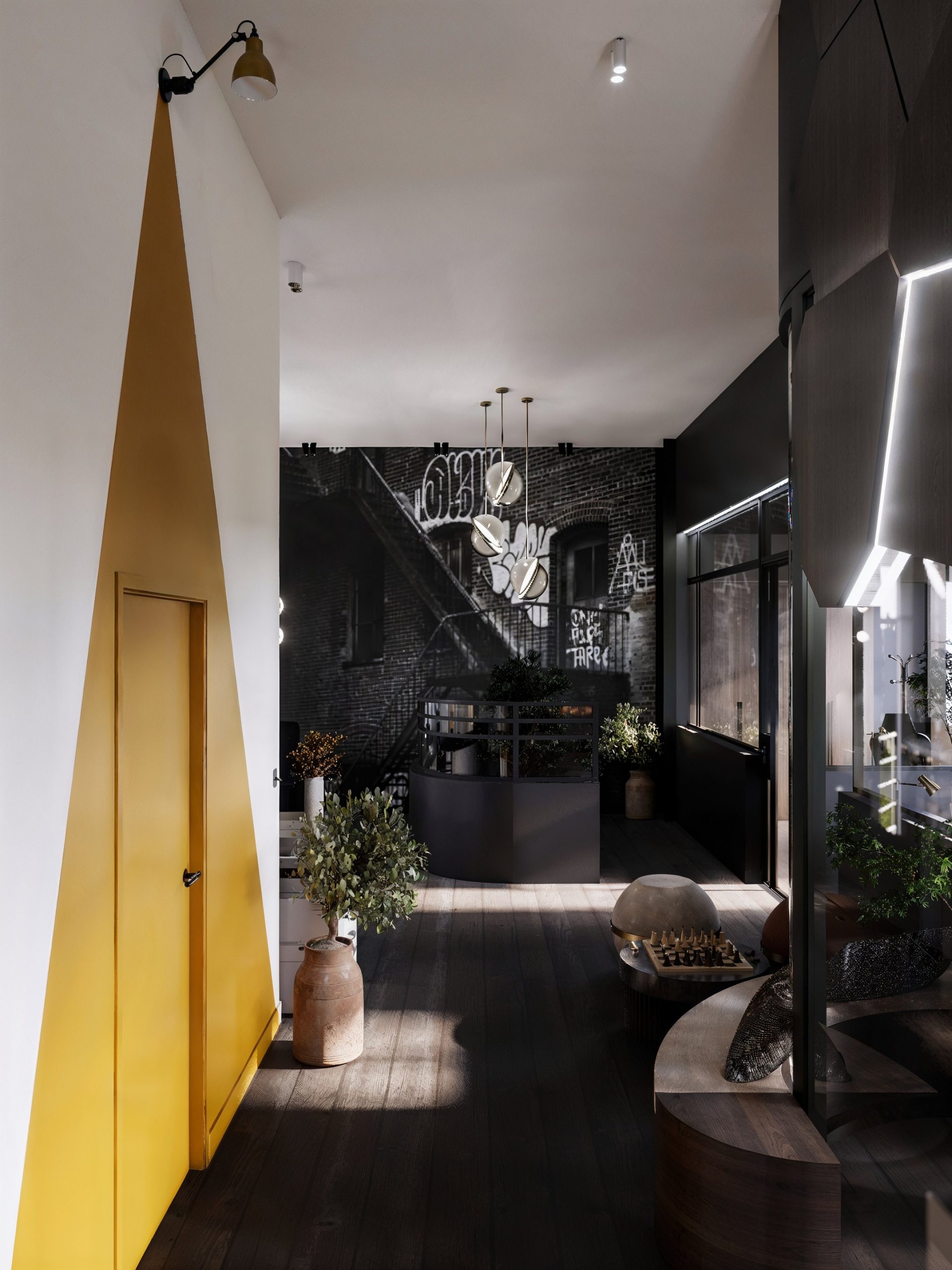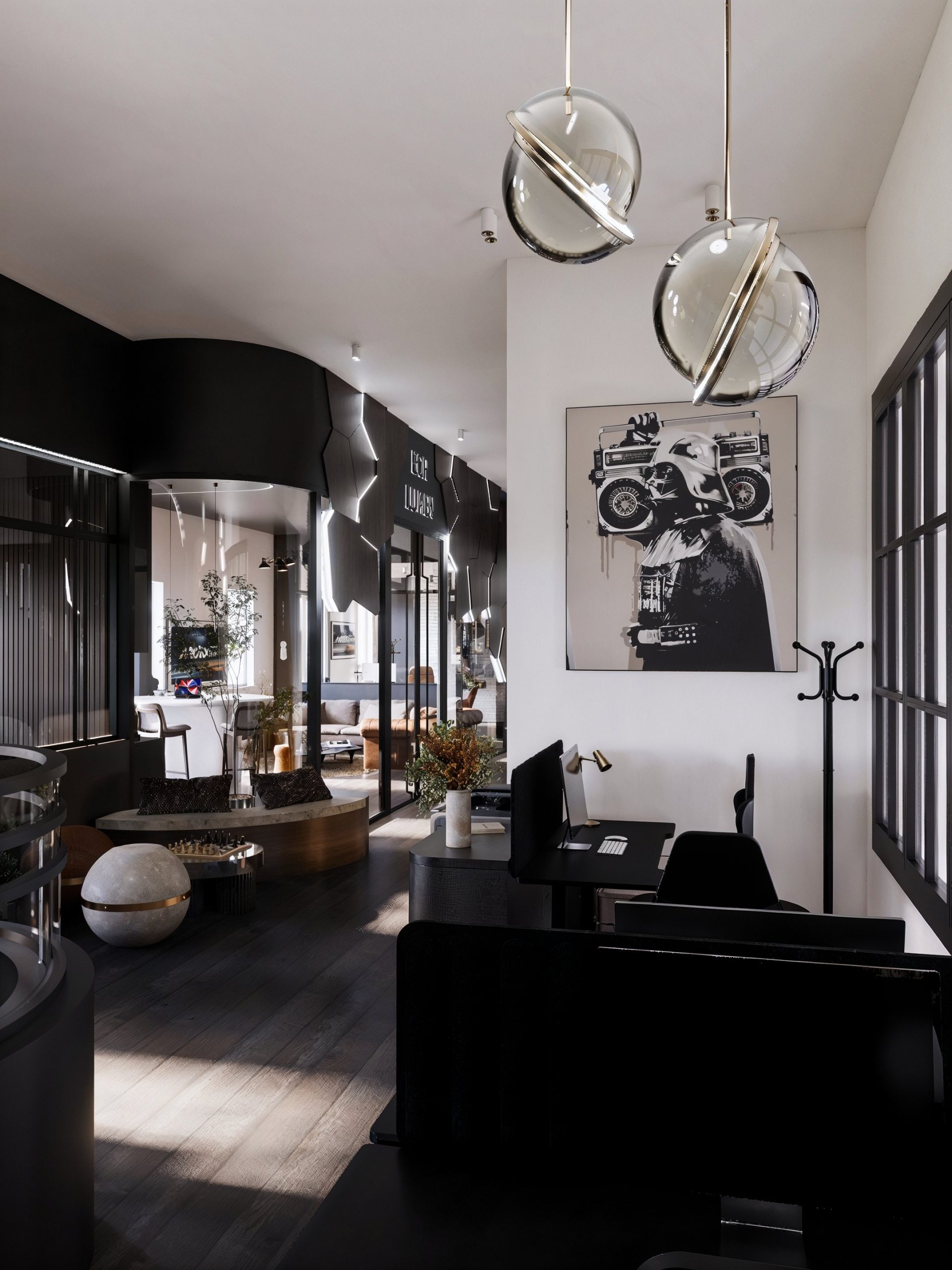 L’architecture d’intérieur y joue un rôle central, magnifiant chaque espace par une approche scénographique audacieuse et une sélection de matériaux d’exception. Dès l’entrée, le visiteur est accueilli par une composition visuelle forte : un jeu d’aplats graphiques en bois rétroéclairés puis dans l’espace principal un revêtement mural noir texturé évoquant les codes du street art prend le relai accompagné de luminaires sculpturaux qui viennent ponctuer l’espace. Le ton est donné : ici, le design est au service de l’identité.