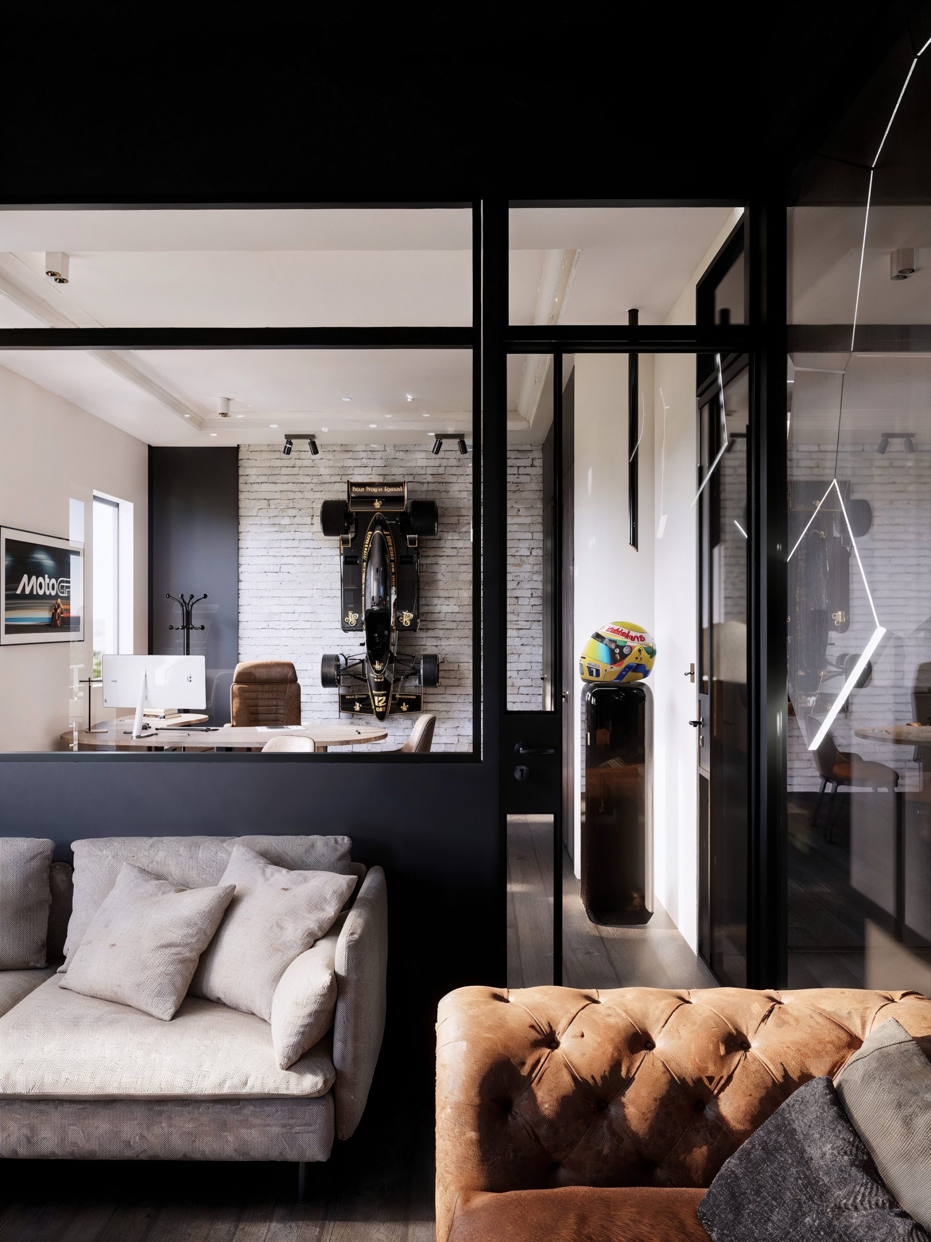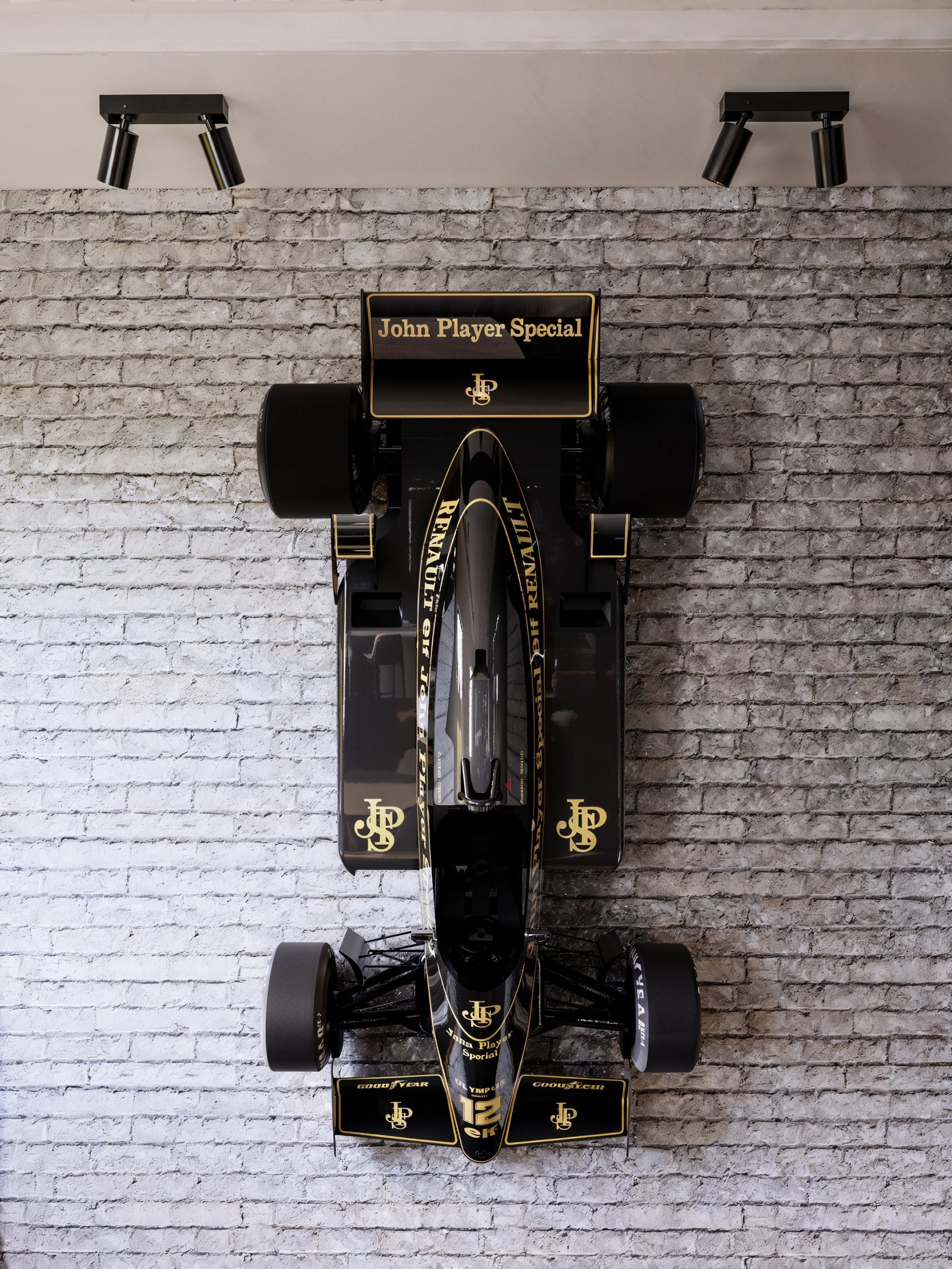 Chaque pièce raconte une histoire. Le bureau du dirigeant, avec sa monoplace de Formule 1 suspendue au mur et ses bibliothèques habillées de bois sombre, exprime une passion assumée pour l’excellence et la vitesse. La salle de réunion, quant à elle, affirme une présence forte avec son mur de briques blanches habillé d’une carte du monde en bois naturel.