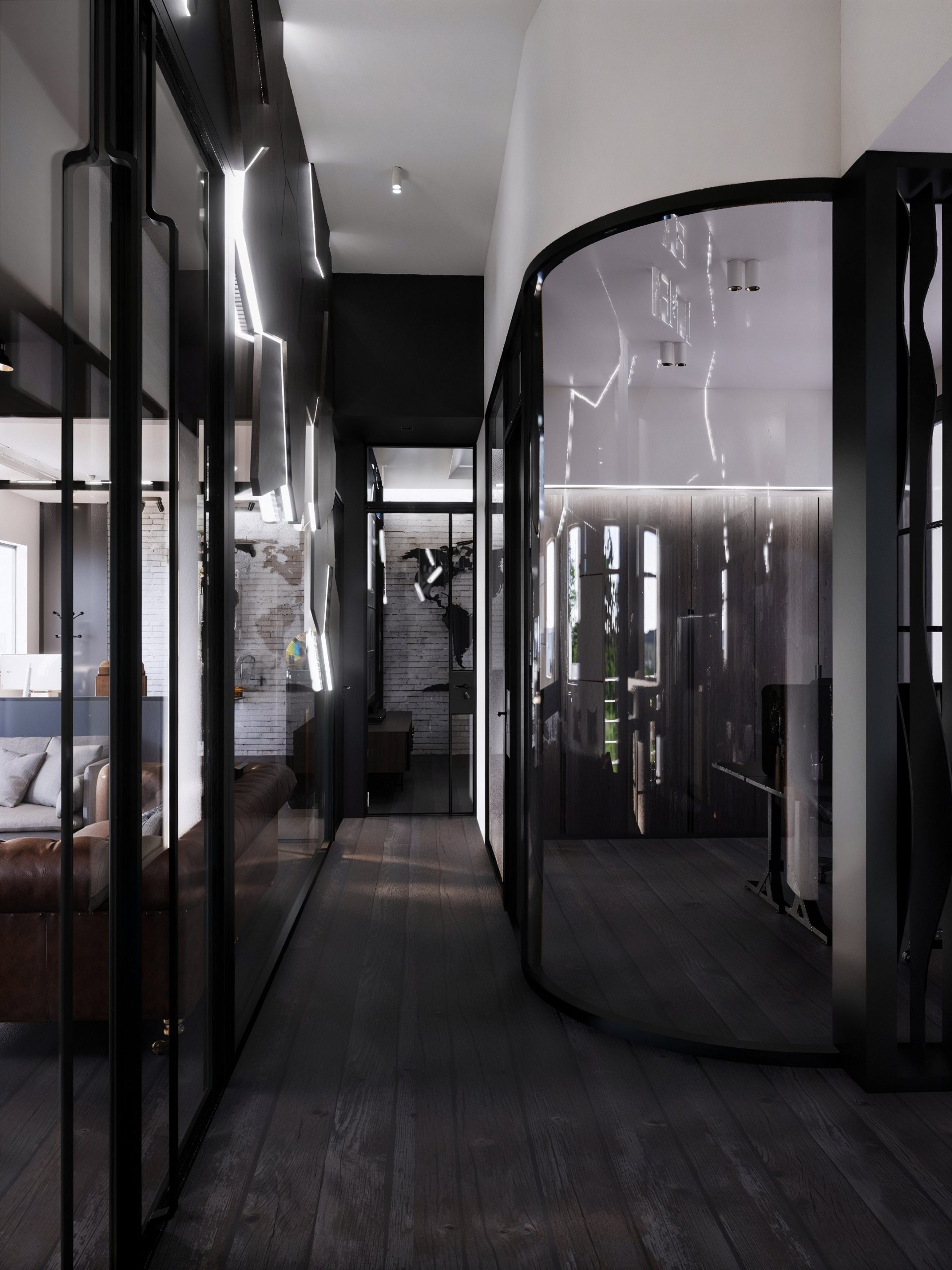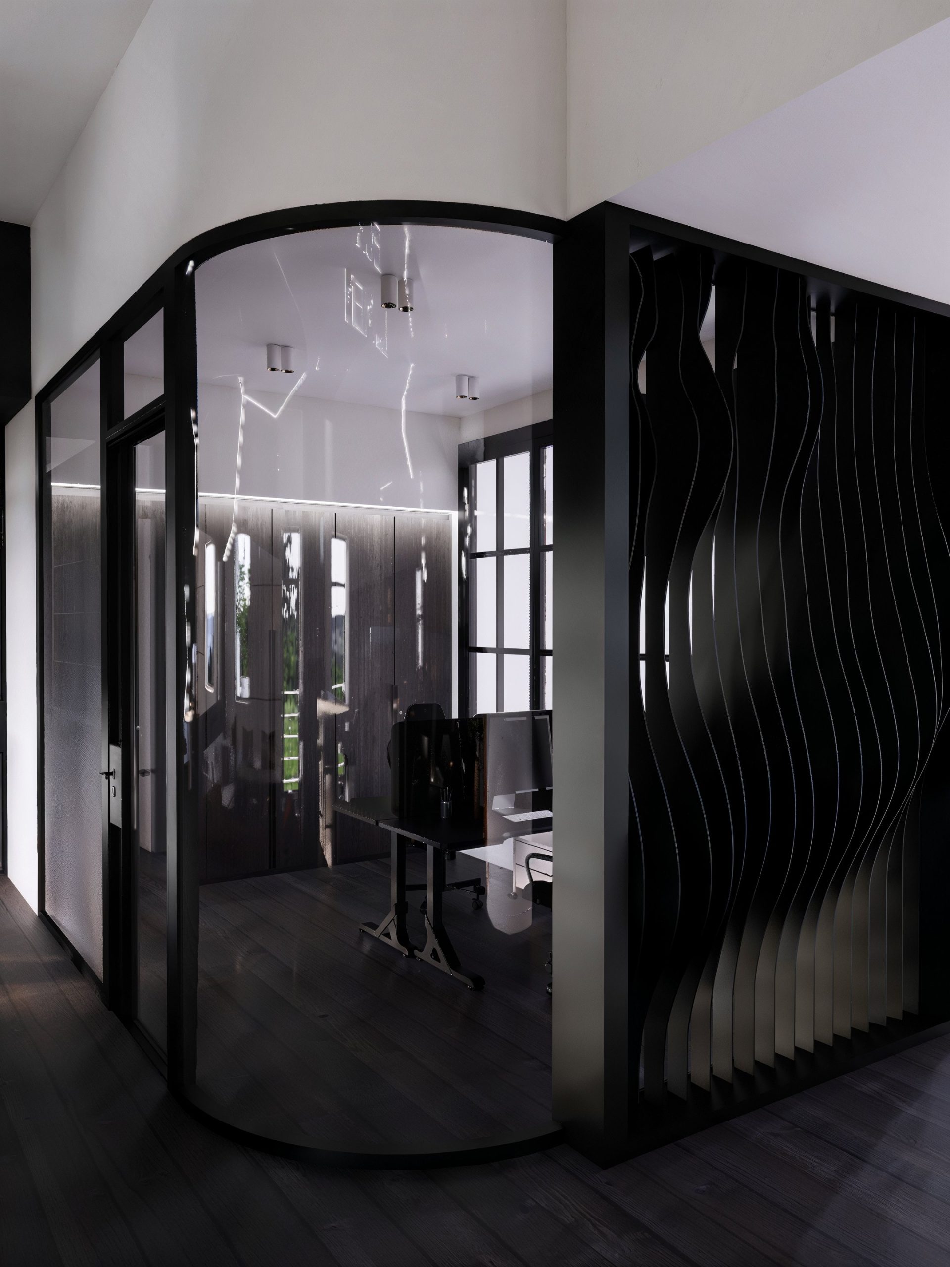 Les cloisons courbes en verre dessinent des circulations fluides, tout en préservant l’intimité des zones de travail. À chaque détour, la lumière est travaillée avec précision – intégrée dans les parois, suspendue en compositions géométriques, ou diffusée depuis des corniches élégamment tendues.