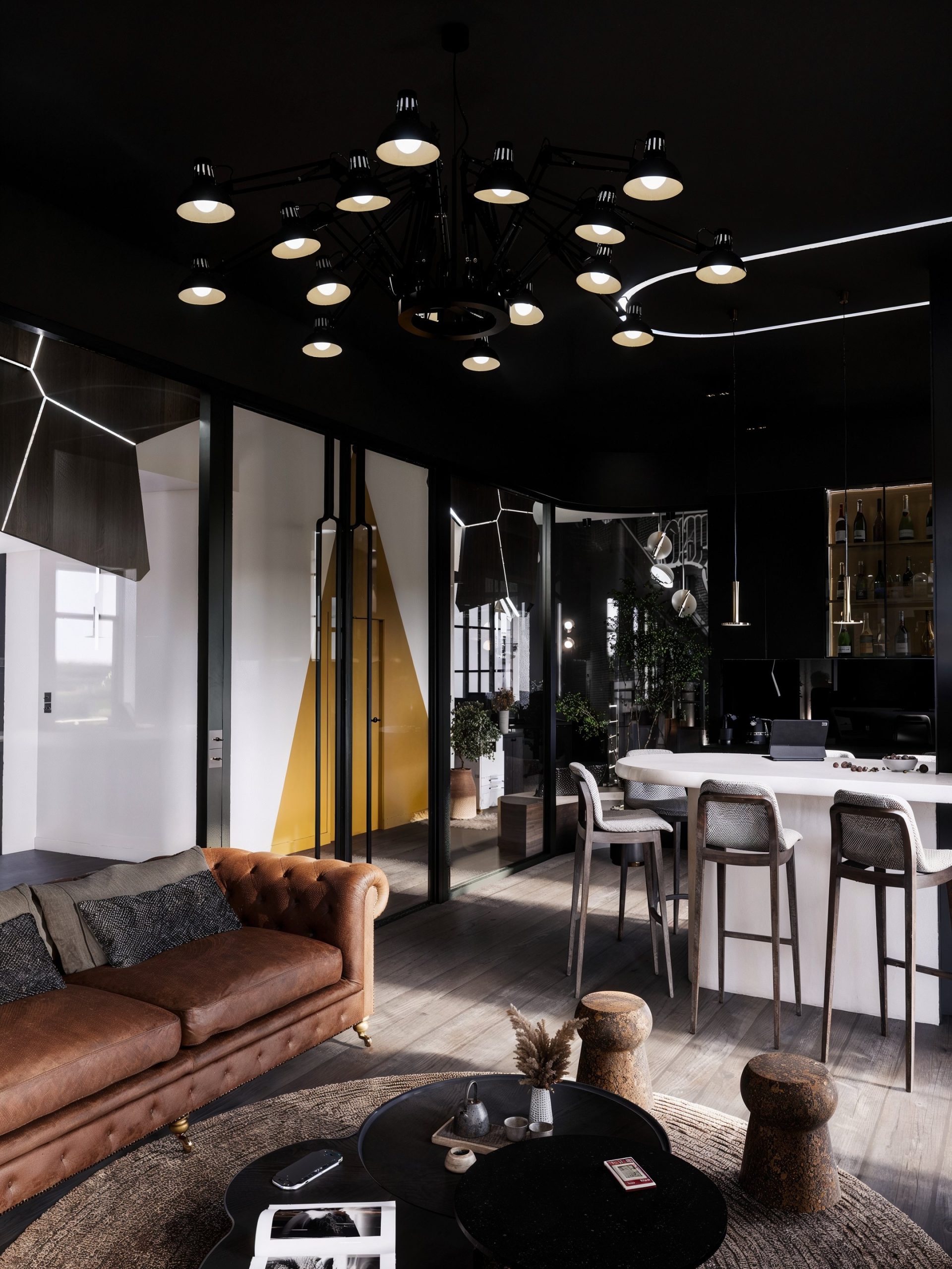 Le cœur du projet réside dans son espace lounge : un lieu hybride où se mêlent salle de réunion informelle, cuisine haut de gamme, espace mange-debout central et salon chaleureux. Canapés en cuir patiné, banquettes sur mesure, objets vintages et touches contemporaines créent une ambiance feutrée et inspirante. Loin des open spaces impersonnels, cet espace incarne un mode de travail qui valorise l’humain et le collectif.
