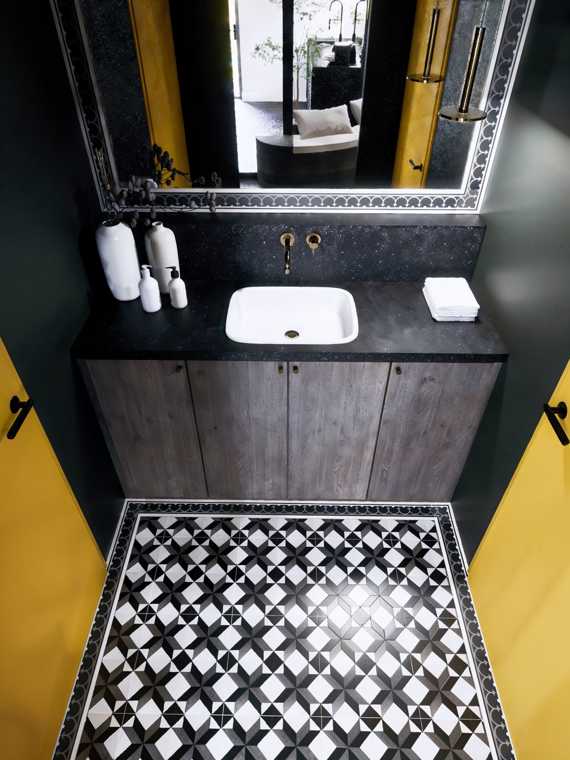 Dans tous les espaces, la rigueur des lignes contraste subtilement avec la douceur des matières. Bois noircis, velours, métal brossé, béton ciré : chaque matériau est choisi pour sa densité visuelle et son intemporalité.