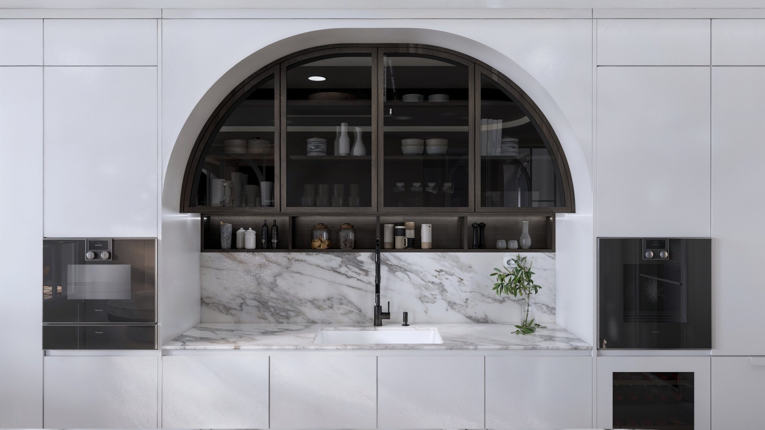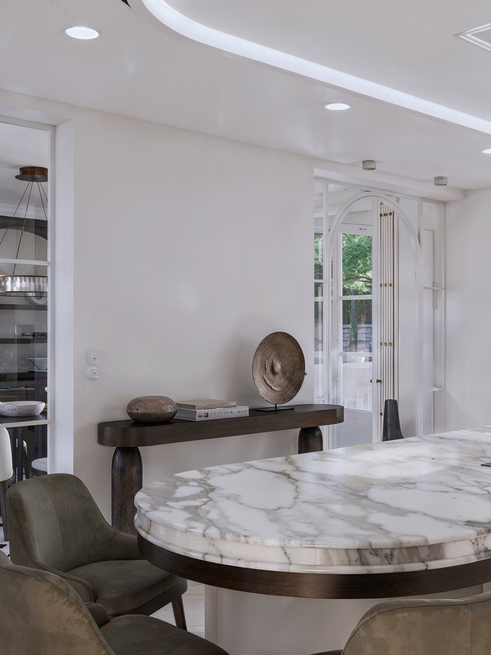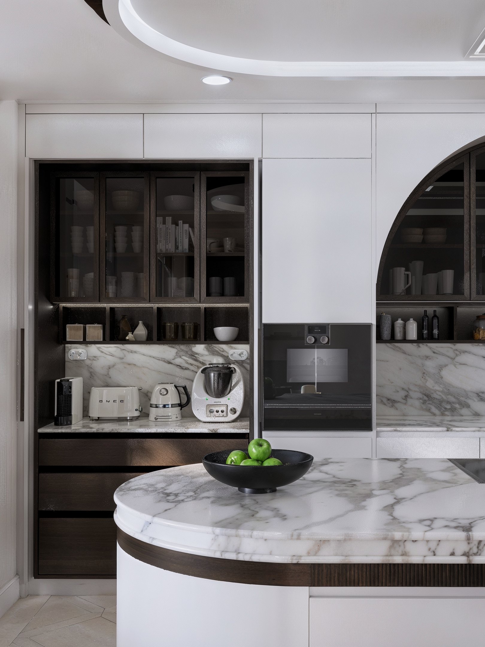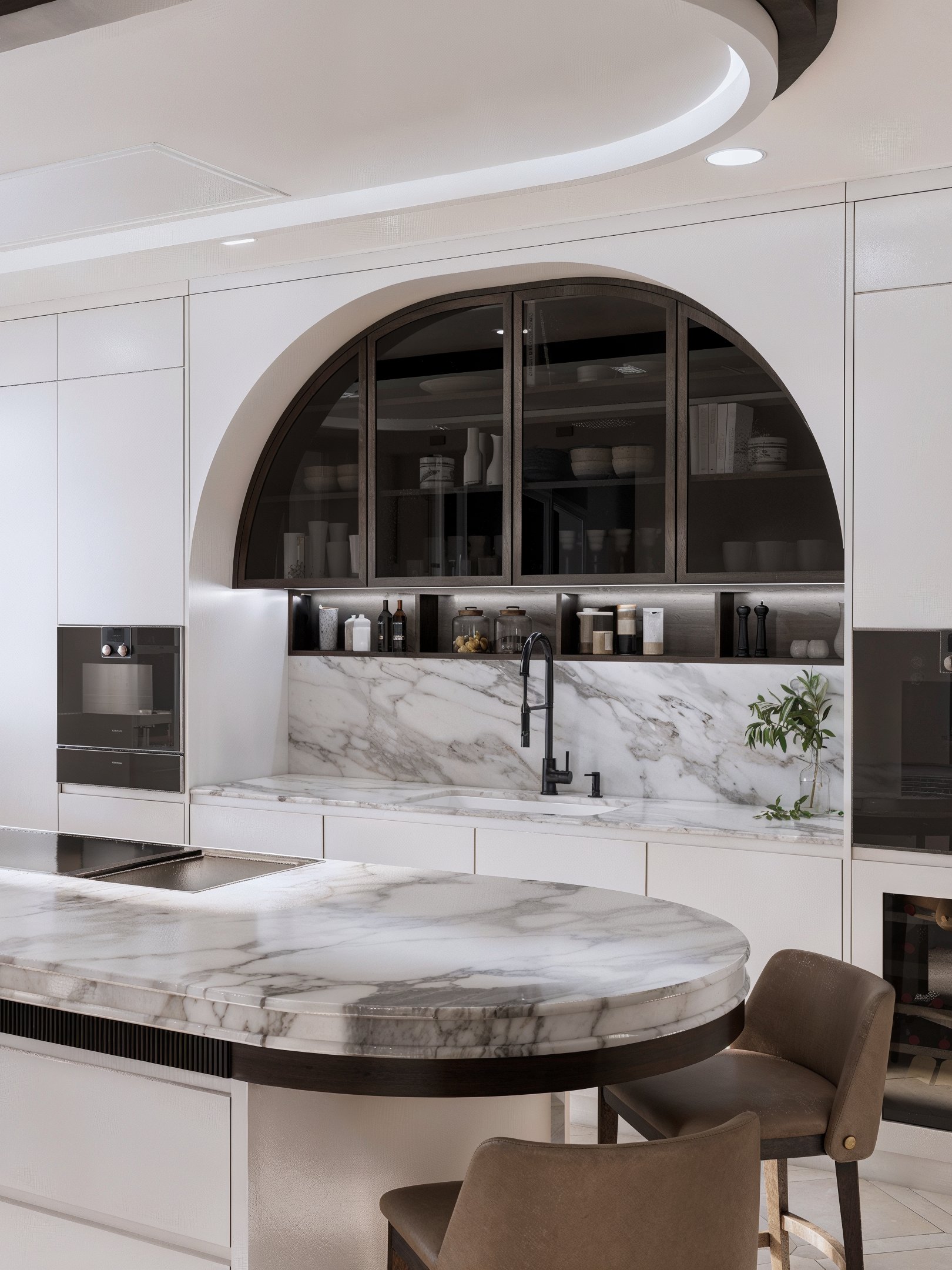 La cuisine s’organise autour d’un grand linéaire épuré, animé par une niche monumentale en arc, traitée en bois sombre et vitrages fumés. À l’intérieur, les étagères mettent en scène la vaisselle comme une collection, tandis qu’un bandeau lumineux souligne les objets et structure la perspective. Les façades blanches, d’une sobriété presque silencieuse, laissent la vedette au marbre veiné qui se déploie en crédence et en plan de travail, ponctué d’une robinetterie noire, fine et précise. Au centre, l’îlot ovale — sculptural — devient un véritable mobilier : courbe généreuse, chant en pierre, détail de ceinture en bois rainuré, et plateau conçu pour recevoir autant que pour cuisiner.