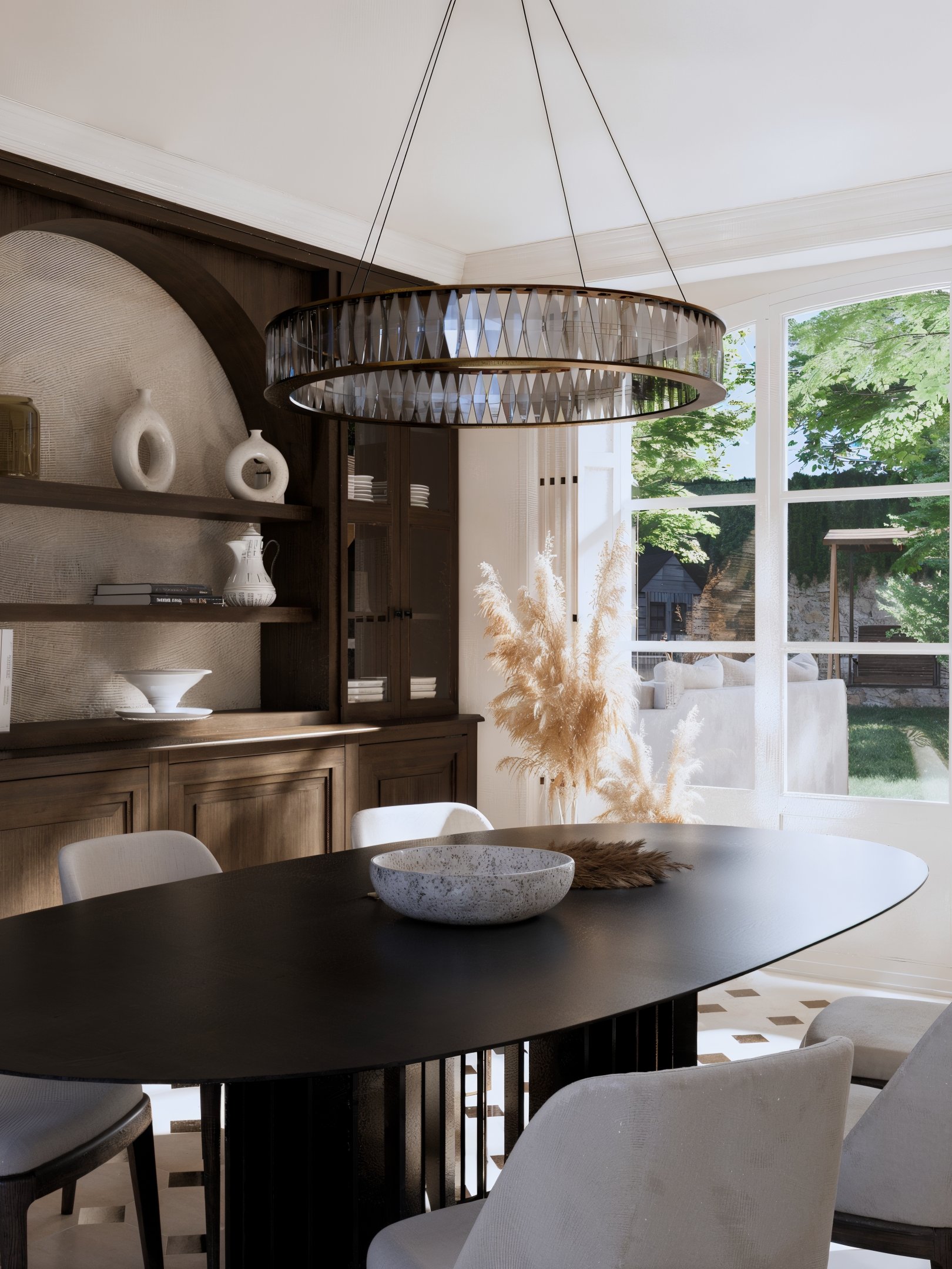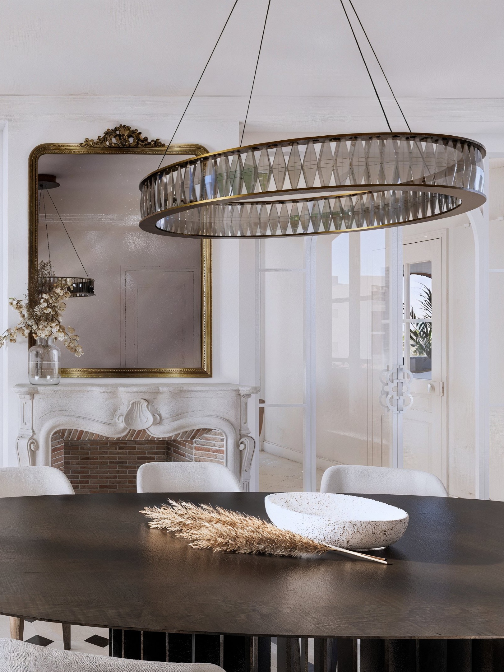 La salle à manger prolonge cette composition avec une atmosphère plus patrimoniale, mais parfaitement réinterprétée. Une cheminée en pierre et un grand miroir ancien apportent une noblesse naturelle, contrebalancée par une table ovale aux lignes tendues et un luminaire circulaire, comme un bijou suspendu. En fond, une bibliothèque sur mesure en bois sombre reprend le motif de l’arche : elle ancre la pièce, crée du relief, et transforme un simple mur en décor architectural.