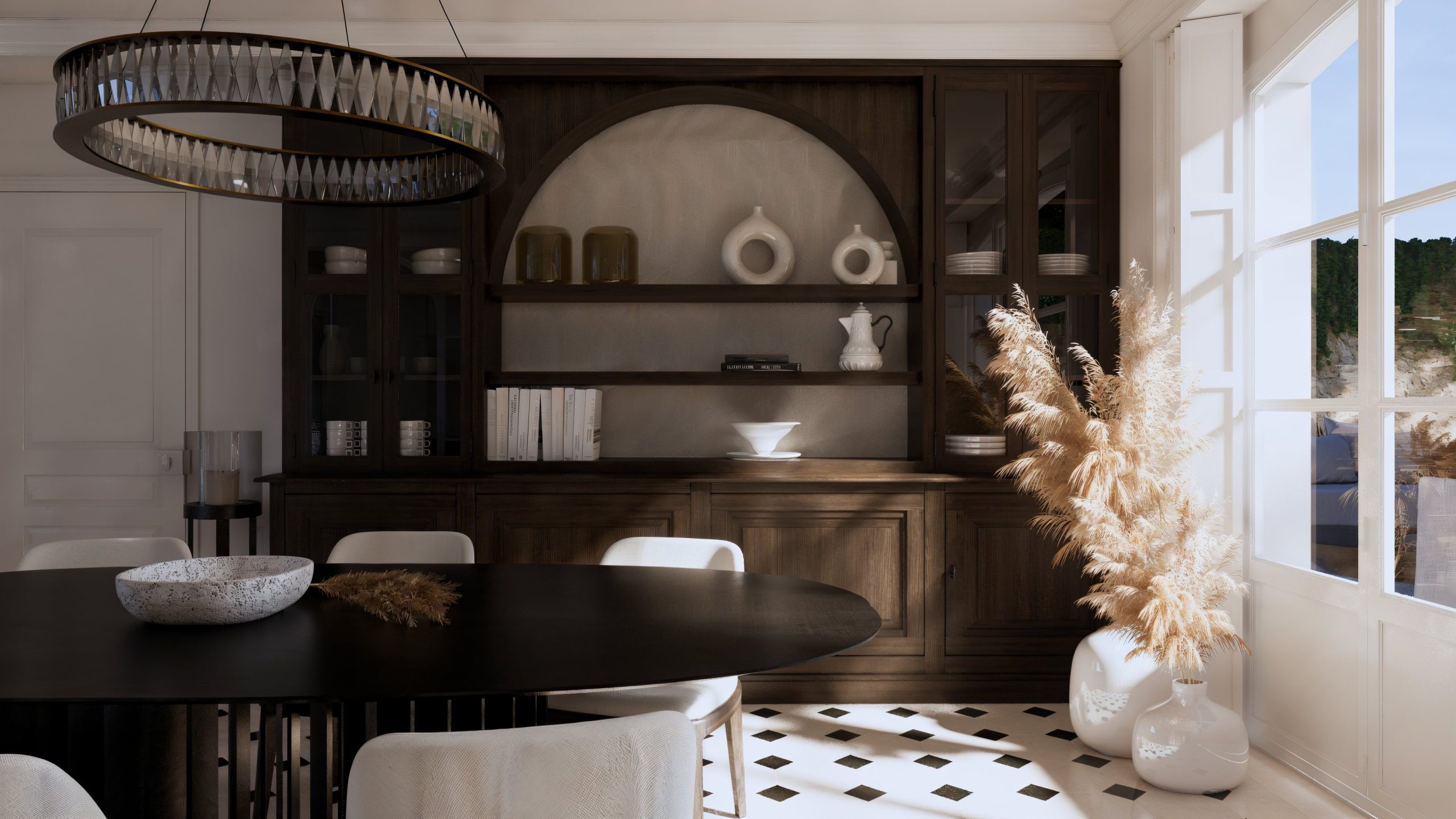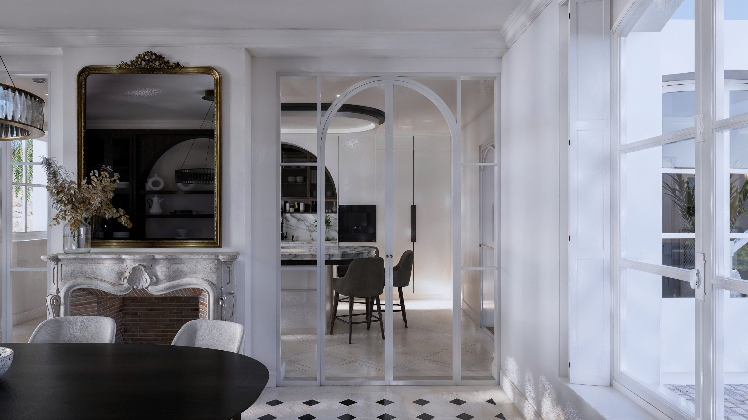 L’intention architecturale repose sur une idée simple : adoucir. Adoucir les angles, les circulations, les transitions. Les volumes sont rythmés par un jeu d’arches — vitrées, structurantes, presque graphiques — qui laissent passer la lumière tout en hiérarchisant les espaces. Cette transparence crée une profondeur rare : depuis la salle à manger, le regard traverse les verrières, glisse sur les marbres et vient accrocher la scénographie de la cuisine.