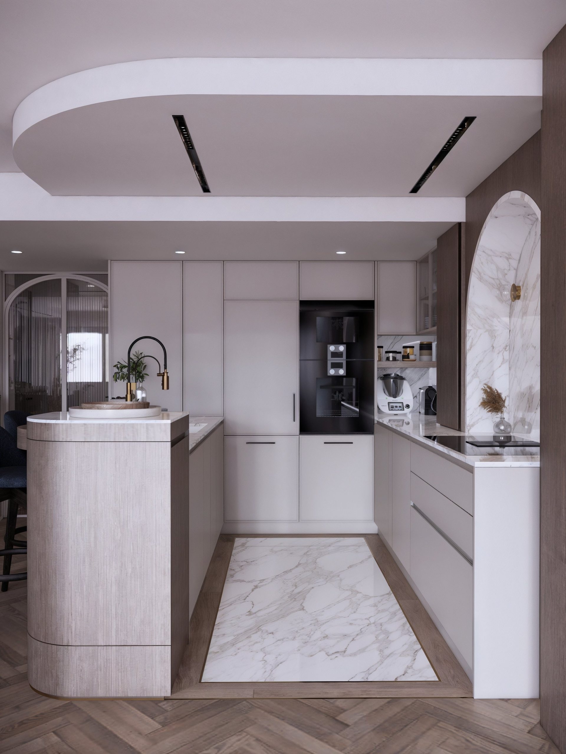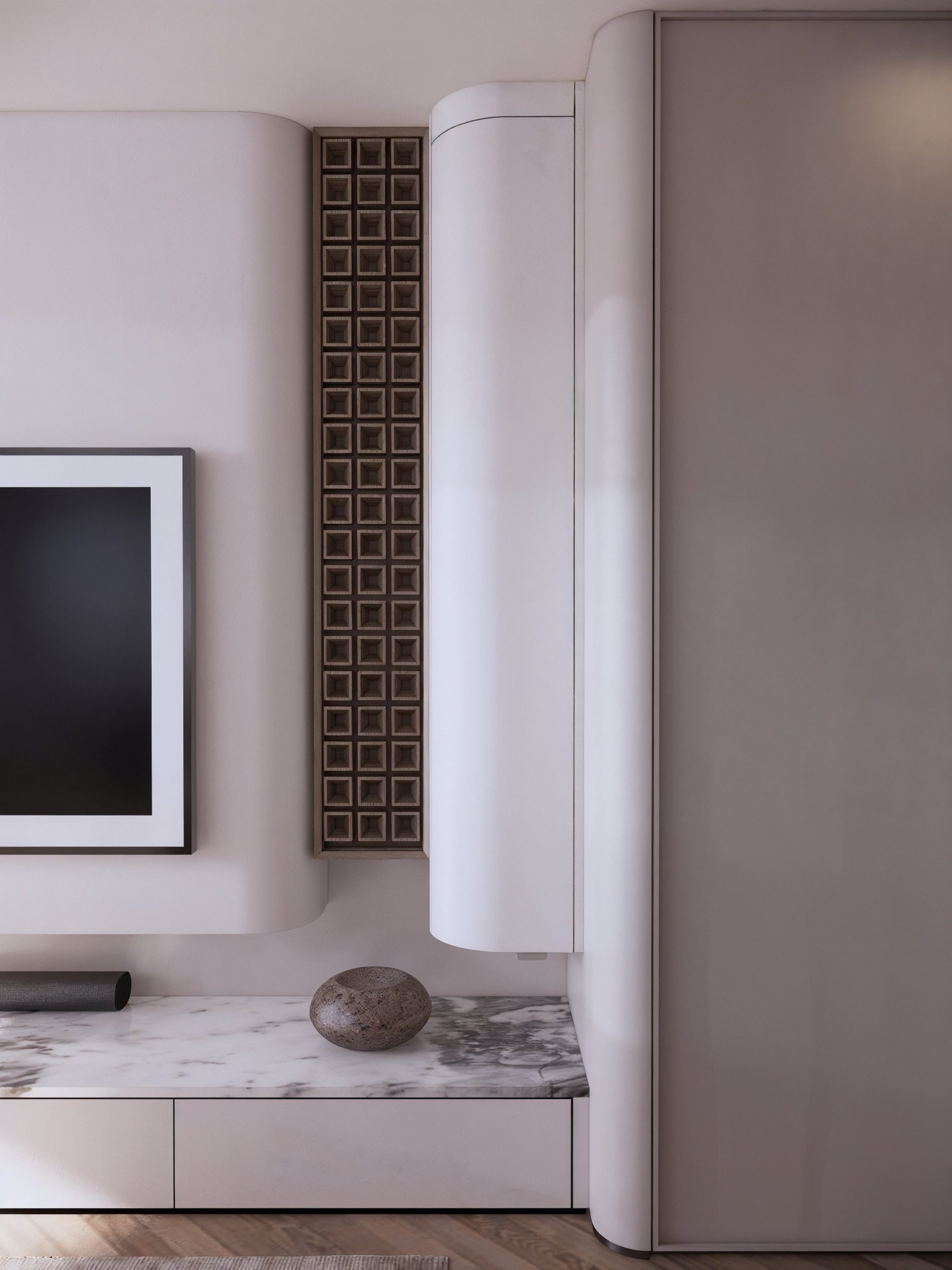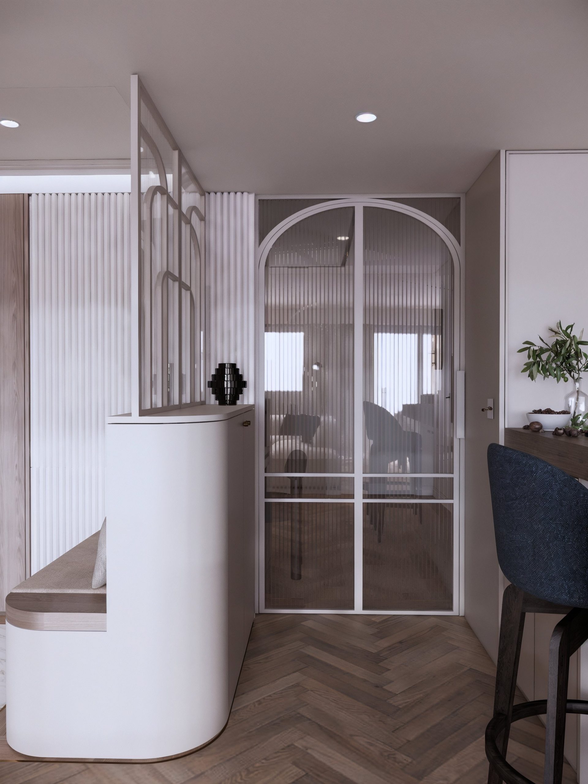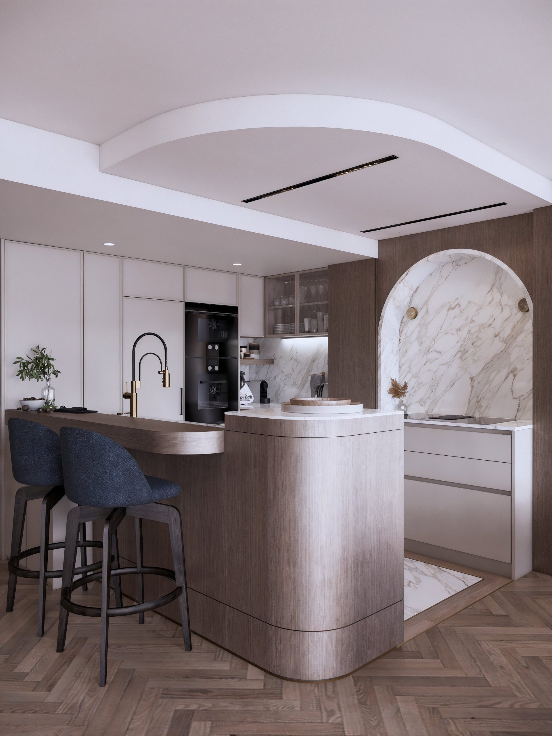 The kitchen, in particular, stands as a sculptural centerpiece. Its rounded forms echo the curves of the ceiling and the chevron-patterned wooden flooring, creating a dialogue between horizontal and vertical elements. Architectural frames—arched openings, integrated niches, and textural partitions—define the transitions and establish a hierarchy of functions.