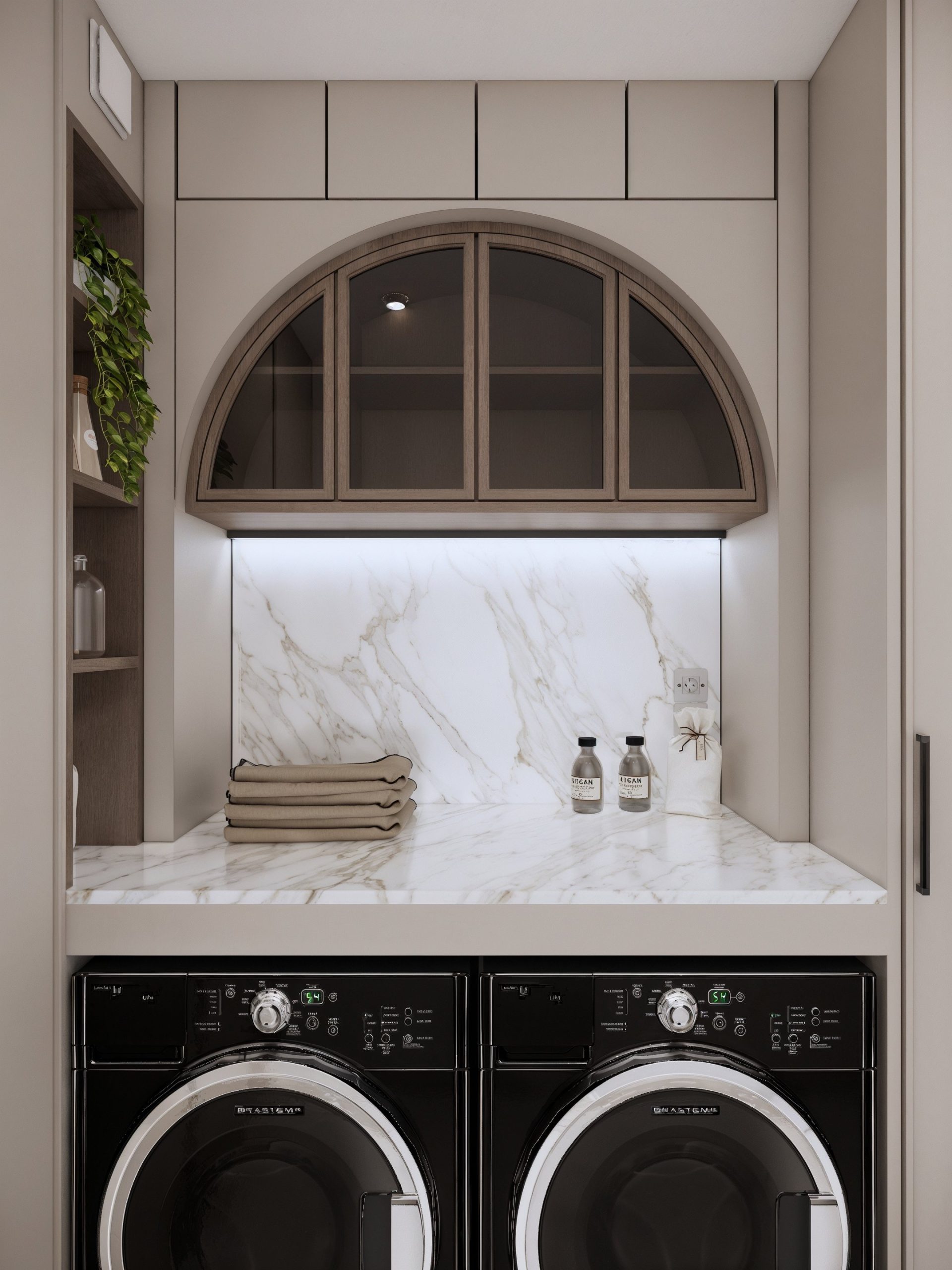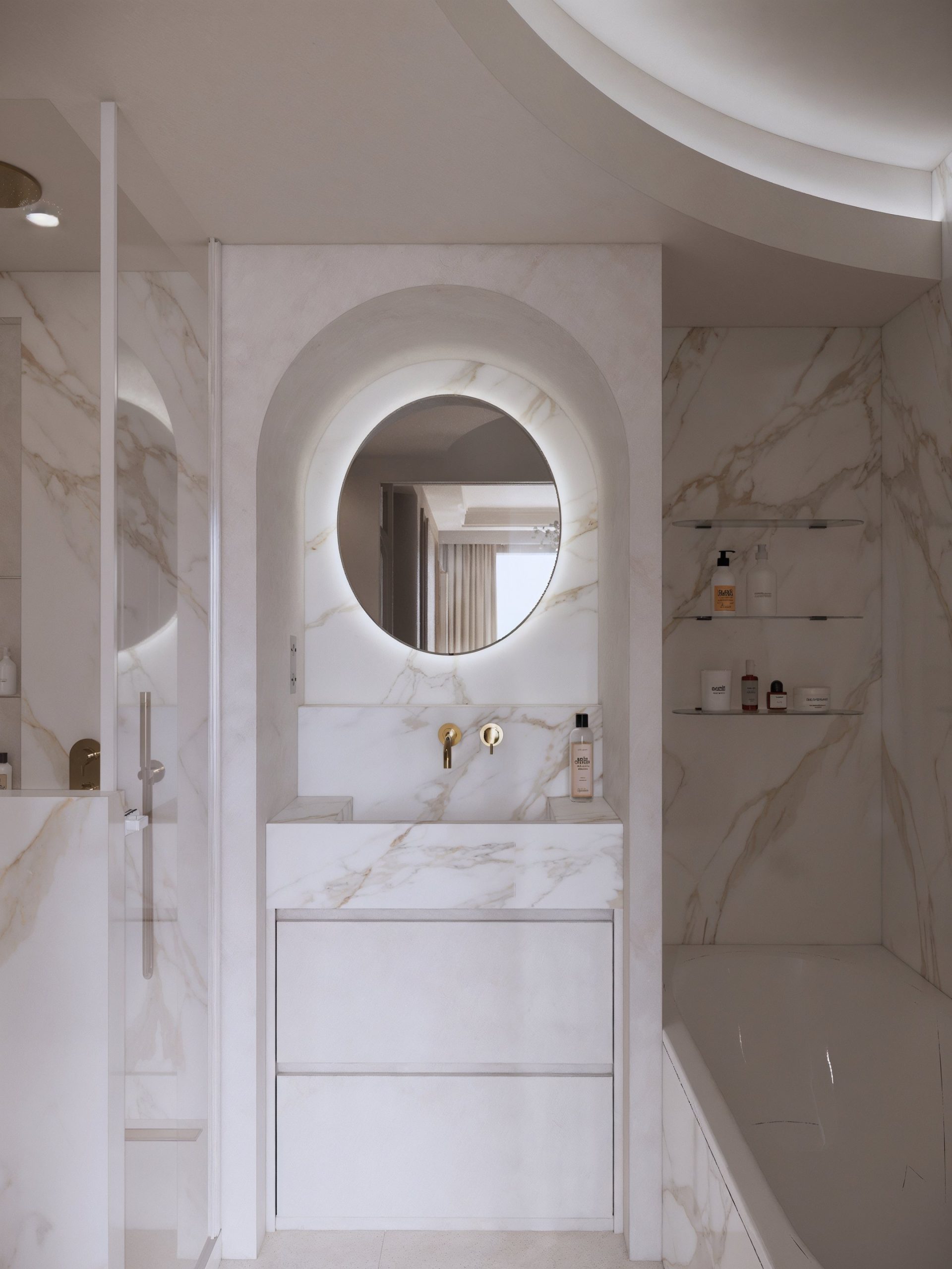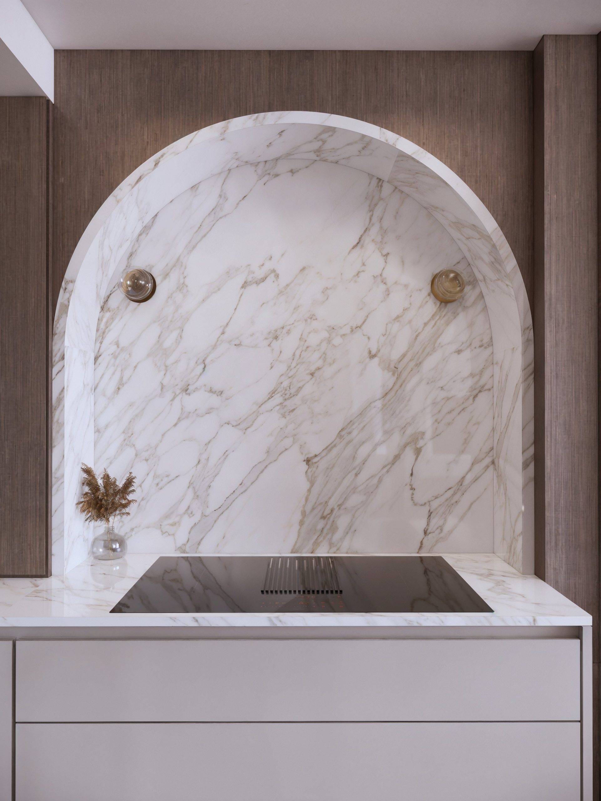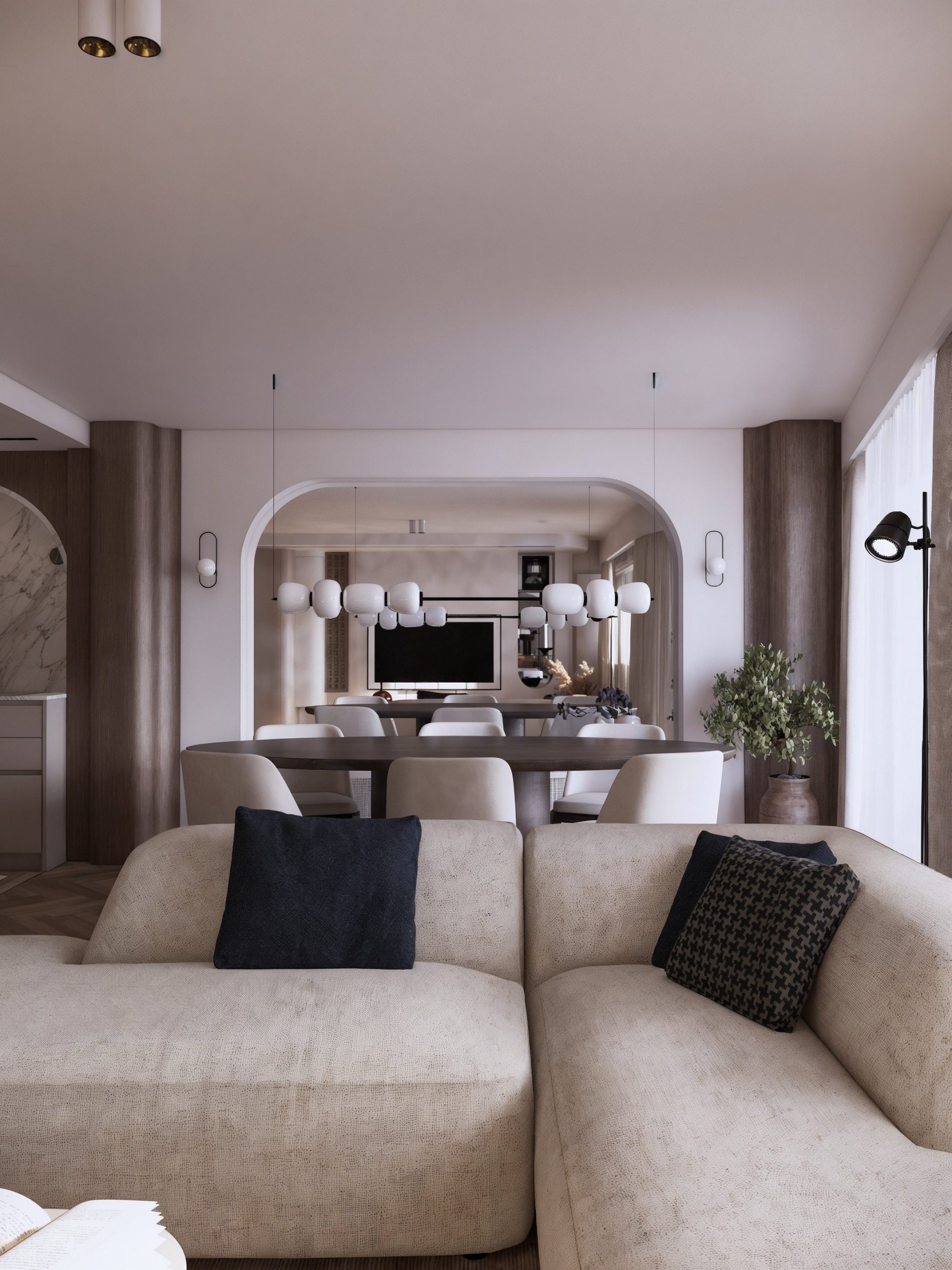 The kitchen, in particular, stands as a sculptural centerpiece. Its rounded forms echo the curves of the ceiling and the chevron-patterned wooden flooring, creating a dialogue between horizontal and vertical elements. Architectural frames—arched openings, integrated niches, and textural partitions—define the transitions and establish a hierarchy of functions.