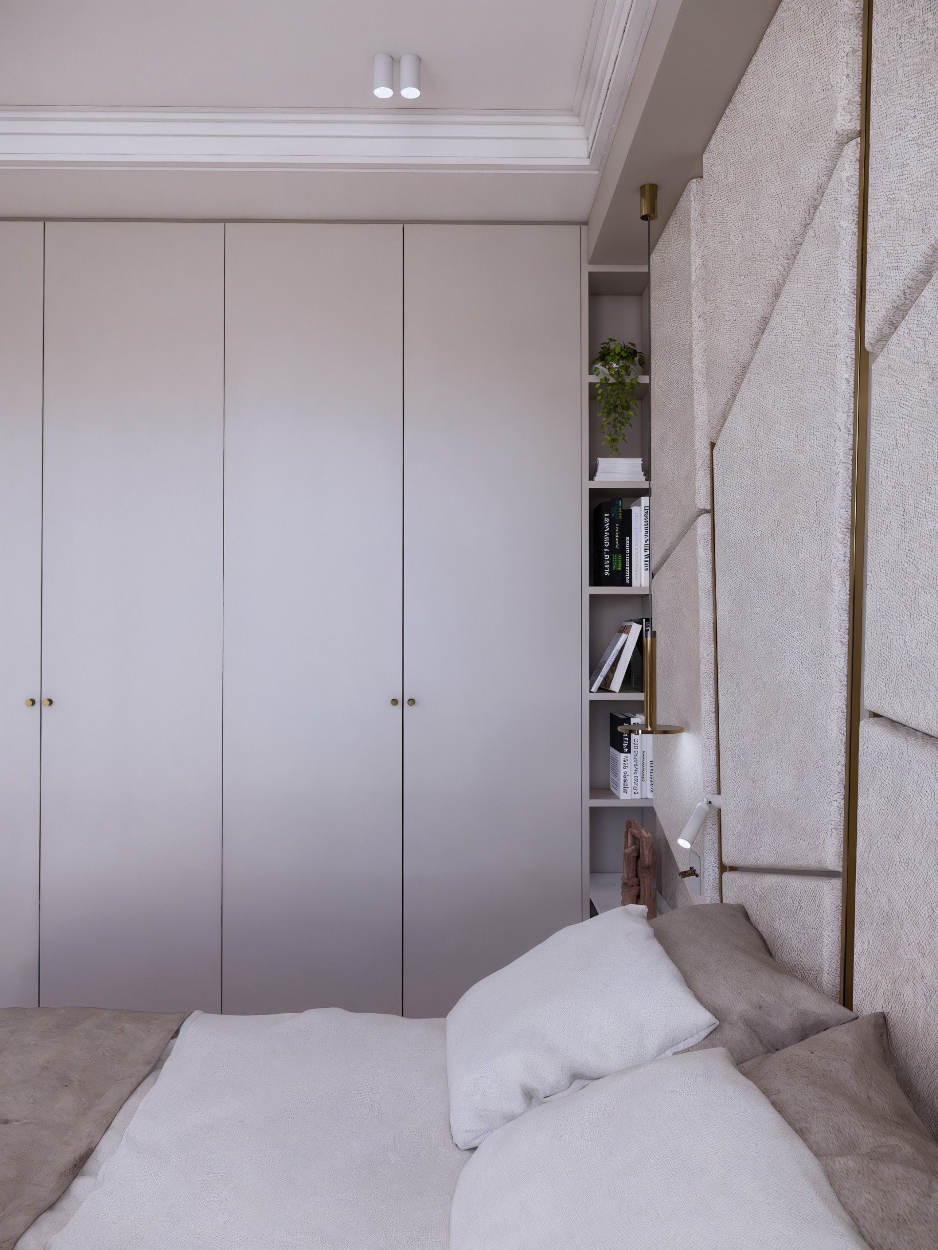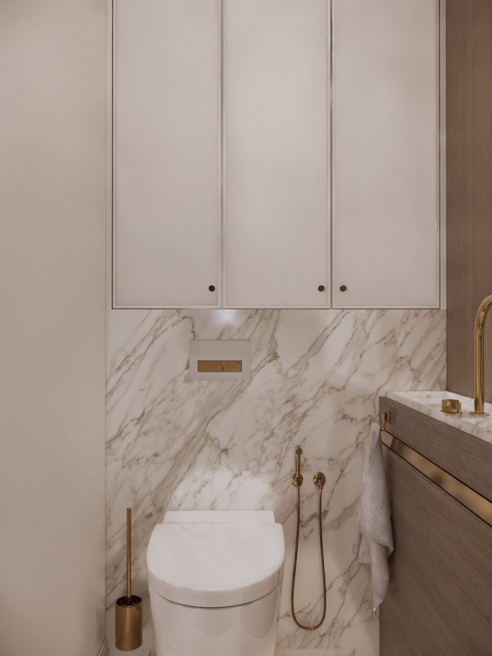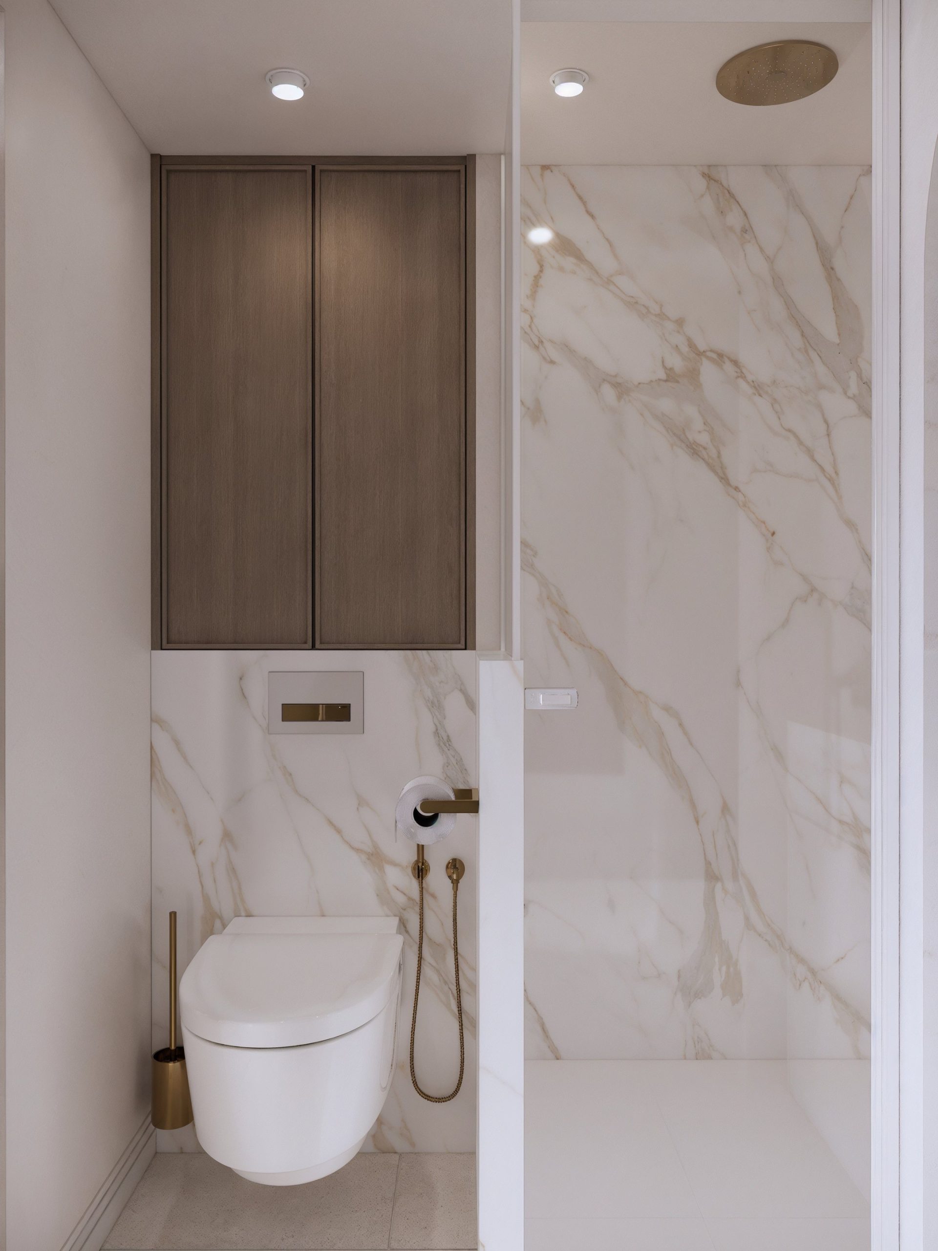 Custom-built architectural furniture defines the interiors: storage units, alcoves, integrated libraries, and wall compositions are designed as architectural features in their own right. Materiality plays a key role—veined marble, warm natural woods, mineral textures, and satin lacquers interact to create a dialogue between contrast and harmony. Natural light, softly diffused through large bay windows, is modulated and enhanced by these surfaces.