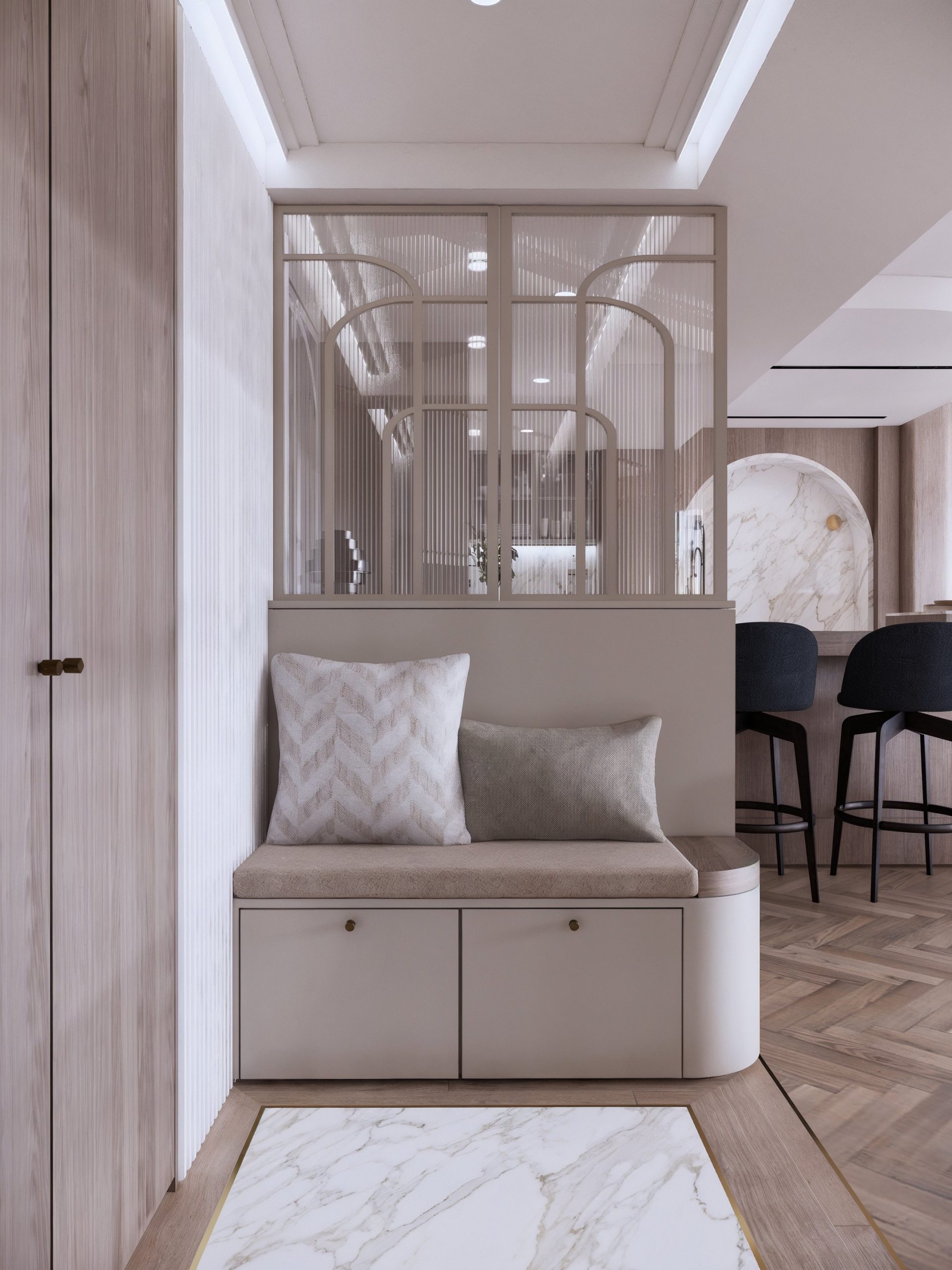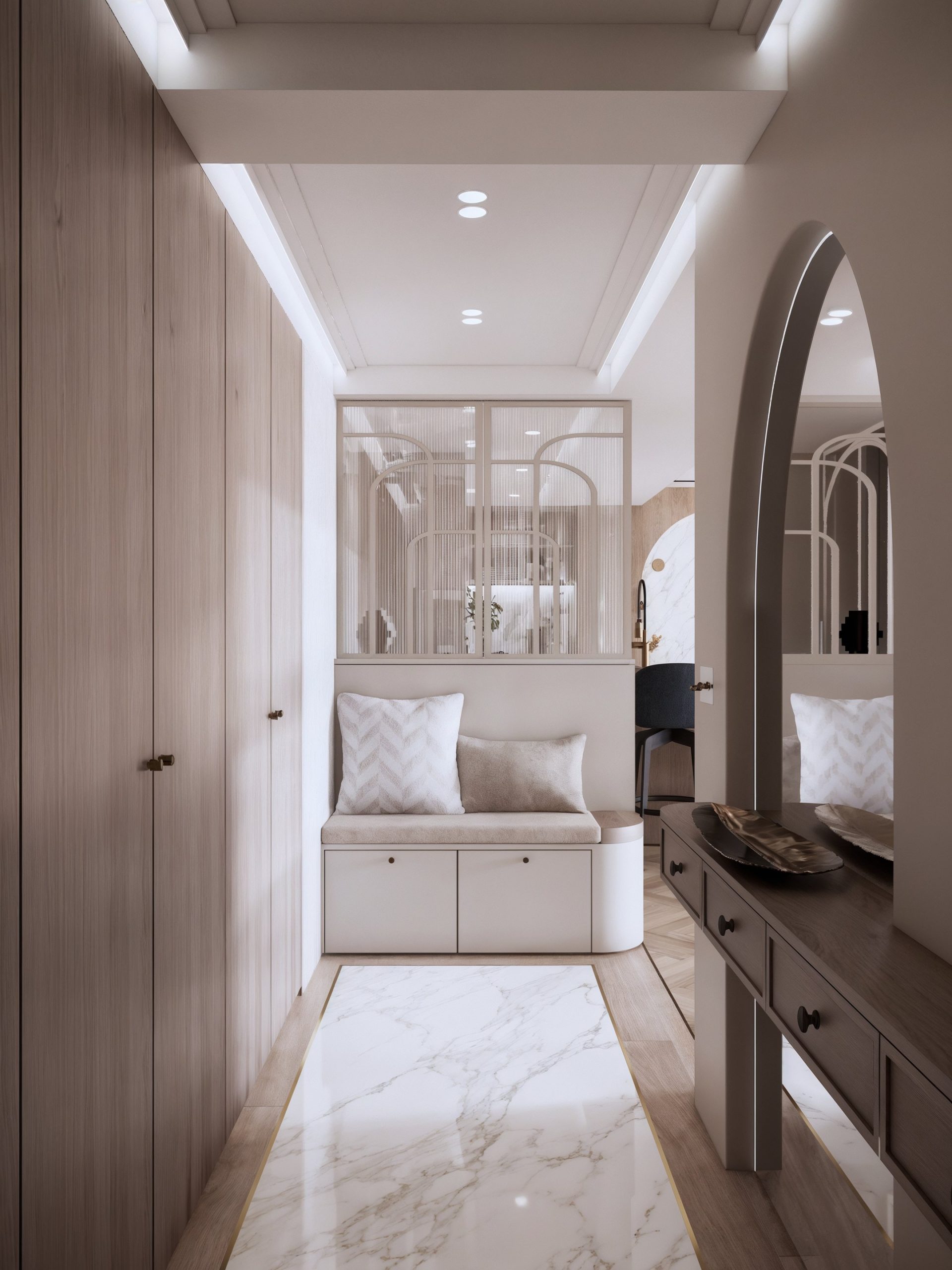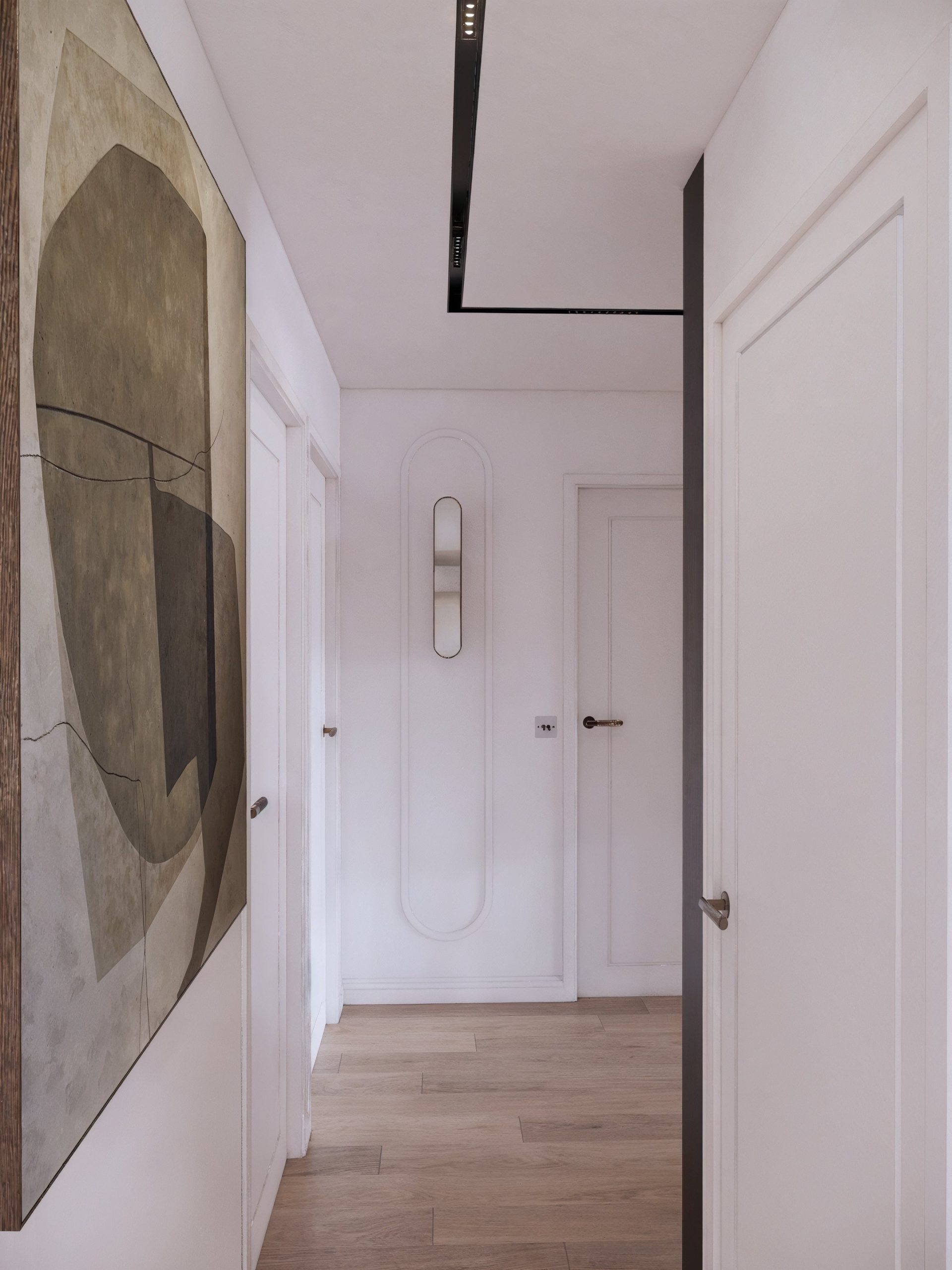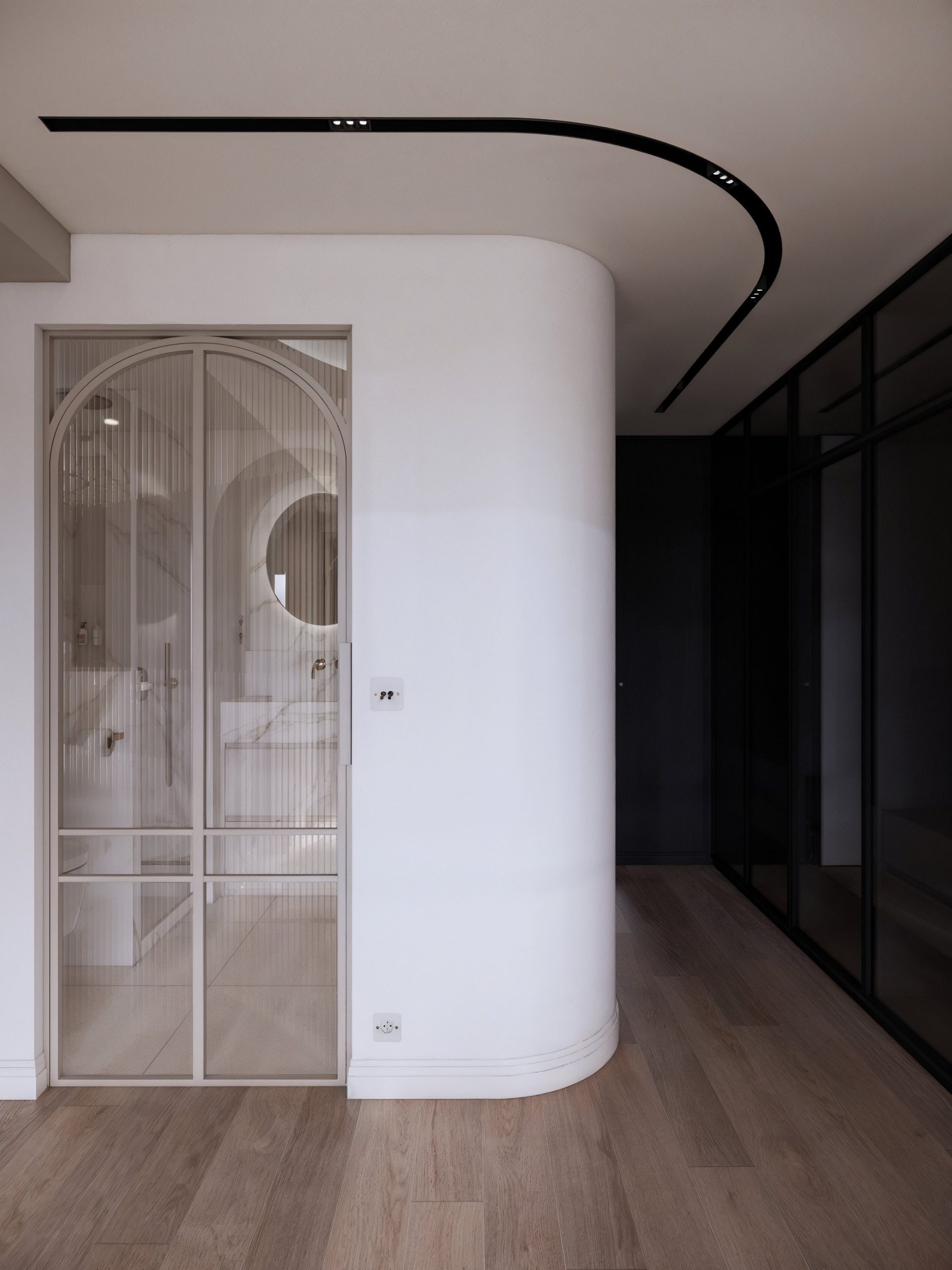 The original layout was entirely reimagined to create a fluid and coherent sequence of spaces. A central visual axis now structures the entire apartment, seamlessly linking the entrance, kitchen, and reception areas. The recurring use of curved lines is not ornamental—it serves to soften transitions, guide movement, and offer a rhythm that enhances the spatial narrative.