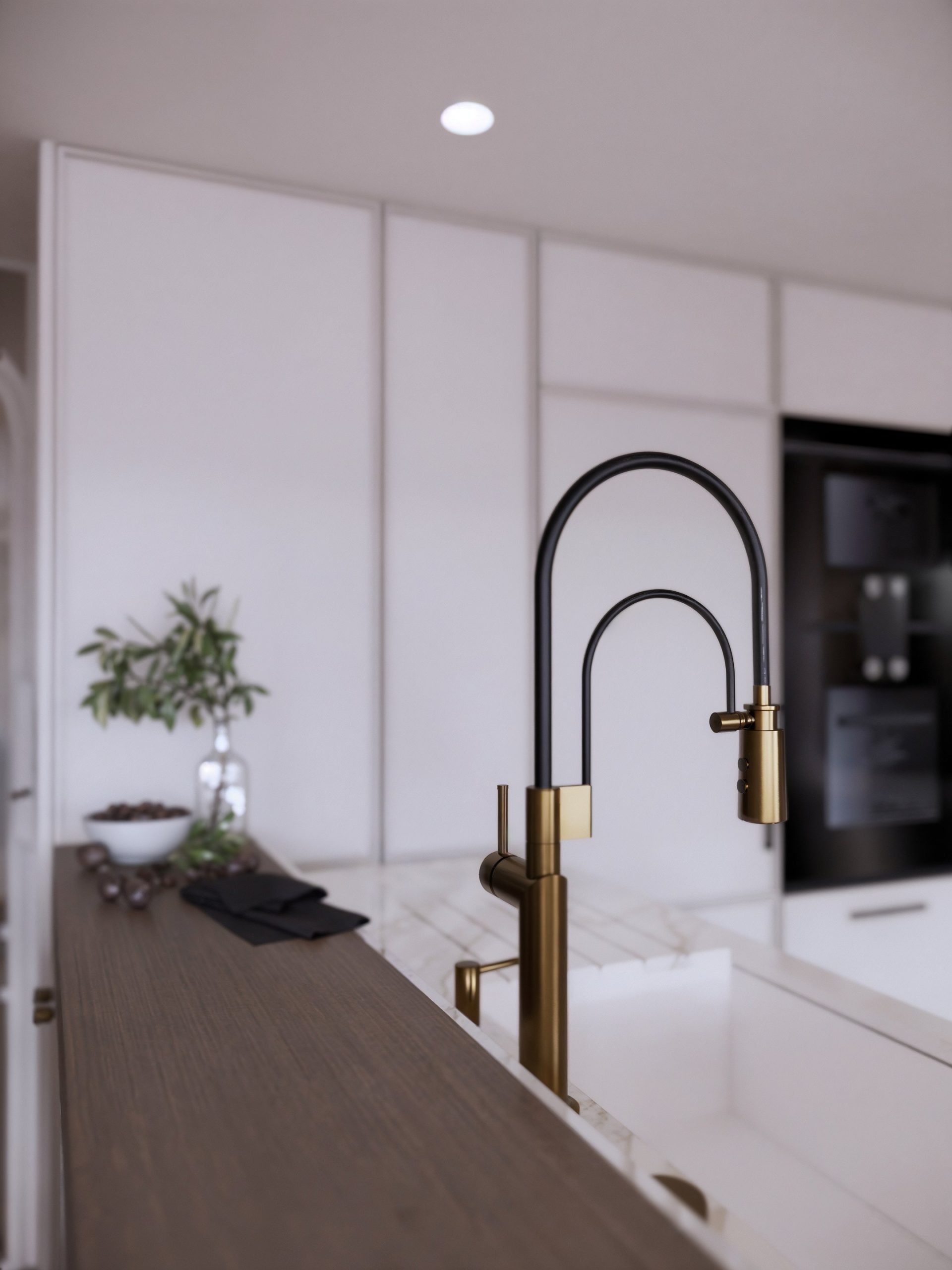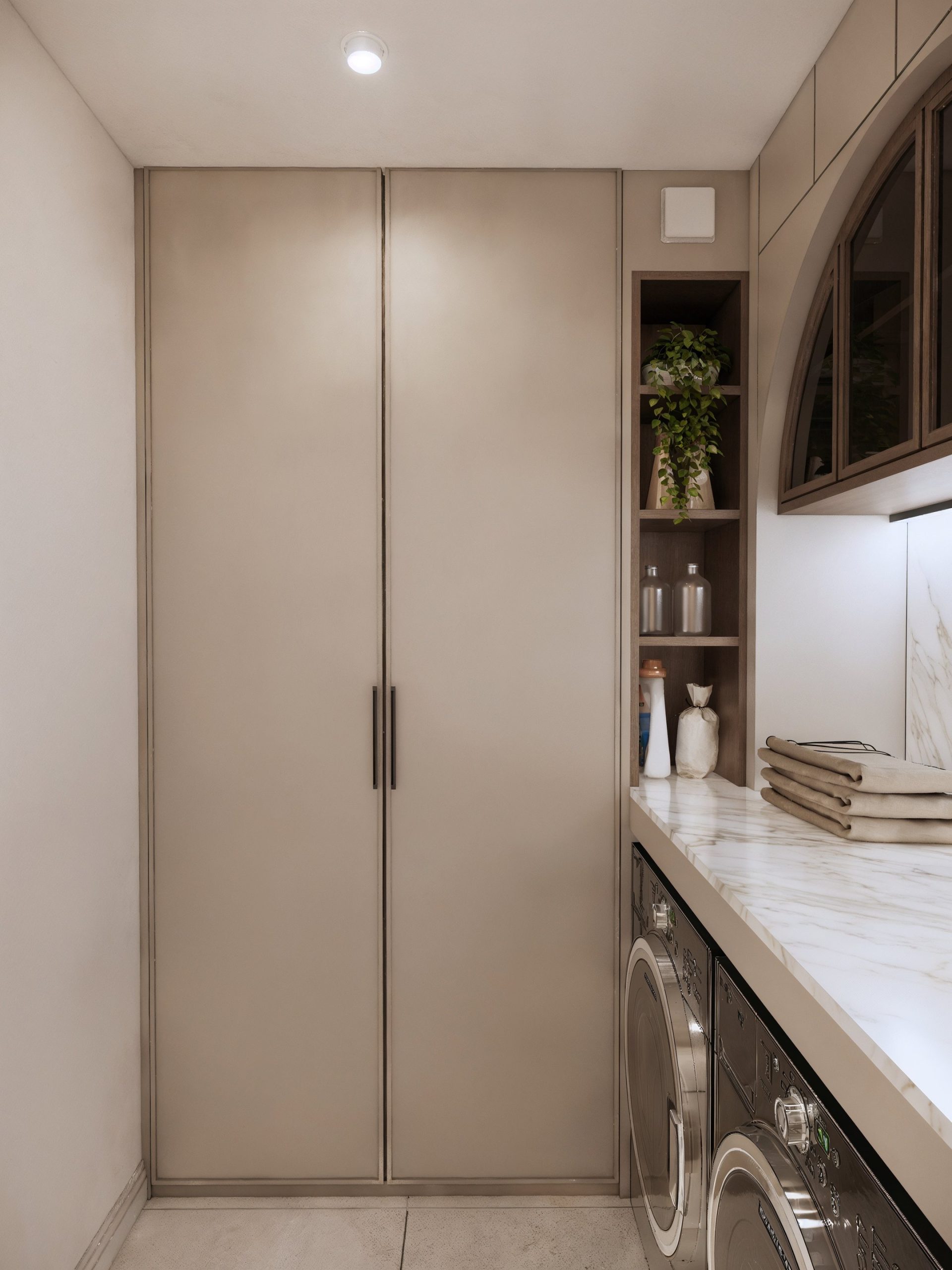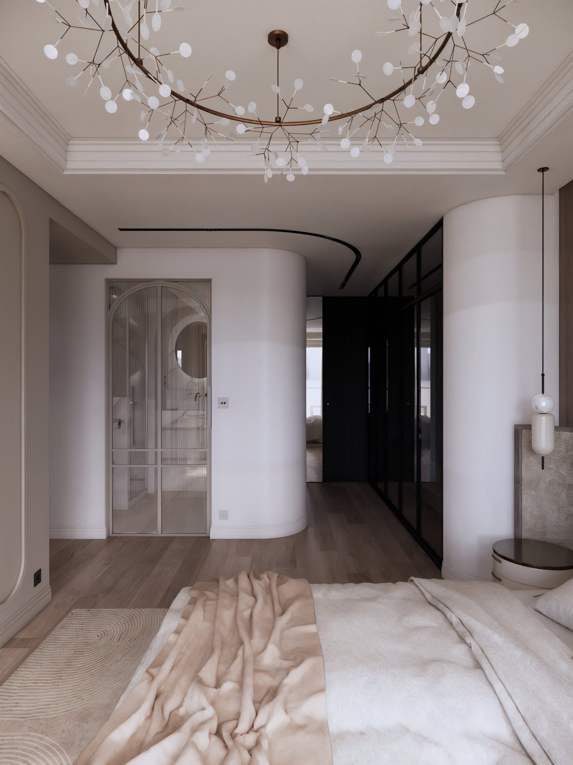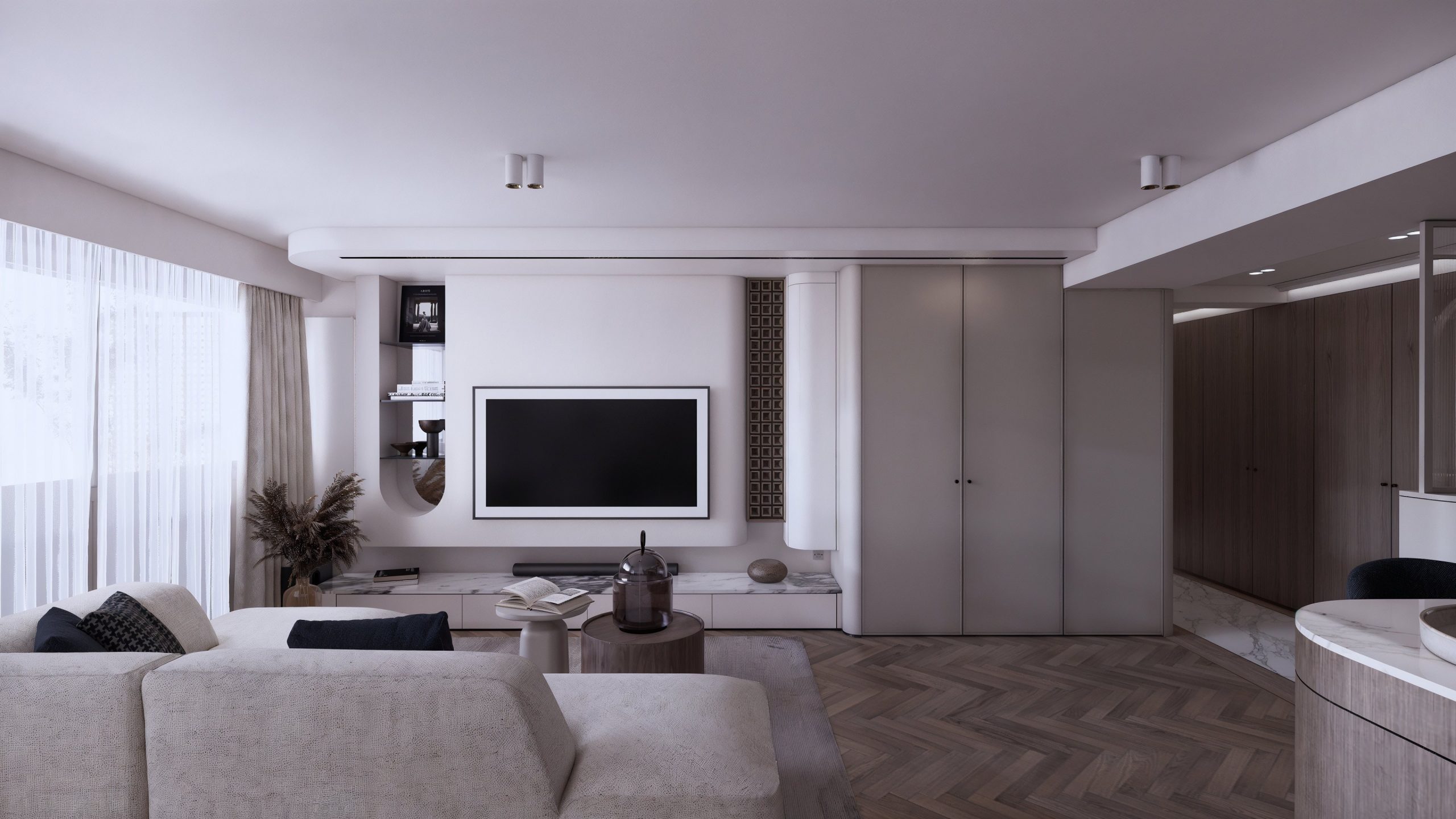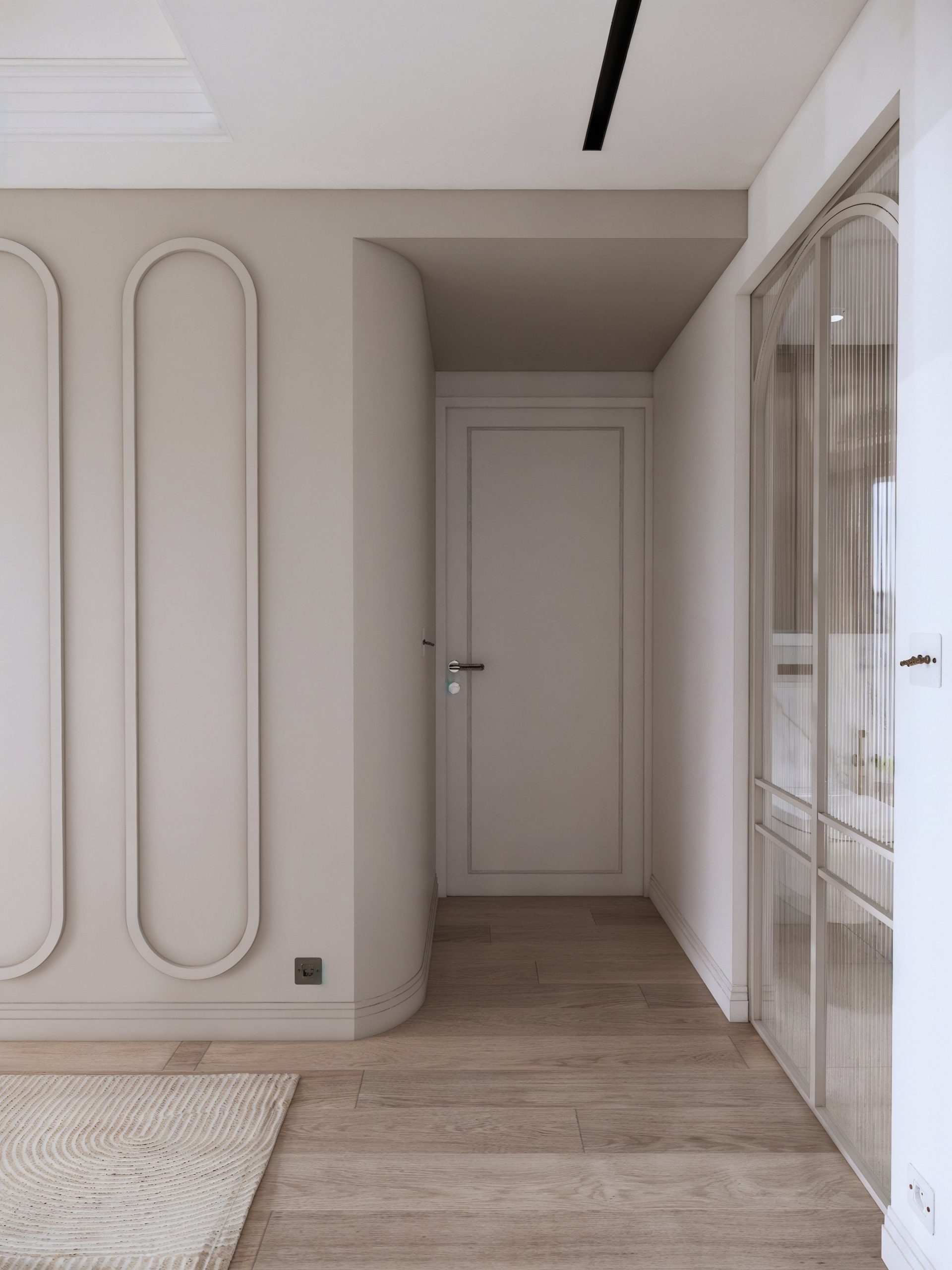 The original layout was entirely reimagined to create a fluid and coherent sequence of spaces. A central visual axis now structures the entire apartment, seamlessly linking the entrance, kitchen, and reception areas. The recurring use of curved lines is not ornamental—it serves to soften transitions, guide movement, and offer a rhythm that enhances the spatial narrative.