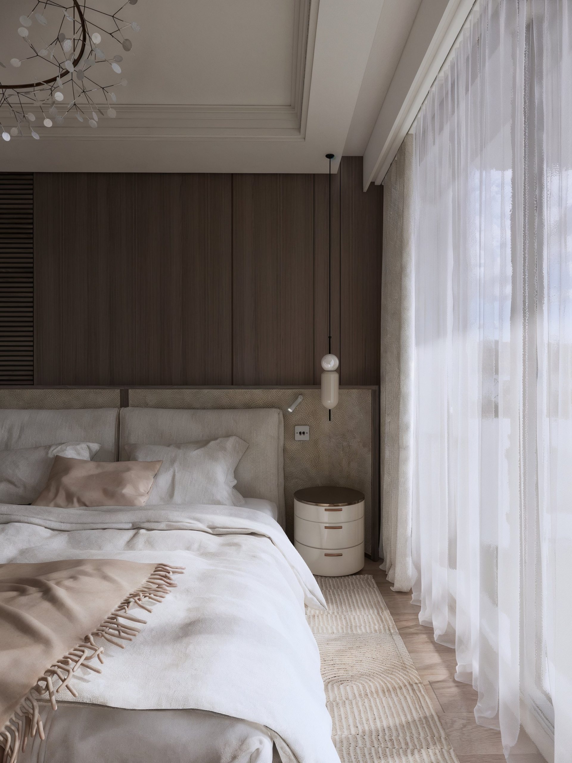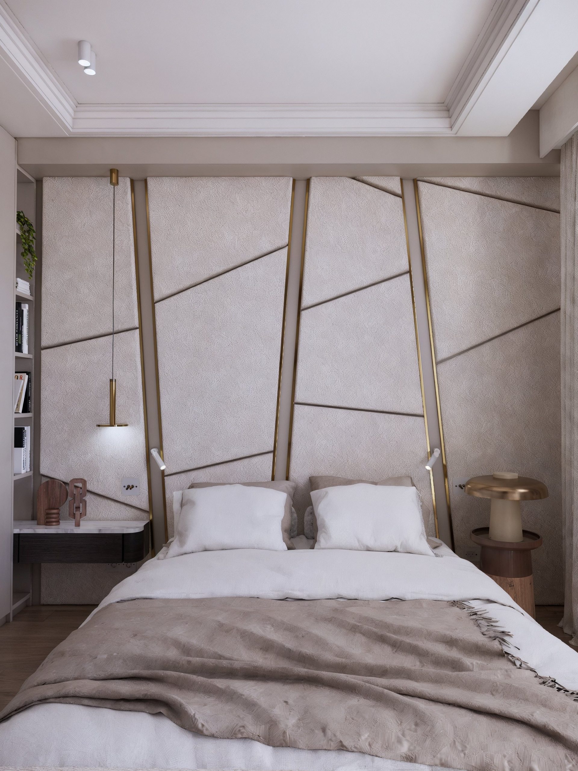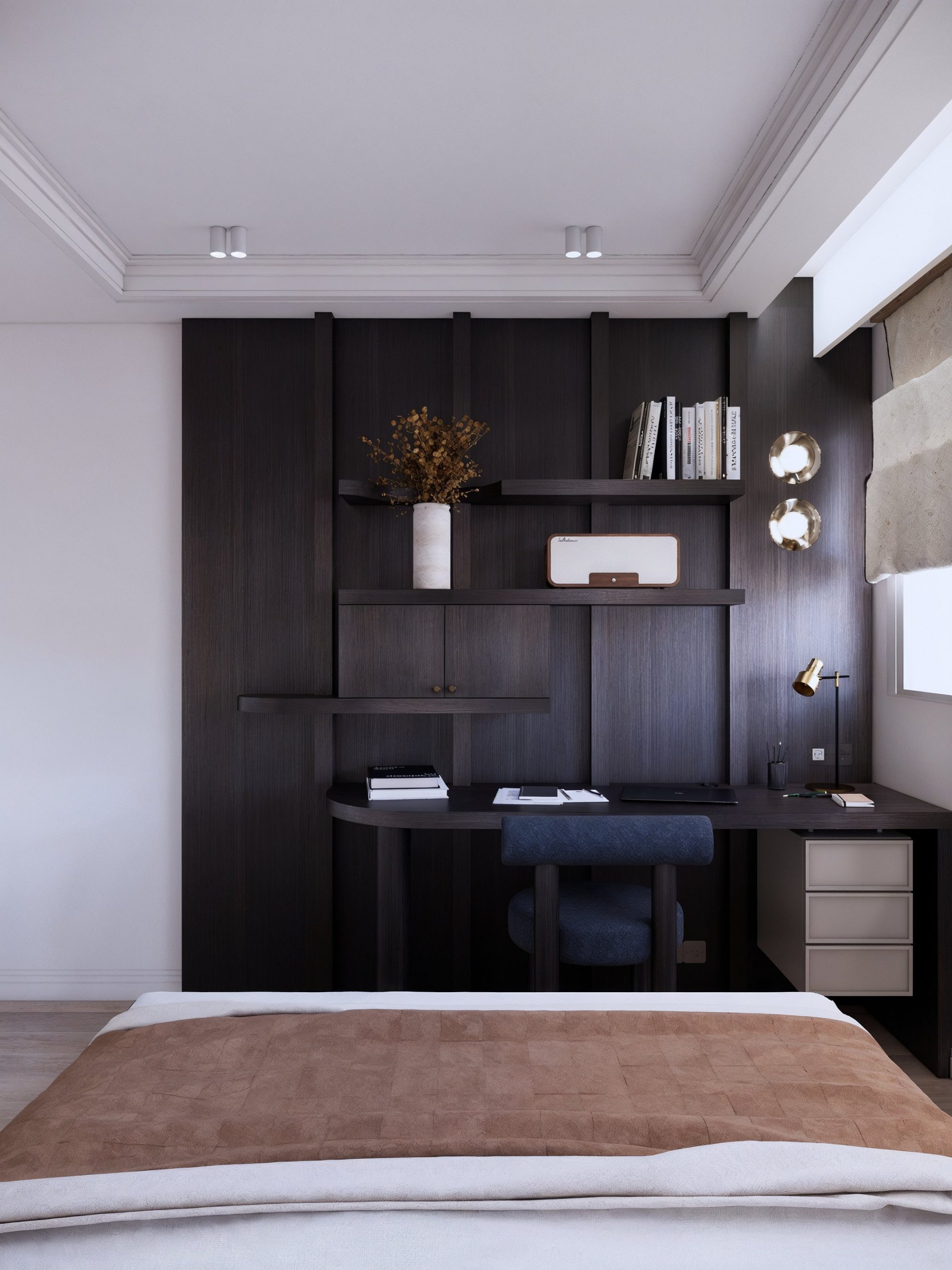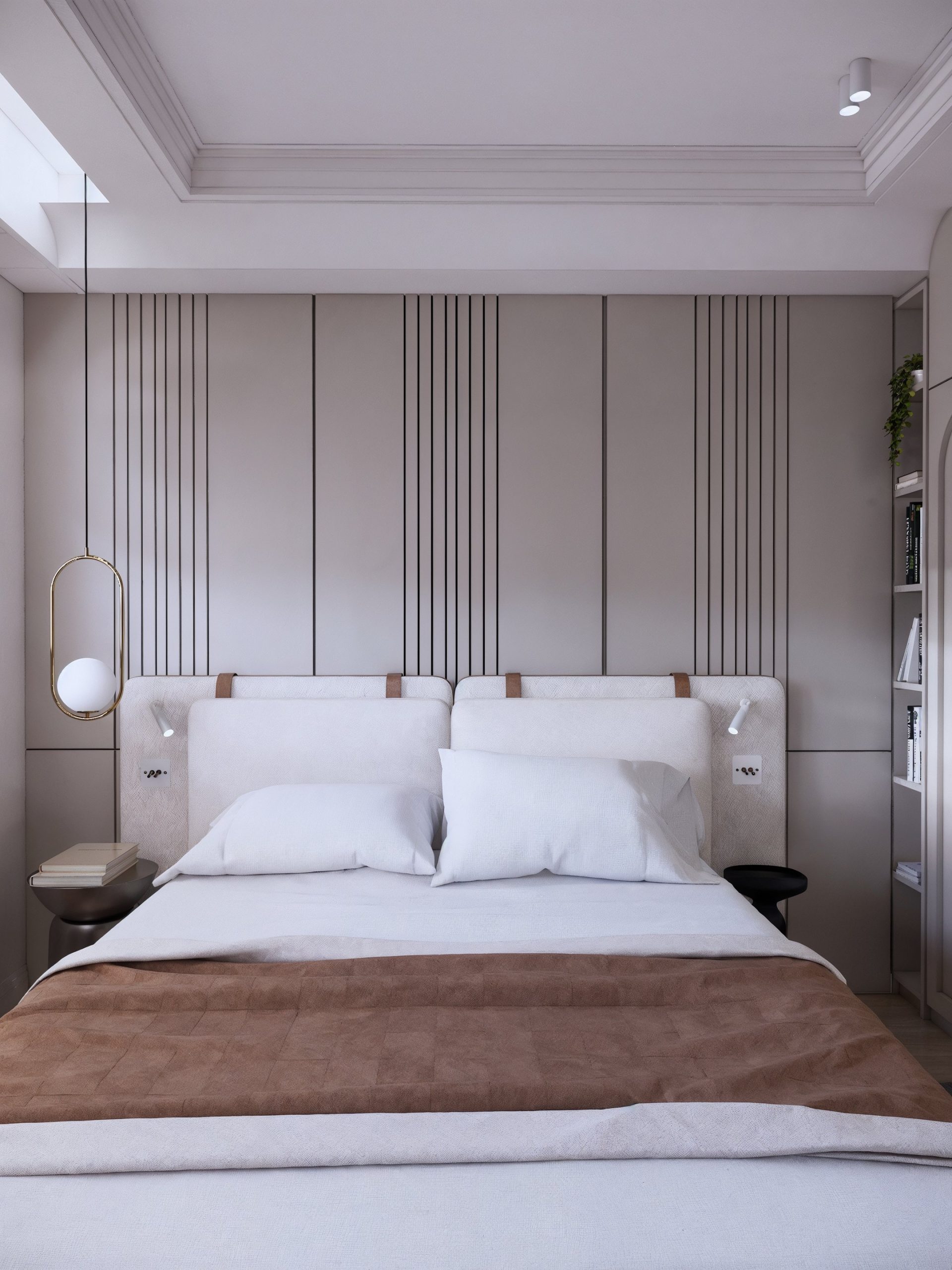 Dans les espaces privés, la recherche d’un confort enveloppant se traduit par l’usage de matériaux chaleureux et rassurants. Les têtes de lit deviennent éléments structurants. Les jeux d’épaisseur, les ombres portées, les rythmes verticaux renforcent cette logique de cadrage et de spatialisation.