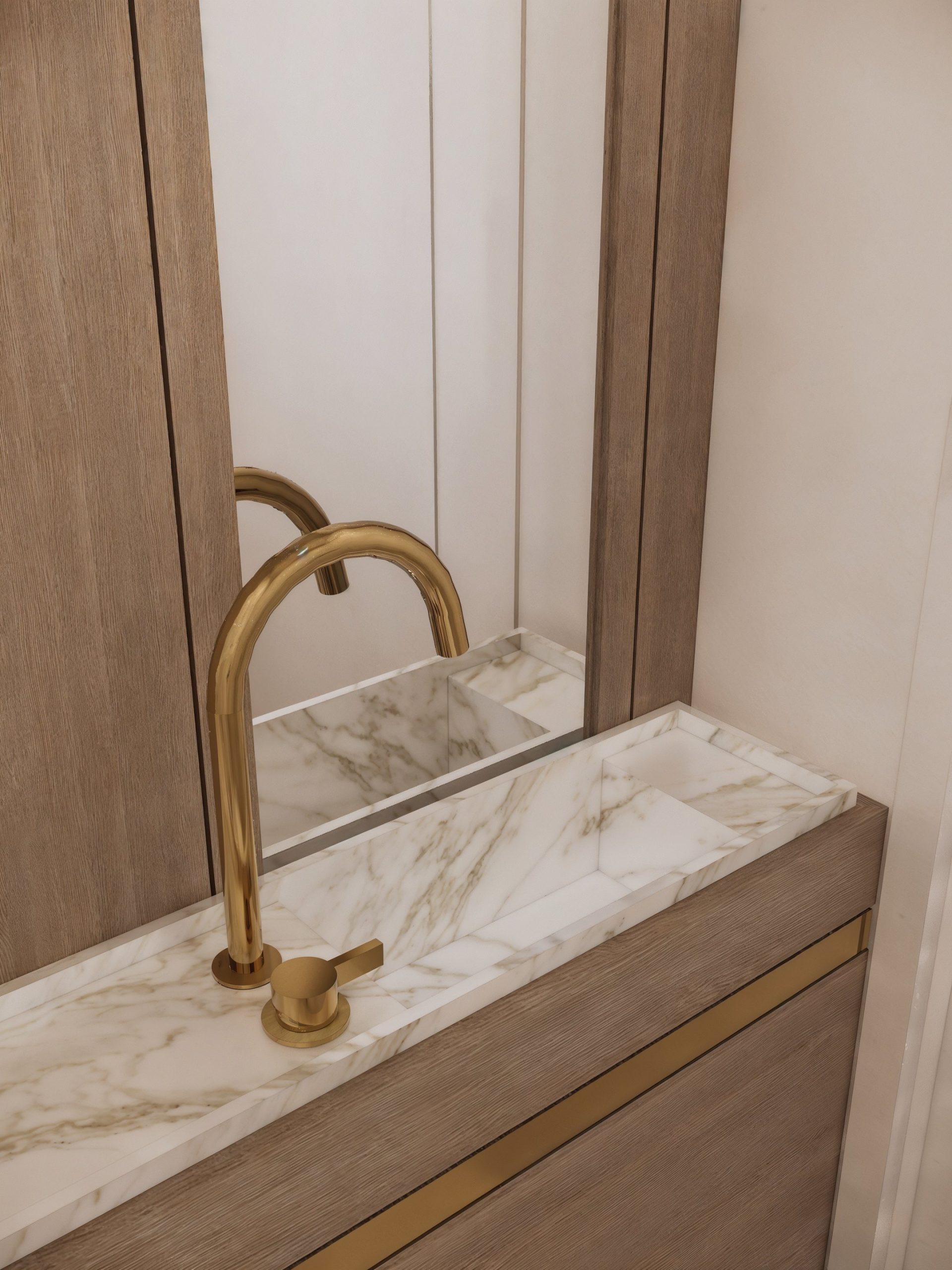 Le mobilier sur mesure – dressings, bibliothèques, alcôves, corniches – a été conçu comme un prolongement des murs eux-mêmes. Les matériaux utilisés s’inscrivent dans une logique de contraste maîtrisé : marbres veinés, bois naturel, enduits minéraux, laques satinées. Les textures jouent entre matité et brillance pour magnifier les lumières naturelles filtrées par les larges baies vitrées.