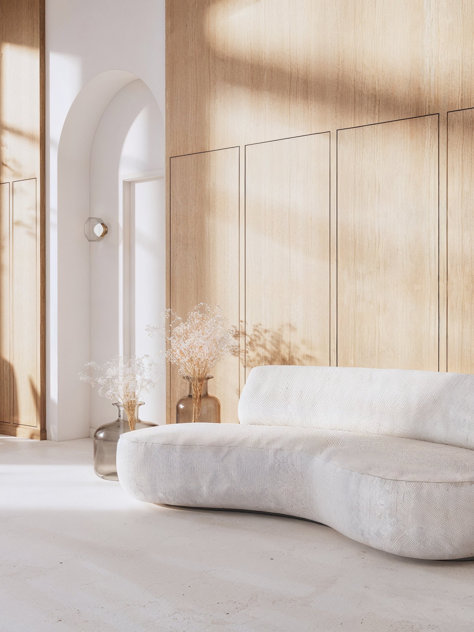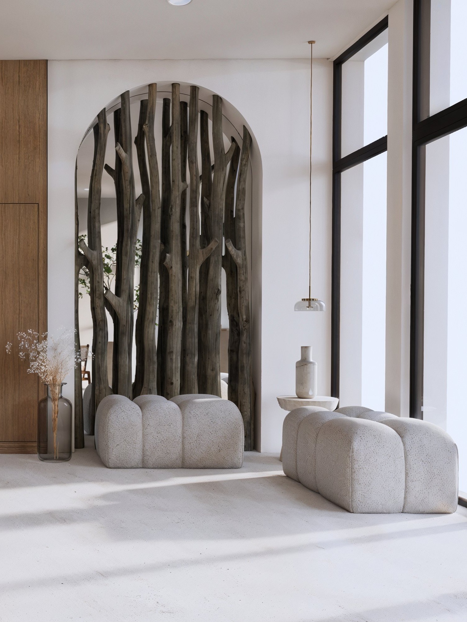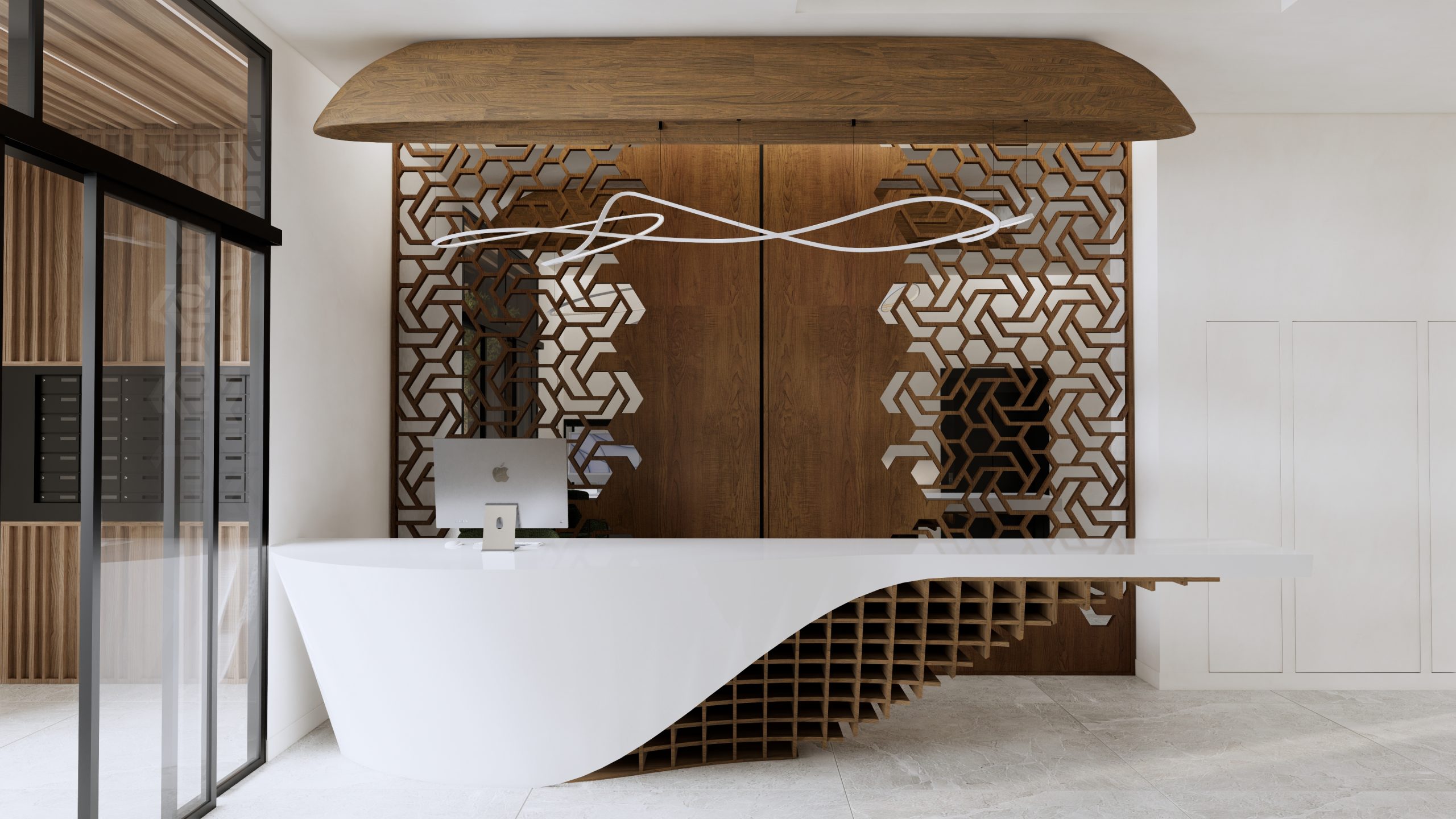 Notre réponse architecturale s’articule autour d’un vocabulaire sobre et statutaire, inspiré par l’hospitality. Les volumes sont apaisés, baignés de lumière, et rythmés par des arches qui structurent les perspectives et installent une sensation d’évidence. Les matières, elles, racontent le projet : un dialogue entre minéral clair, bois chaleureux et détails métalliques aux reflets doux, qui signent l’espace sans jamais le surcharger.