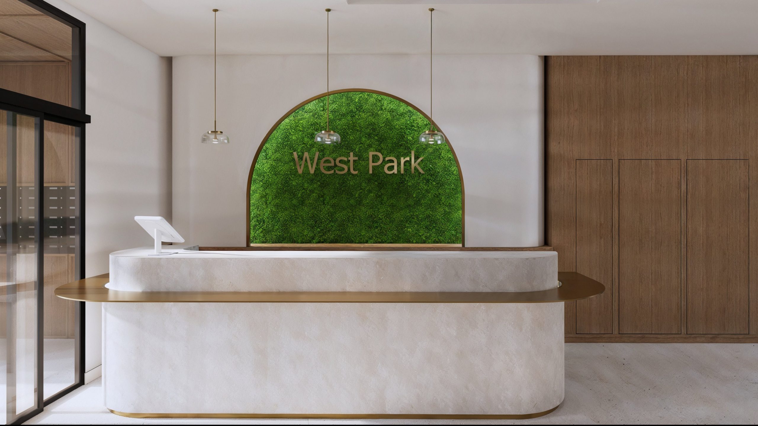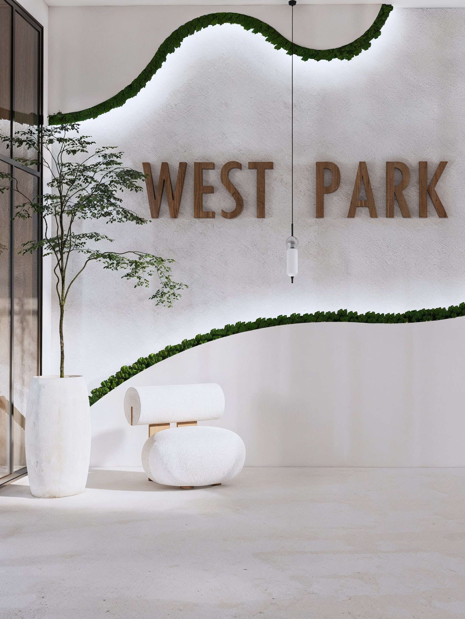 Dans les accueils, le comptoir devient une pièce maîtresse : une présence sculpturale, monolithique et fluide, associée à une arrière scène végétale portant le nom West Park — un repère visuel immédiat, à la fois vivant et élégant. La signalétique s’intègre à l’architecture, avec une typographie discrète et des repères de halls traités comme des éléments de composition.