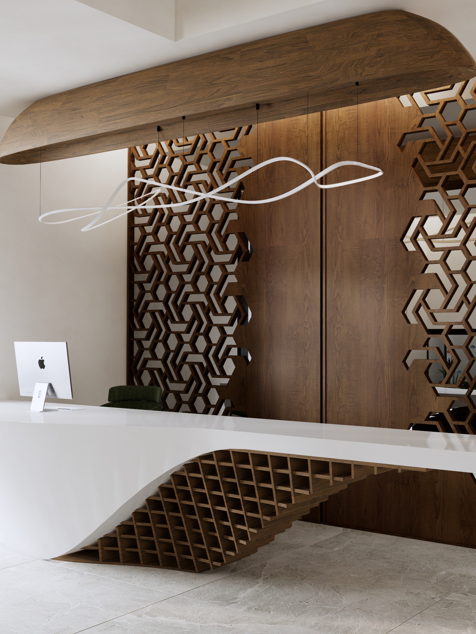 Les salons d’attente prolongent cette intention : assises organiques, tables minérales, végétalisation ponctuelle et lumière délicate composent des zones de respiration, conçues pour patienter, échanger, ou simplement marquer une transition. Enfin, certains filtres et parois travaillées — claustras, trames graphiques, menuiseries toute hauteur — apportent profondeur, intimité et texture, tout en assurant une cohérence d’ensemble d’un bâtiment à l’autre.